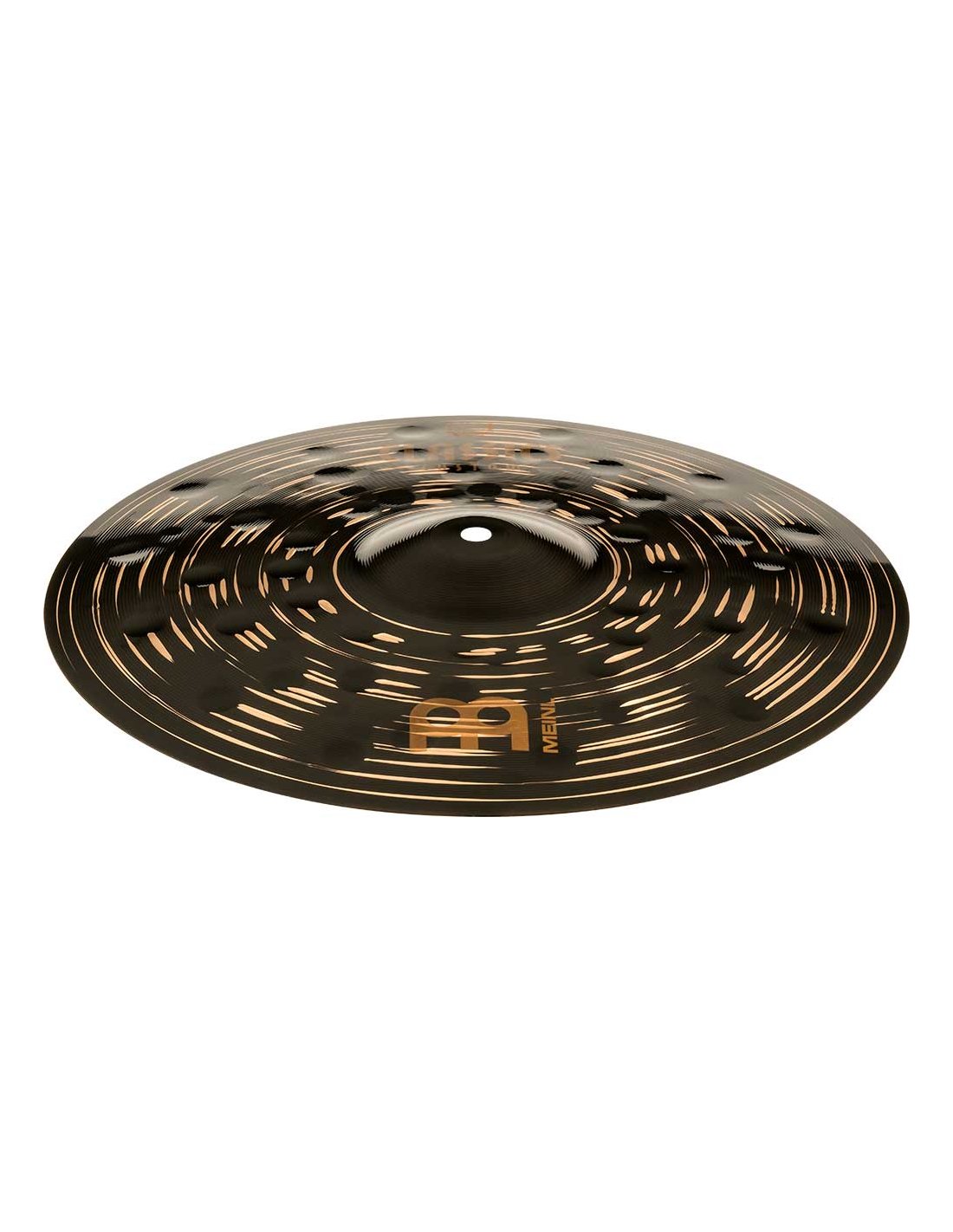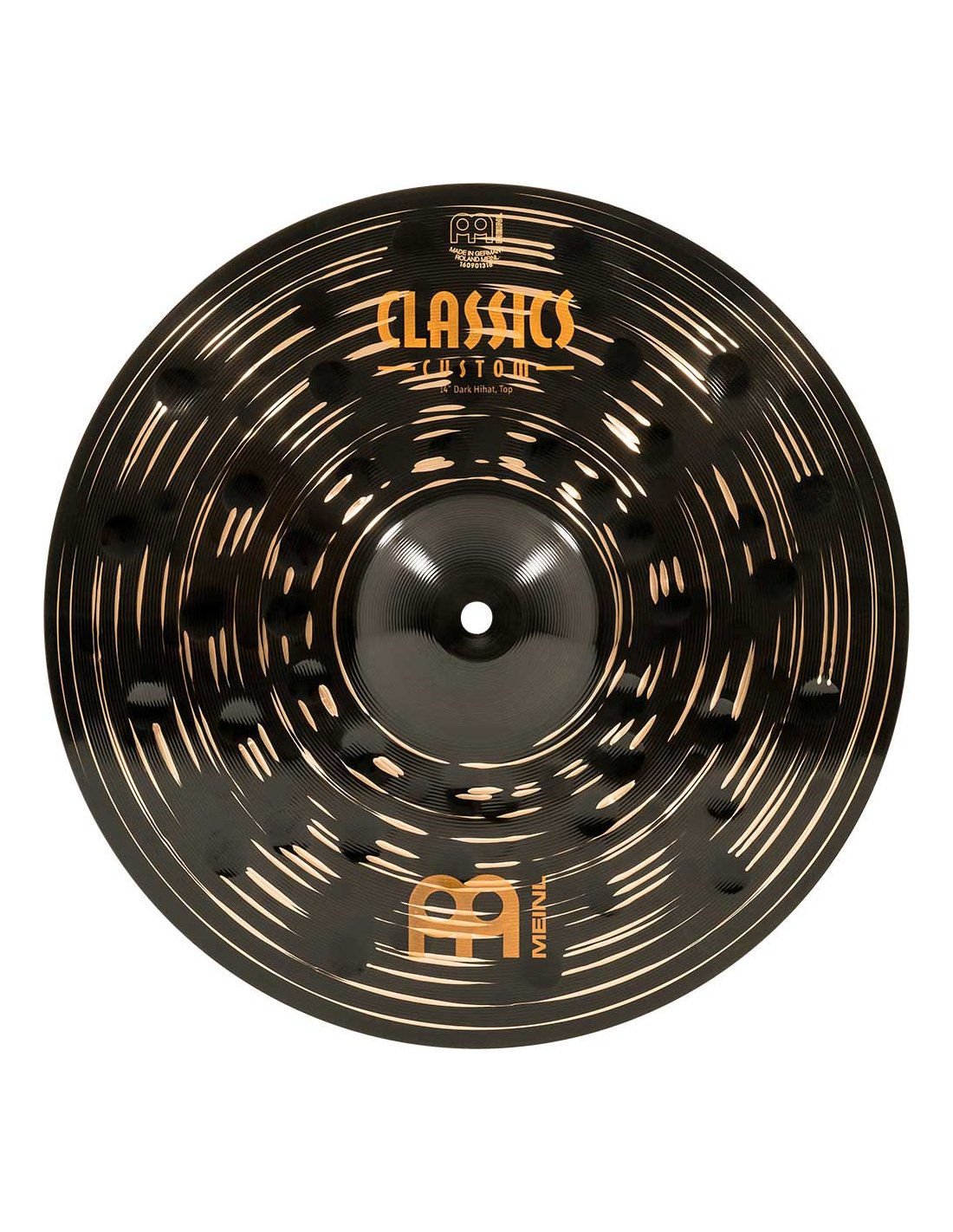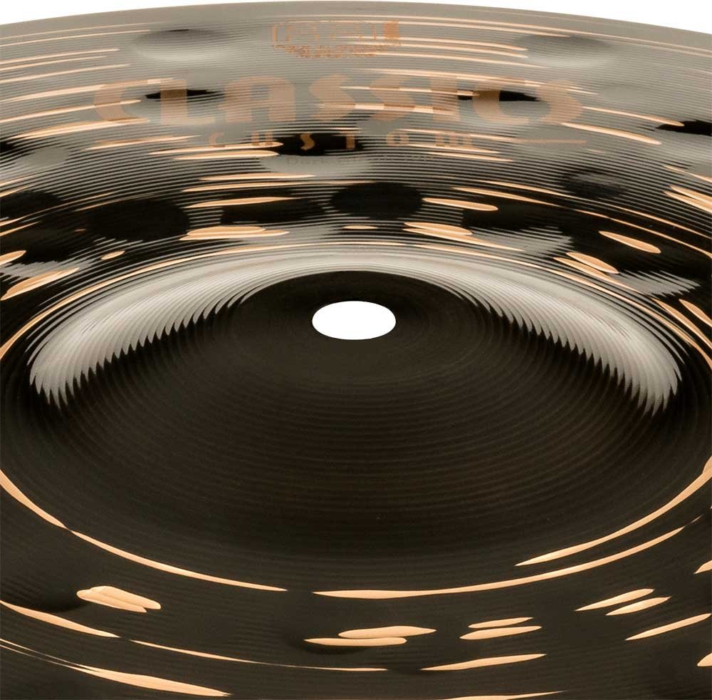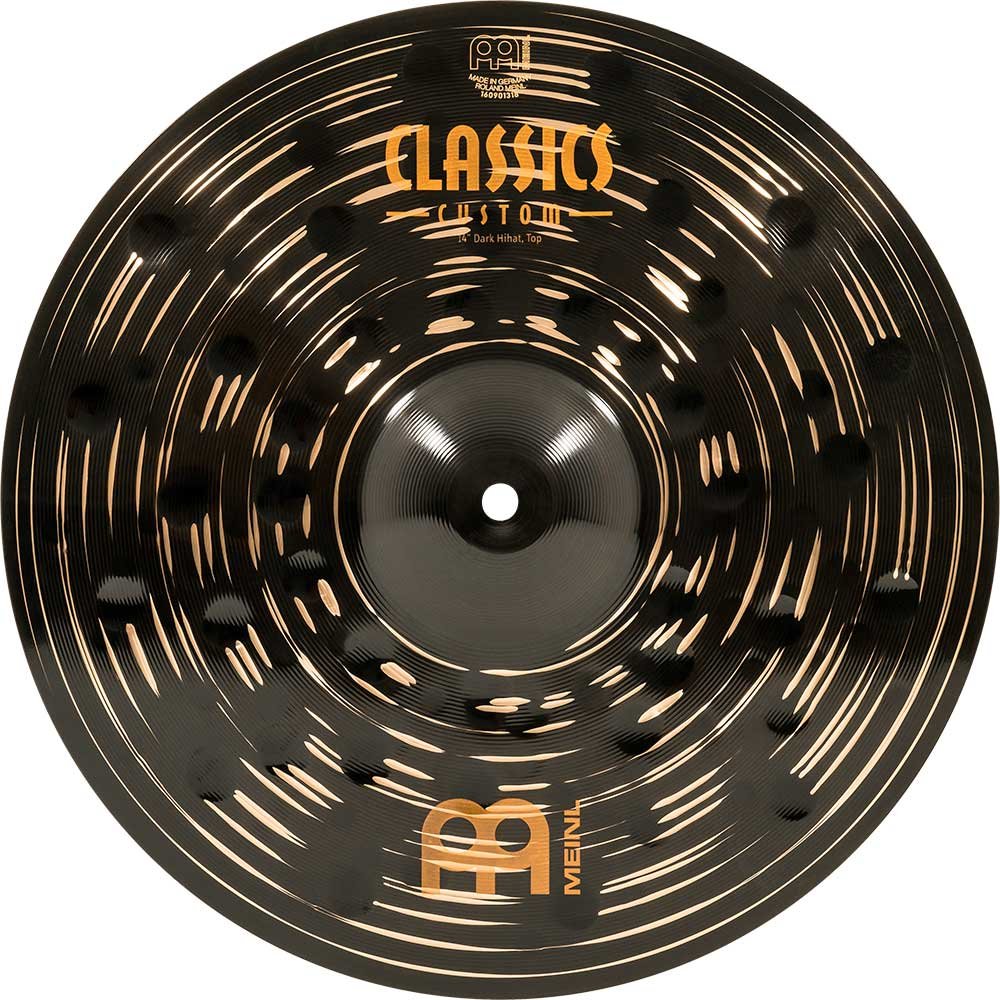 'Hi-hat 14'''' Serie Classics Custom Dark. Die Becken der Serie Classics Custom Dark werden mechanisch in Deutschland aus B10-Legierung hergestellt. Der Prozess umfasst verschiedene Techniken, sowohl Pressen als auch computergestütztes Hämmern. Darüber hinaus haben sie eine glänzende schwarze Oberfläche, die ihnen ein spektakuläres Aussehen und einen besonderen Klang verleiht.