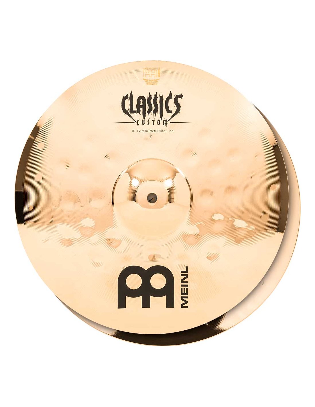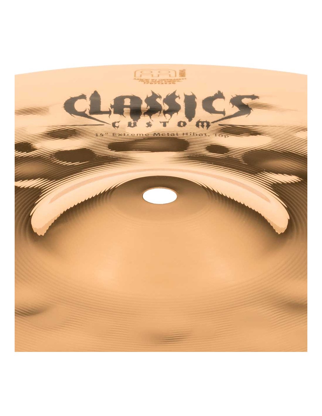 'Hi-hat 14'', Serie Classics Custom Extreme Metal. Die Becken der Serie Classics Custom Extreme Metal werden mechanisch in Deutschland aus einer B10-Legierung hergestellt und haben ein etwas höheres Gewicht als die Classics Custom, was ihnen eine wirklich große Power verleiht. Der Prozess umfasst verschiedene Techniken, sowohl Pressen als auch computergestütztes Hämmern. Darüber hinaus erhalten sie eine glänzende Lackierung, die ihnen ein spektakuläres, glänzendes Finish verleiht.