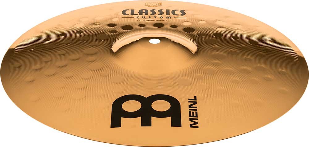 'Hi-hat 14'' Medium, Serie Classics Custom. Die Becken der Serie Classics Custom werden mechanisch in Deutschland aus einer B10-Legierung hergestellt. Der Prozess umfasst verschiedene Techniken, sowohl Pressen als auch computergestütztes Hämmern. Darüber hinaus erhalten sie eine glänzende Lackierung, die ihnen ein spektakuläres, glänzendes Finish verleiht.