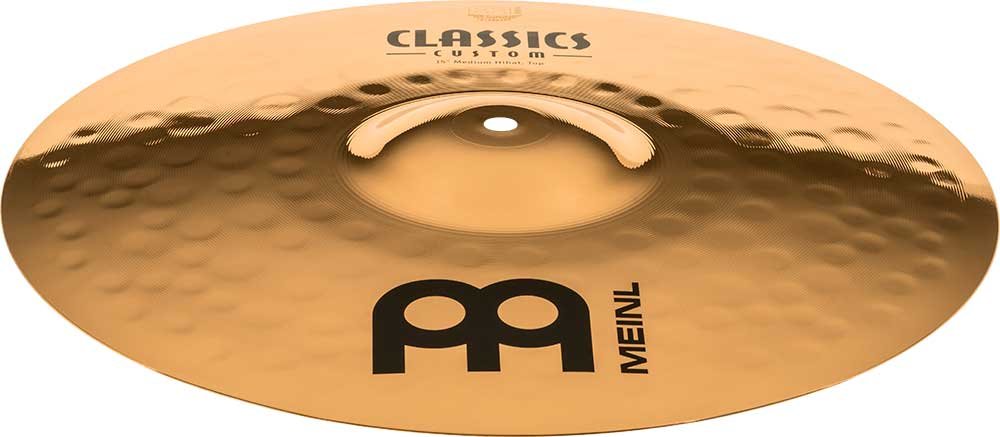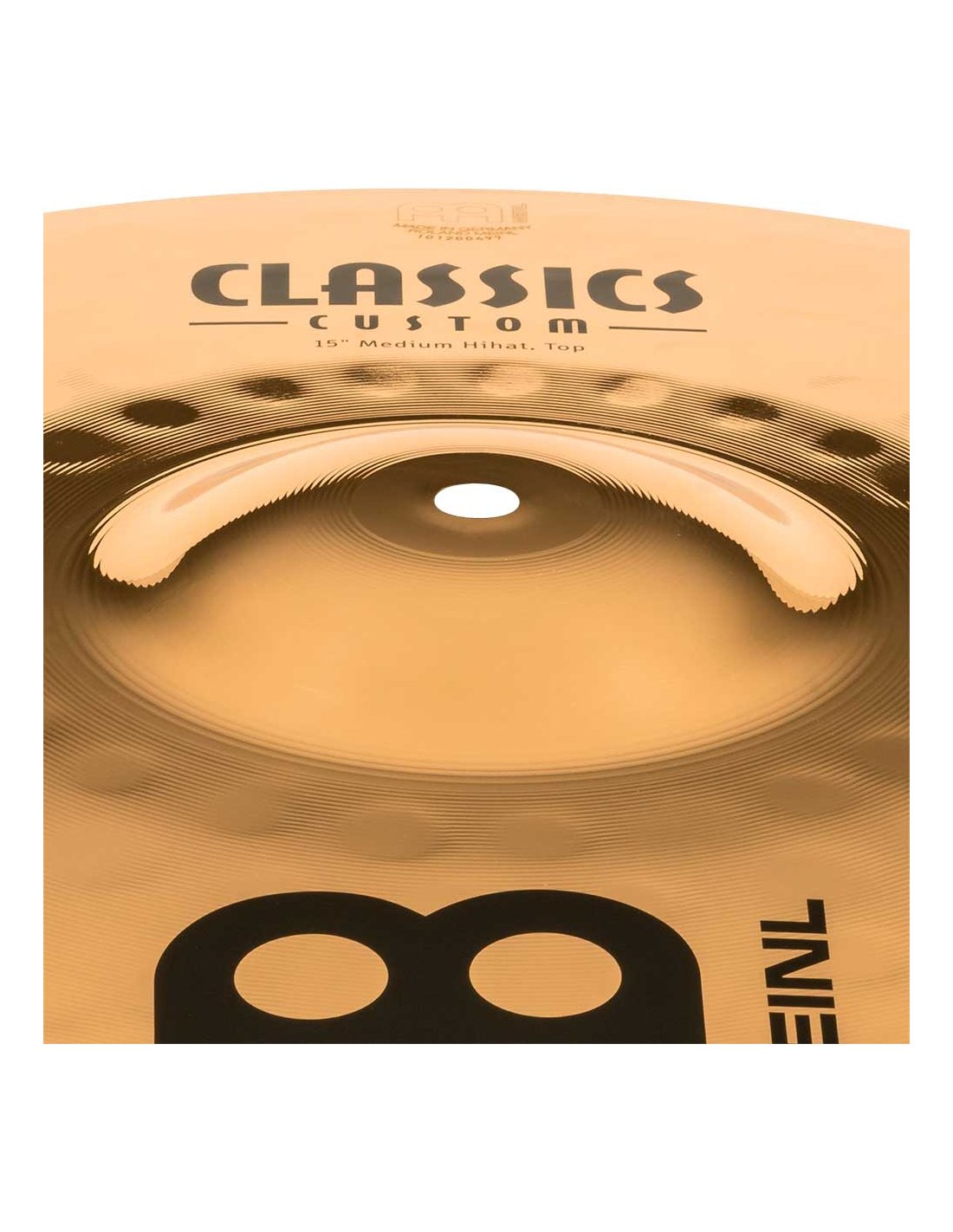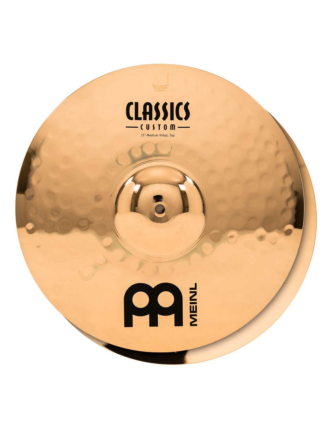 'Hi-hat 15'' Medium, Serie Classics Custom. Die Becken der Serie Classics Custom werden mechanisch in Deutschland aus einer B10-Legierung hergestellt. Der Prozess umfasst verschiedene Techniken, sowohl Pressen als auch computergestütztes Hämmern. Darüber hinaus erhalten sie eine glänzende Lackierung, die ihnen eine spektakuläre glänzende Oberfläche verleiht.