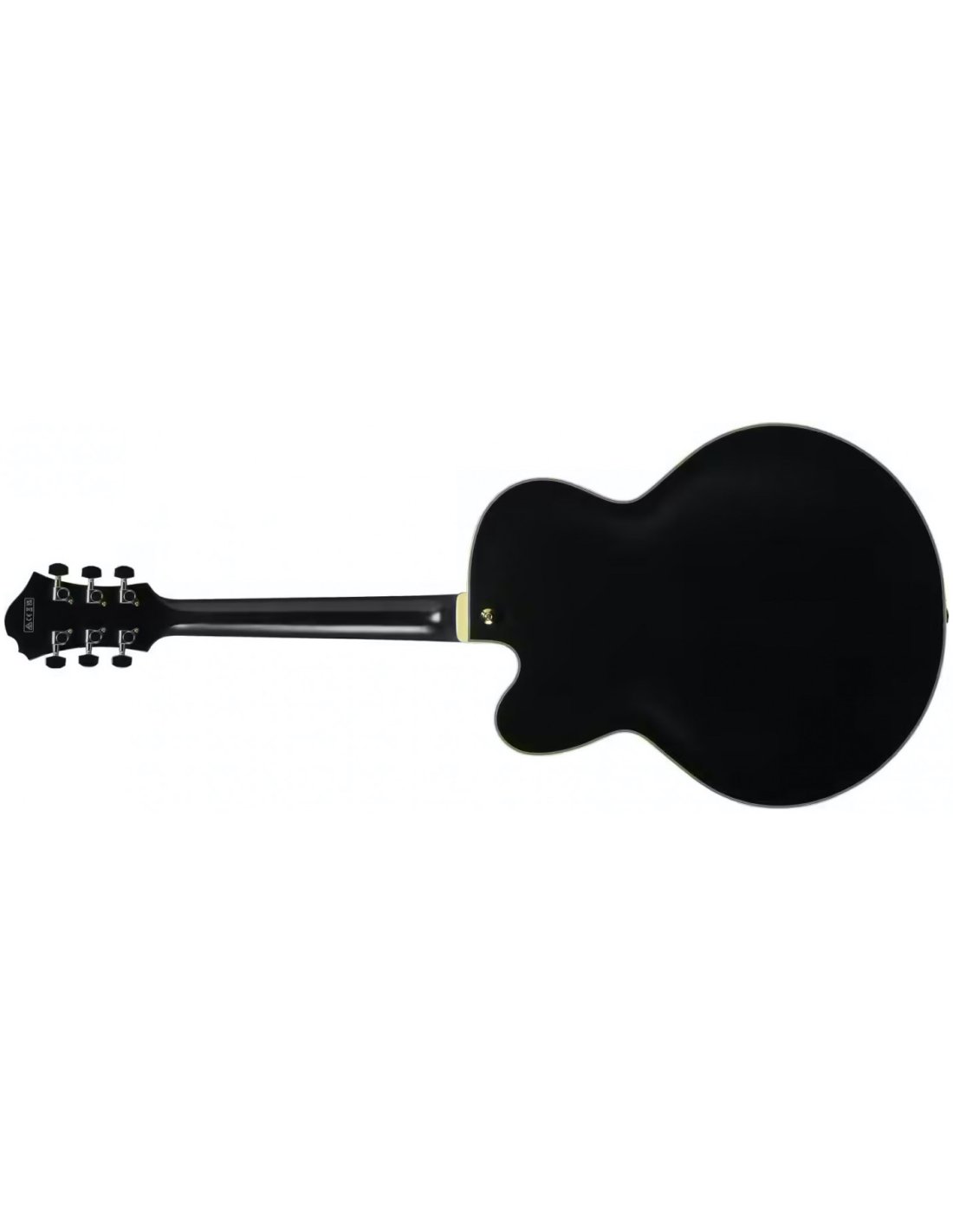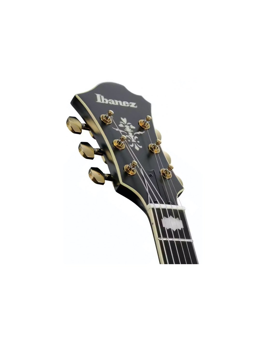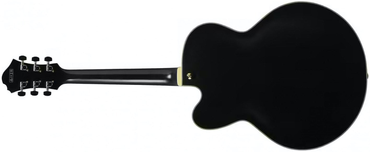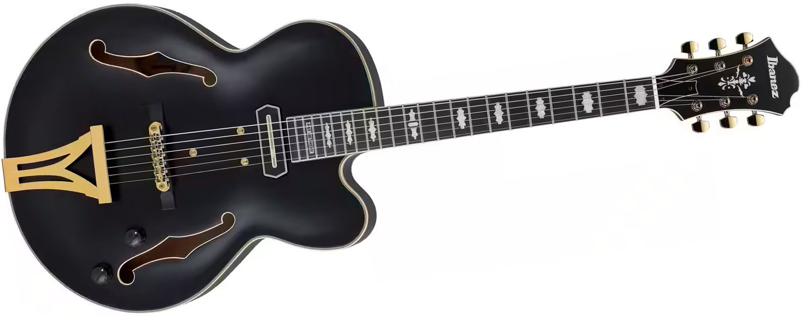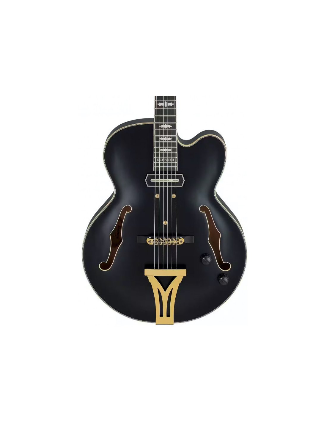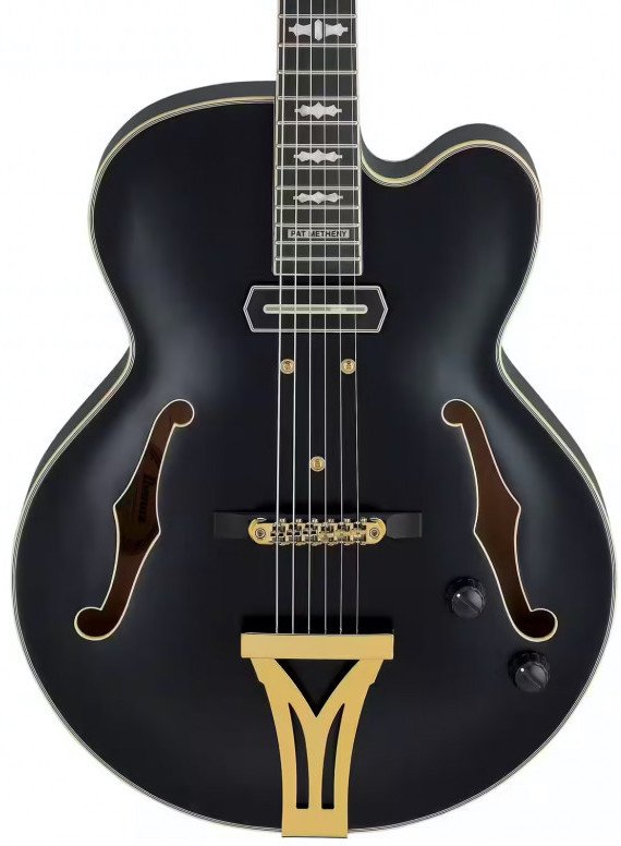 IBANEZ PM3C-BKL ist eine Hollowbody-E-Gitarre, Serie Ibanez PM Pat Metheny Signature Modell Ibanez PM3C, mit einer Decke aus Fichte, Boden und Zargen aus Ahorn, PM set-in Hals aus 3 Teilen Ahorn/Nyatoh, Griffbrett aus gebundenem Ebenholz mit 12" Radius und 22 Medium Bünden mit Artstar Bundkante Behandlung und PM3C Acryl Einlage, Sattel aus 43mm Knochen, Titan Gold Hardware, gegossene Titan Gold Mechaniken und Gibraltar Performer Brücke mit VT200 Saitenhalter. Die Elektronik besteht aus 1 PM Special Passive/Ceramic Single-Coil Pickup am Hals, mit Master Volume und Master Tone Kontrolle. Inklusive Ibanez Hardshell Case