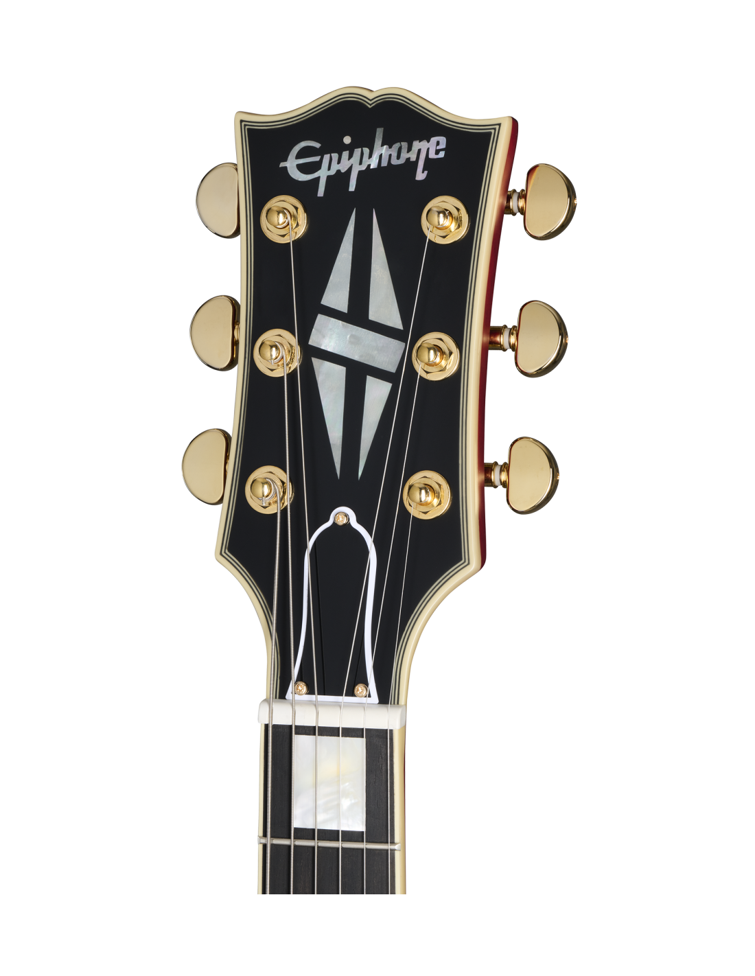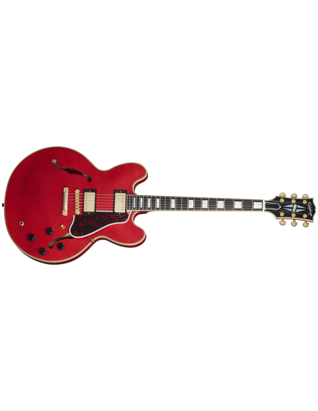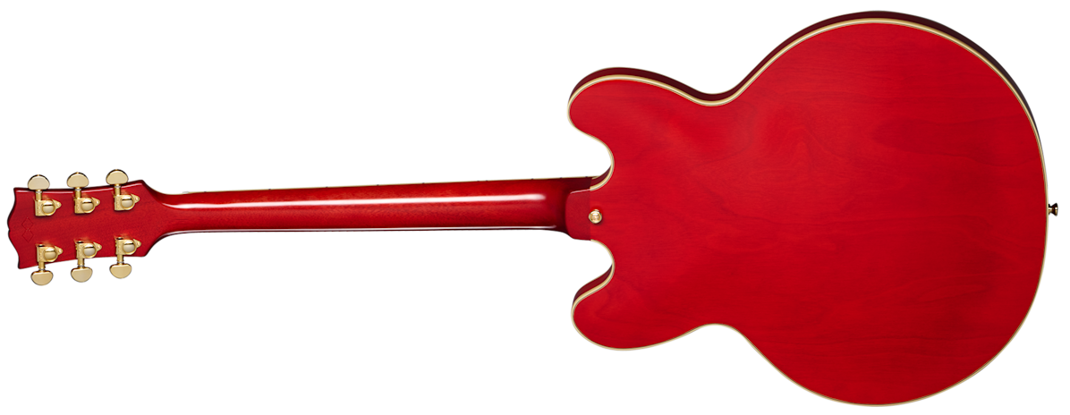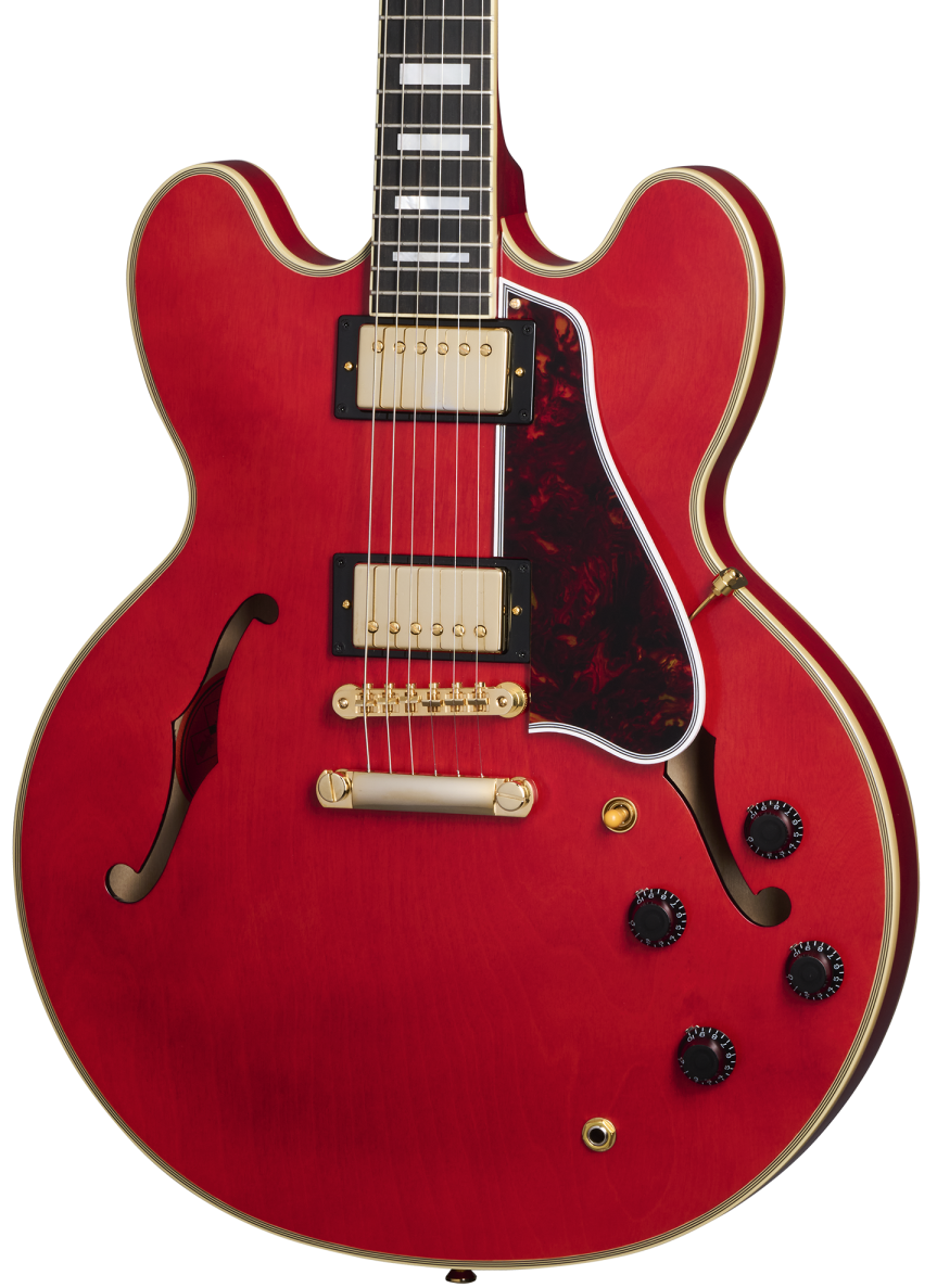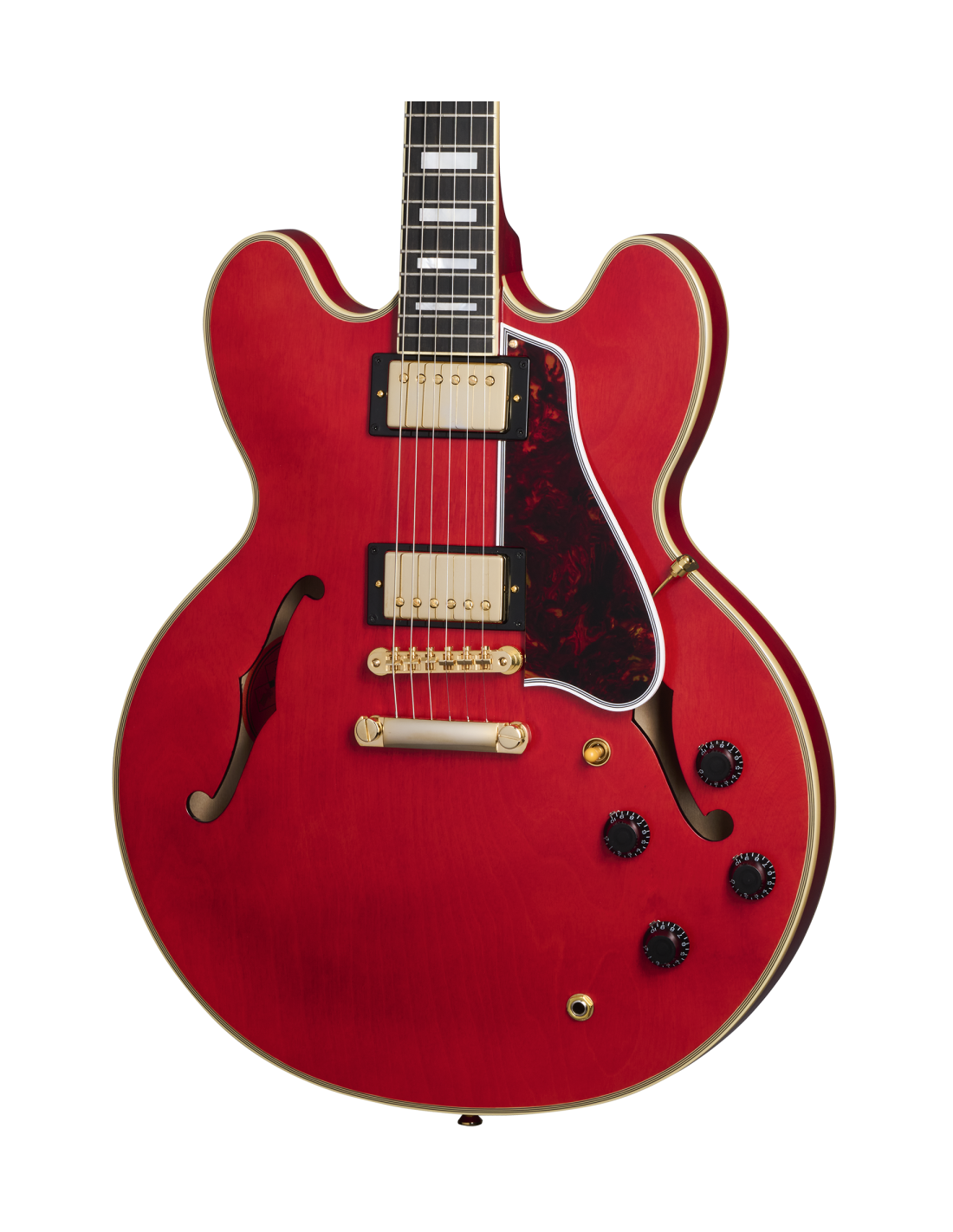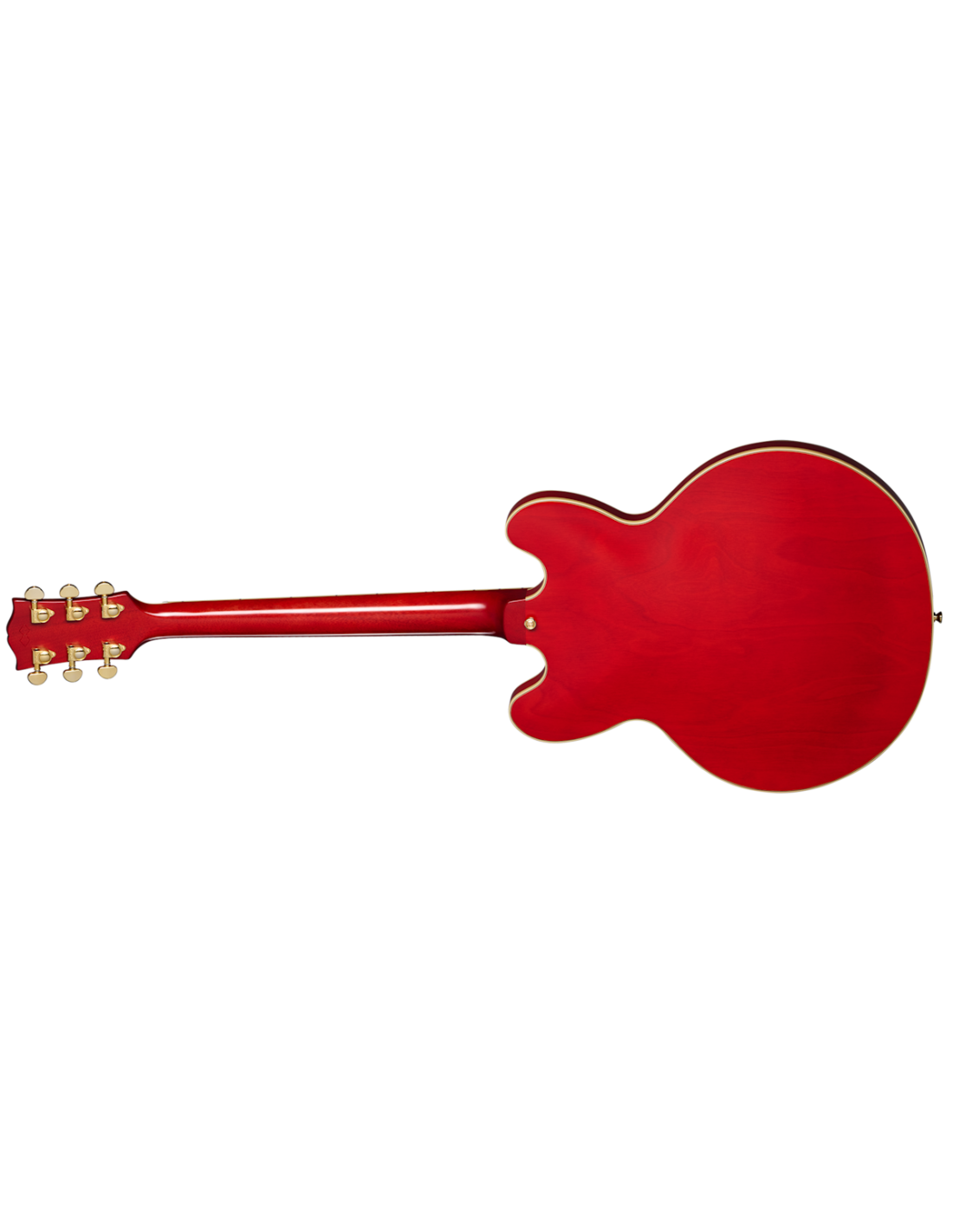 EPIPHONE 1959 ES-355 CHERRY ist eine semiakustische E-Gitarre, Serie 1959 ES-355 mit einem 5-lagigen laminierten Ahornkörper und einem zentralen Block aus Mahagoni, einem SlimTaper-Mahagonihals, einem 12" Radius aus Ebenholz mit 22 Medium Jumbo Bünden und Perlblockeinlagen, einem Graph Tech Sattel, Gold-Hardware, Grover Rotomatic Mechaniken und einem Tune-O-Matic Steg mit Maestro Vibrola Sattel. Die Elektronik in HH-Konfiguration besteht aus 2 Gibson Custombucker Humbuckern, mit 2 Lautstärke- und Tonreglern, einem 3-Wege Pickup-Wahlschalter von Switchcraft, CTS Potentiometern und Mallory Kondensatoren. Inklusive Epiphone Hardshell Case
