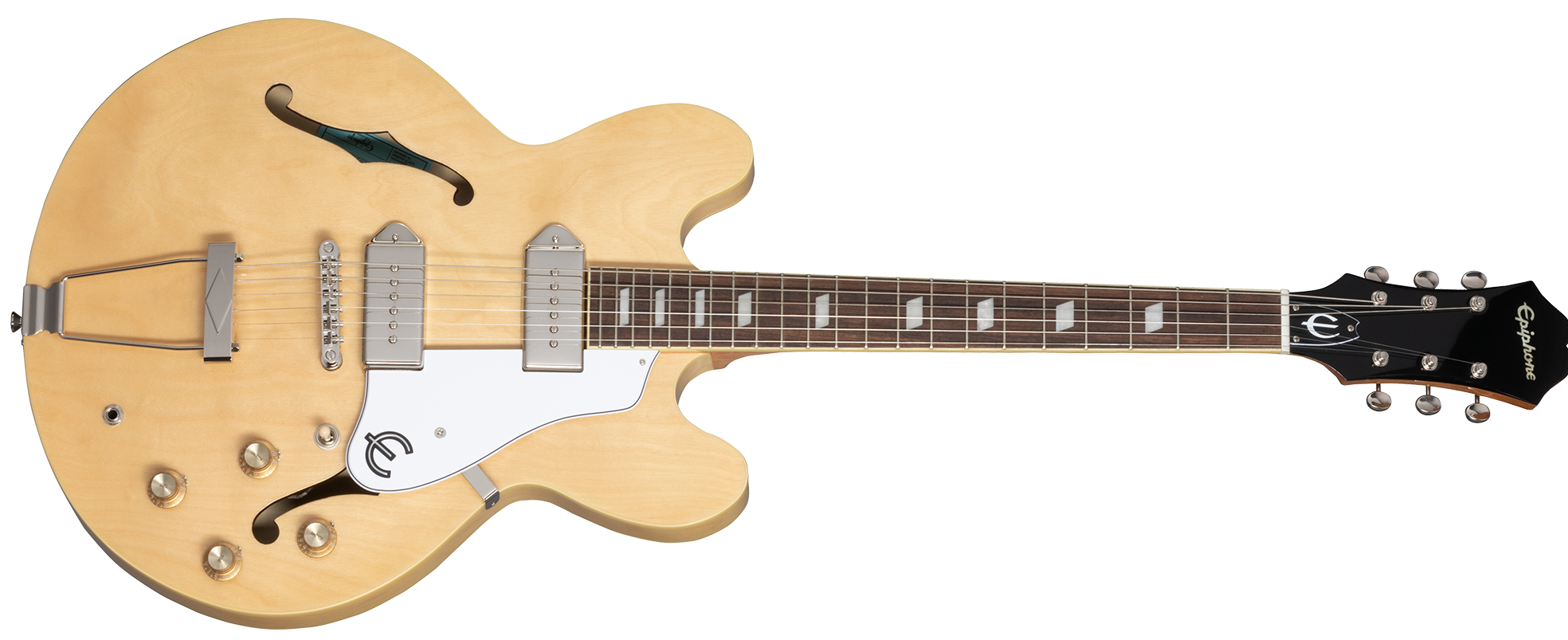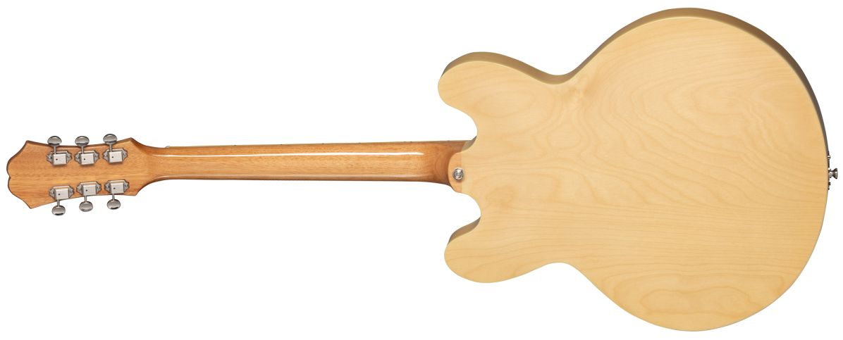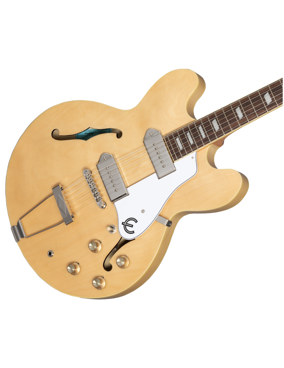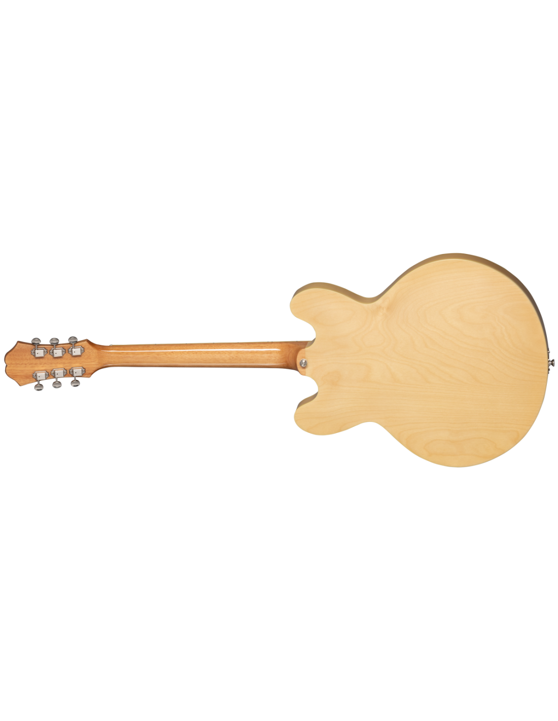 EPIPHONE CASINO NATURAL ist eine semiakustische Archtop-E-Gitarre der Casino-Serie mit einem Korpus aus mehrschichtigem Ahorn und einer 5-lagigen Ahorn-Decke mit amerikanischer Lindenversteifung, einem SlimTaper D-Mahagoni-Hals, einem Pau Ferro-Griffbrett mit 12" Radius, 22 Medium Jumbo-Bünden und Pearloid-Parallelogramm-Einlagen, einem Graph Tech-Sattel, Nickel-Hardware, Epiphone Vintage Style-Mechaniken und einem LockTone Tune-O-Matic-Brücke mit Traditional Trapezoid-Saitenhalter. Die Elektronik besteht aus 1 Dogear P-90R Classic-Tonabnehmer am Steg und 1 Dogear P-90T Classic-Tonabnehmer am Hals, mit 2 Lautstärke- und Tonreglern sowie einem 3-Wege-Pickup-Wahlschalter von Epiphone.