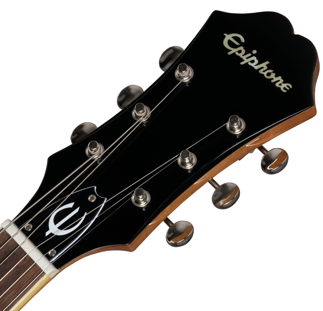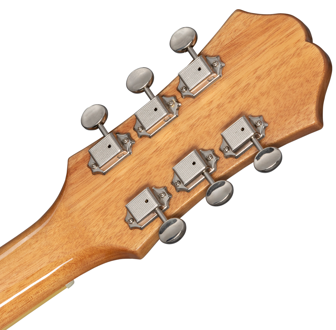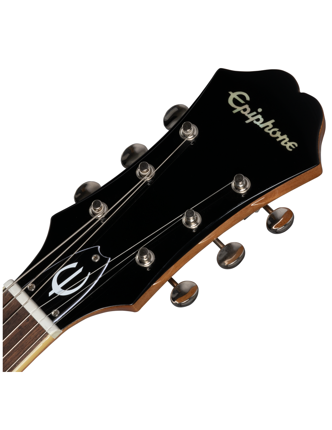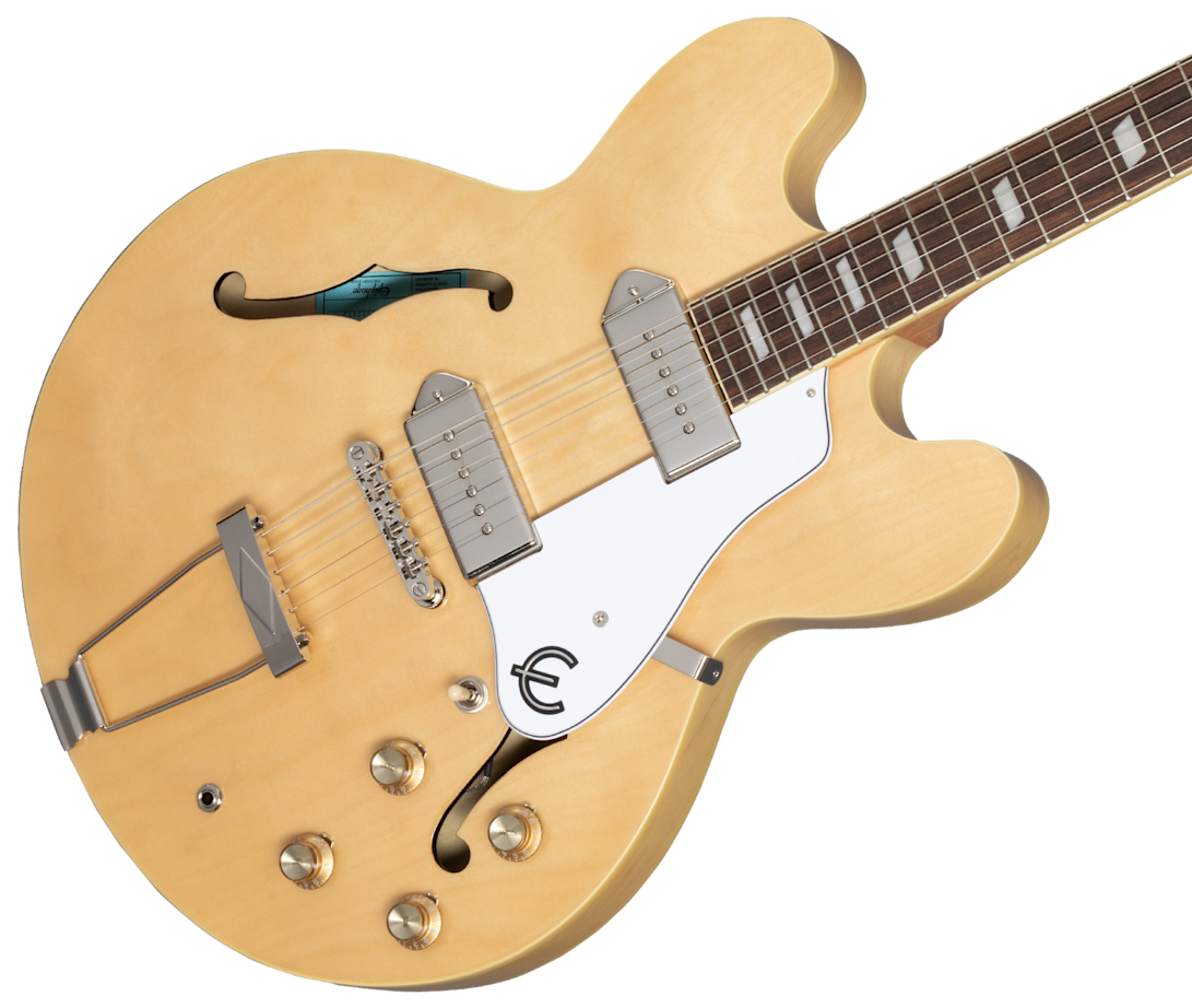 EPIPHONE CASINO NATURAL ist eine semiakustische Archtop-E-Gitarre der Casino-Serie mit einem Korpus aus mehrschichtigem Ahorn und einer 5-lagigen Ahorn-Decke mit amerikanischer Lindenversteifung, einem SlimTaper D-Mahagoni-Hals, einem Pau Ferro-Griffbrett mit 12" Radius, 22 Medium Jumbo-Bünden und Pearloid-Parallelogramm-Einlagen, einem Graph Tech-Sattel, Nickel-Hardware, Epiphone Vintage Style-Mechaniken und einem LockTone Tune-O-Matic-Brücke mit Traditional Trapezoid-Saitenhalter. Die Elektronik besteht aus 1 Dogear P-90R Classic-Tonabnehmer am Steg und 1 Dogear P-90T Classic-Tonabnehmer am Hals, mit 2 Lautstärke- und Tonreglern sowie einem 3-Wege-Pickup-Wahlschalter von Epiphone.