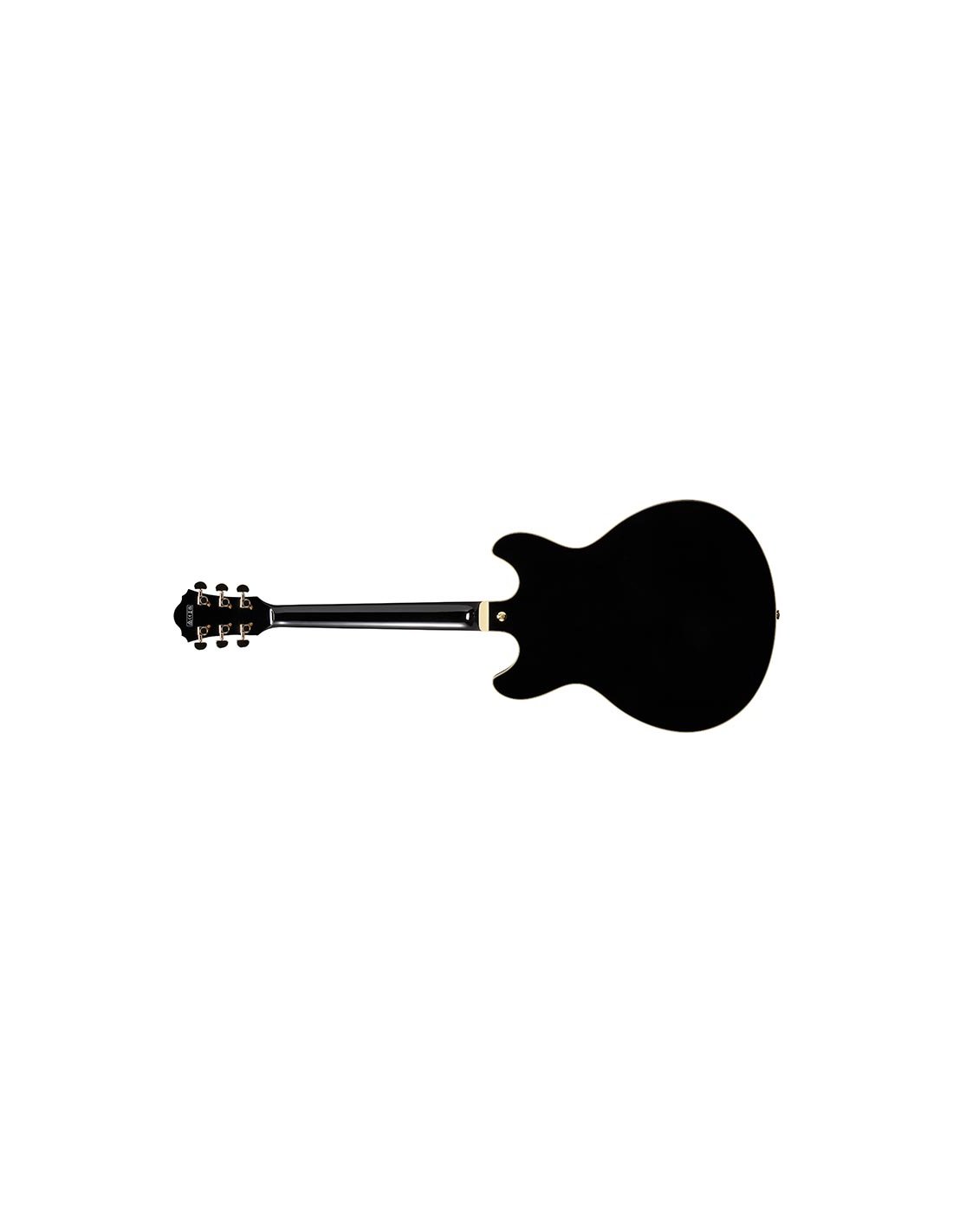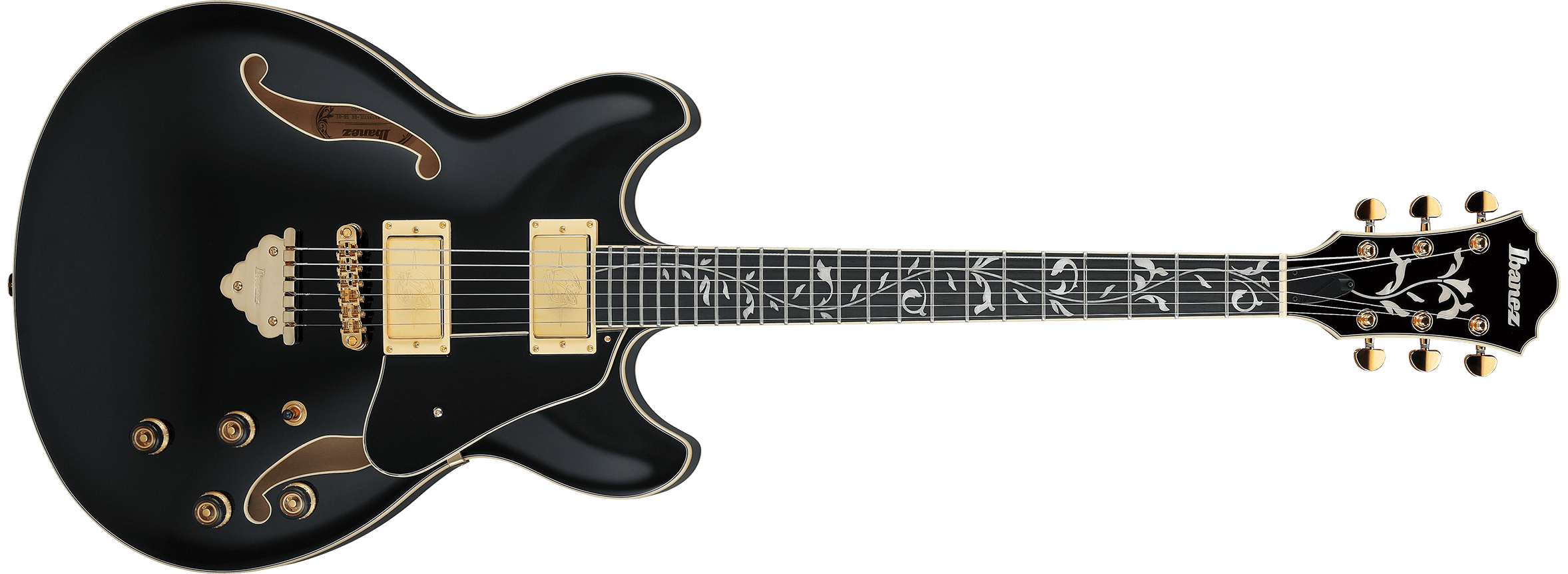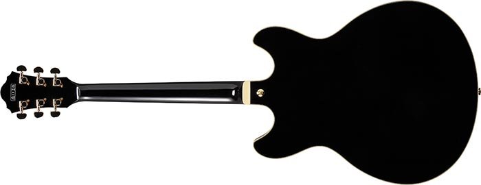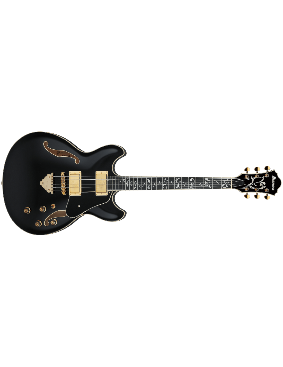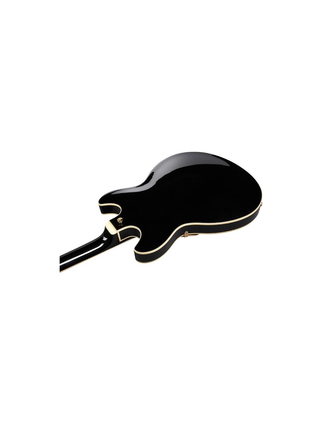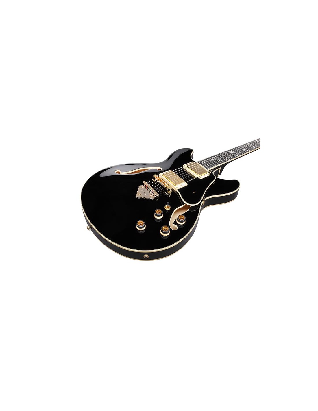 IBANEZ AS93SP-BK ist eine semiakustische Hollow-Body-Gitarre der Ibanez AS-Serie, Modell 93SP Artcore Expressionist mit Decke, Boden und Zargen aus Lindenholz, AS Expressionist set-in Hals aus 3 Teilen Nyato/Ahorn, Griffbrett aus Macassar-Ebenholz mit 12" Radius, 22 Medium-Bünde und Einlage Tree of Life über die gesamte Länge, Sattel aus PPS-Elfenbein, Hardware in Gold, Die-cast Mechaniken "Half moon" gold und Gibraltar Performer-Brücke mit Quik Change Classic Saitenhalter. Die Elektronik in HH-Konfiguration besteht aus 2 Ibanez Super 80 Passive/Ceramic Humbuckern, mit 2 Lautstärkereglern, 2 Tone-Reglern und einem 3-Wege-Pickup-Wahlschalter.