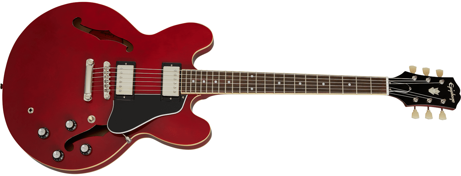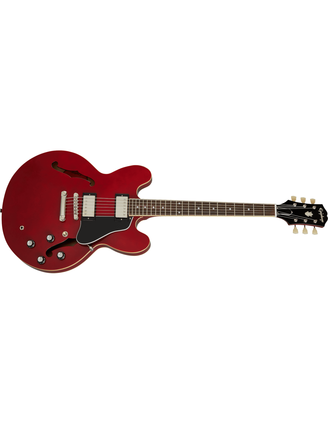Halbakustische Gitarre Epiphone ES-335 in der Farbe KIRSCH. Die Epiphone ES-335 ist eine halbakustische Gitarre mit 6 Saiten, inspiriert von der historischen ES-335, die die Geschichte des Rock & Roll geprägt hat. Zu den technischen Merkmalen gehören ein Korpus aus Ahorn mit solidem Mittelblock, ein Mahagonihals mit Rounded C-Profil, ein Griffbrett aus indischem Lorbeer mit 22 Bünden, Epiphone Alnico Classic Pro Humbucker-Tonabnehmer, Epiphone LockTone Tune-O-Matic-Brücke, Epiphone Deluxe Mechaniken und verchromte Hardware.