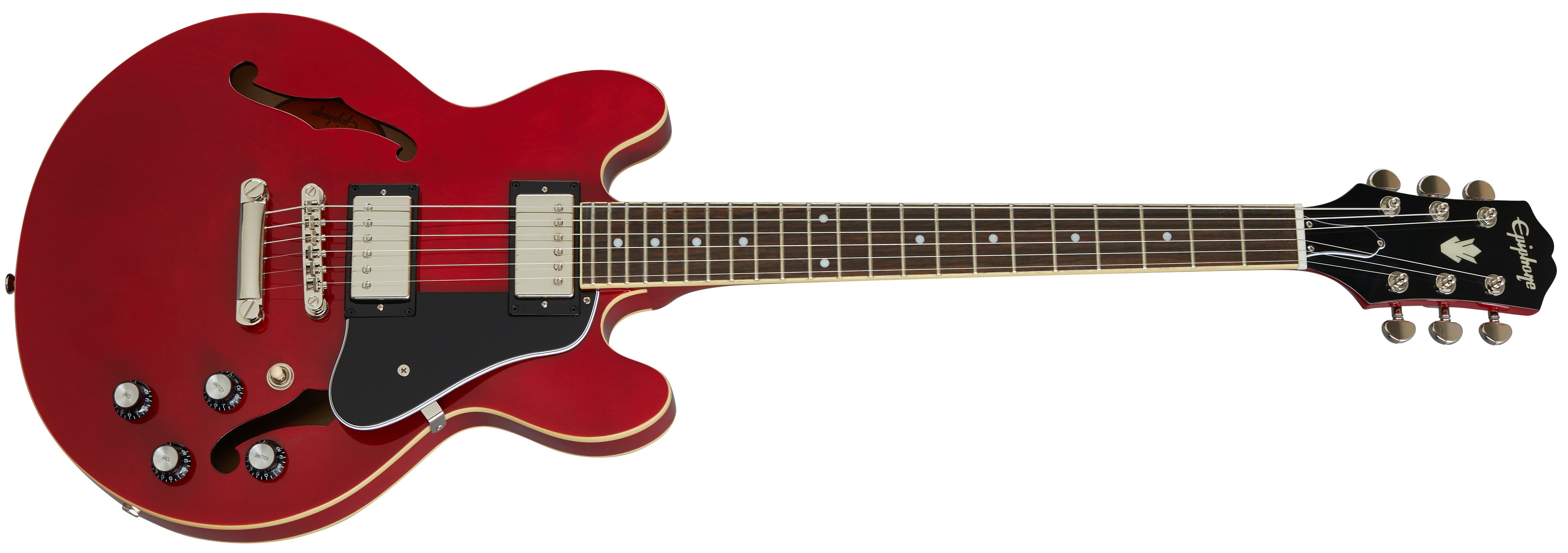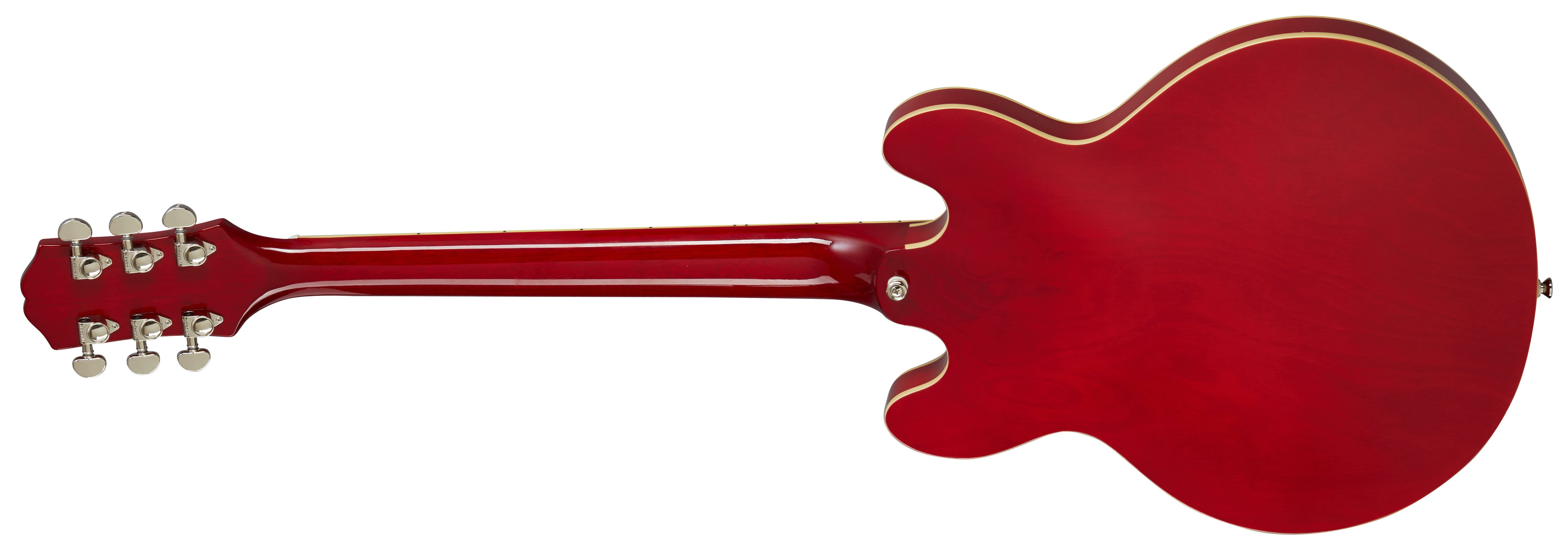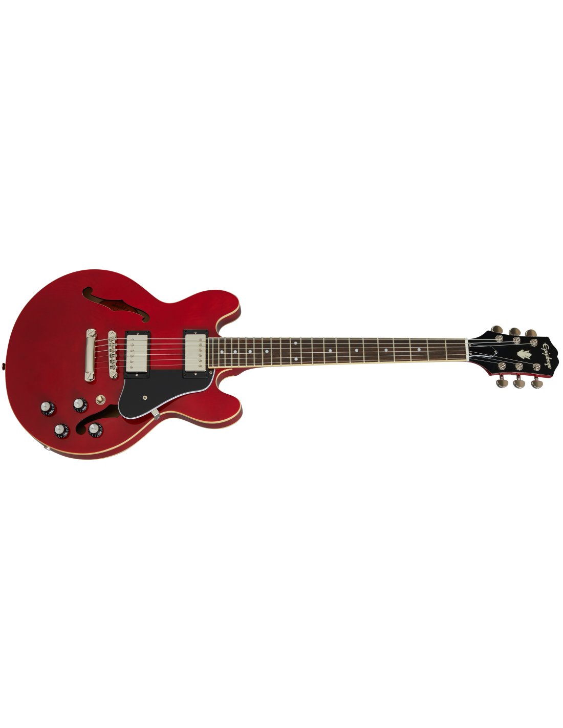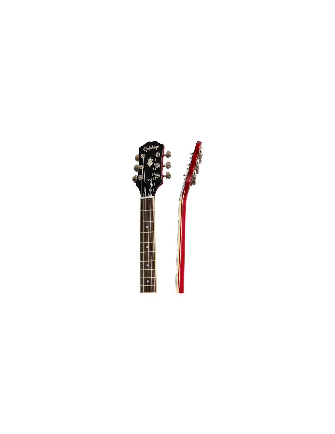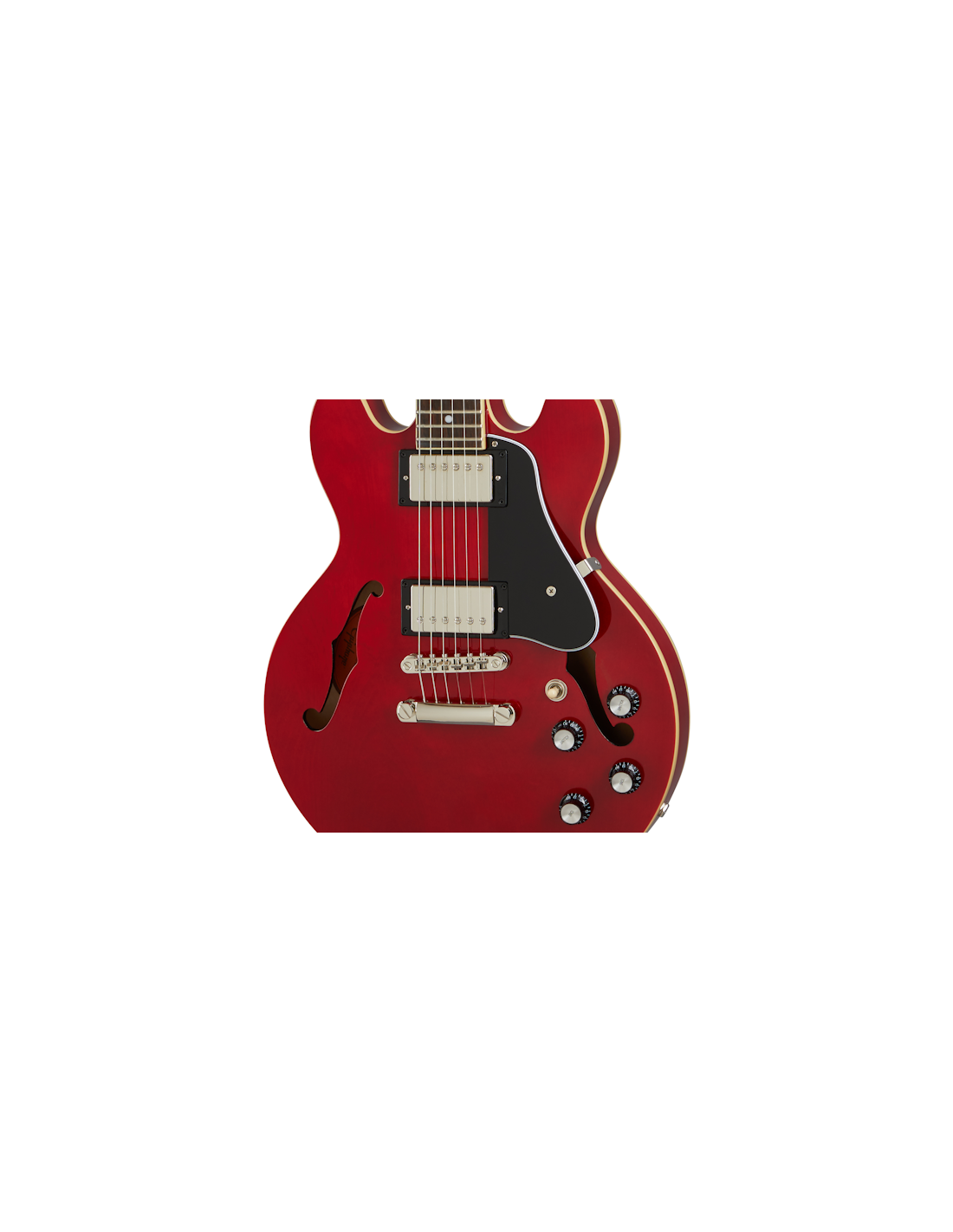 EPIPHONE ES-339 CHERRY ist eine semiakustische Hollowbody-Gitarre des Modells ES-339 mit einem Korpus, einer Decke, einem Boden und Zargen aus mehrschichtigem Ahorn, einem Hals aus Mahagoni mit Rounded C-Profil, einem Griffbrett aus indischem Lorbeer mit 12" Radius, 22 Medium Jumbo Bünden und Perloid Dots-Inlays, einem Sattel aus Graph Tech NuBone, vernickeltem Hardware, einem doppelt wirkenden Truss Rod, Grover Rotomatic Mechaniken und einem LockTone Tune-O-Matic Steg mit Epiphone LockTone Saitenhalter. Die Elektronik besteht aus 2 Alnico Classic PRO Humbucker-Tonabnehmern mit vernickelten Abdeckungen, 2 Lautstärkereglern, 2 Tone-Reglern, CTS-Potentiometern und einem 3-Wege-Tonabnehmer-Schalter.