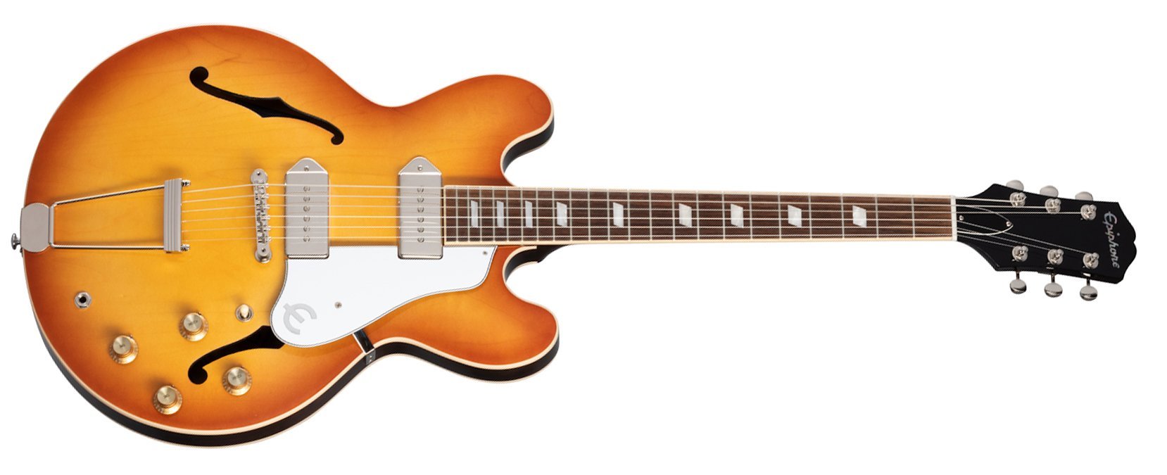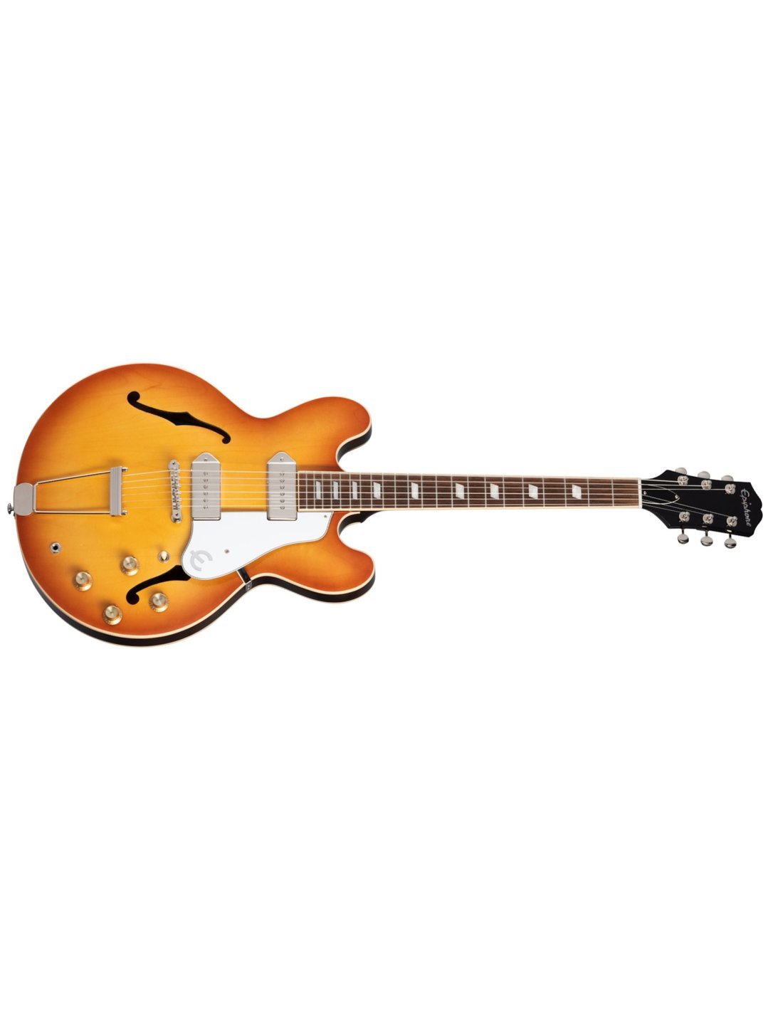 Halbakustische Gitarre Epiphone USA Casino Royal Tan Farbe ROYAL TAN. Die Epiphone USA Casino Royal Tan ist eine halbakustische Gitarre mit 6 Saiten, die Teil der USA-Kollektion ist, die die originalen Epiphone-Modelle feiert, indem sie von Hand in den Vereinigten Staaten hergestellt werden. Zu den technischen Merkmalen gehören ein Korpus aus Ahorn/Pappel/laminiertem Ahorn mit cremefarbenem Binding, ein Mahagonihals mit Rounded C-Profil, ein Griffbrett aus indischem Palisander mit 22 Bünden und parallelogrammförmigen Einlagen aus Acryl, Gibson USA P-90 Dogear Single Coil Pickups mit schwarzen Abdeckungen, Epiphone LockTone Tune-O-Matic Bridge und Tailpiece, vintage-stil Kluson Mechaniken und verchromte Hardware.