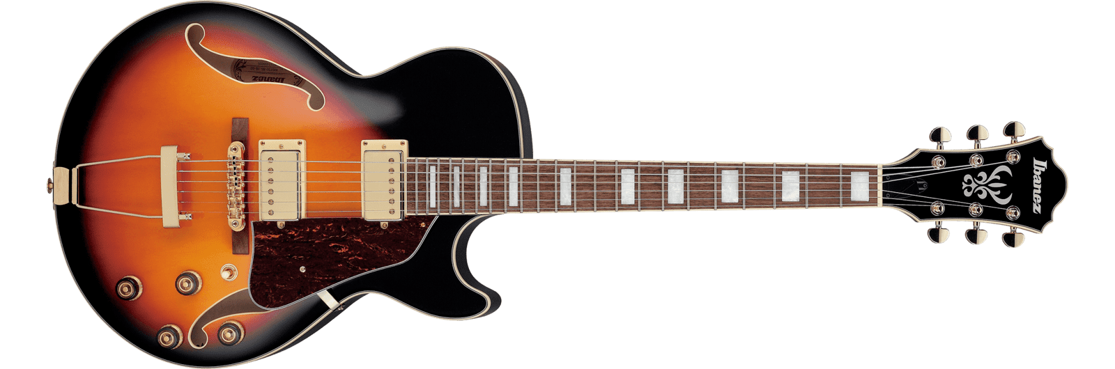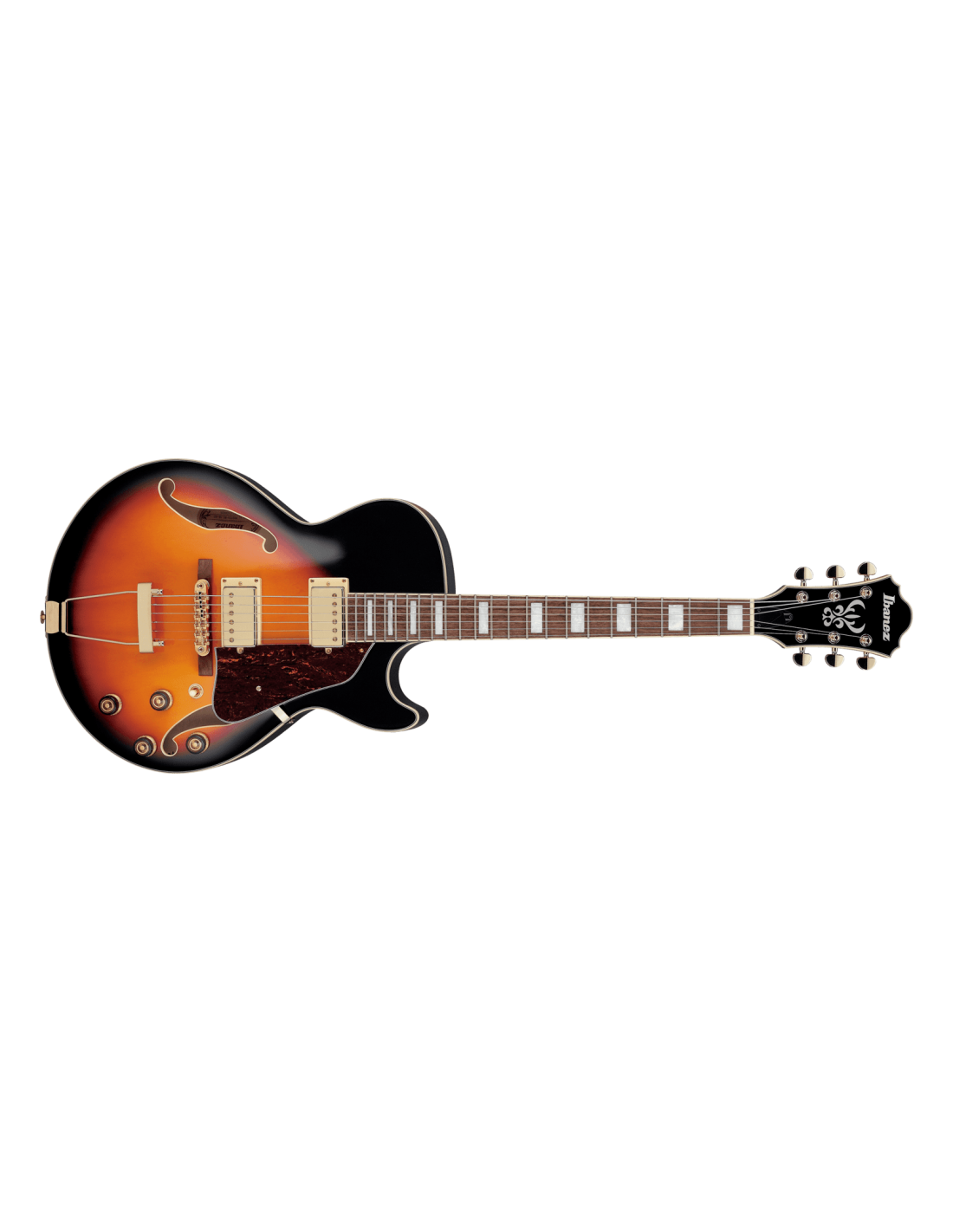 IBANEZ AG75G-BS ist eine semiakustische Gitarre mit einem Korpus aus Linde und Zargen, einem AG Artcore-Hals aus Nyatoh mit einem Bund aus Walnuss, der auf einen Radius von 12" und 22 Medium Jumbo-Bünden gerundet ist, rechteckigen Einlagen aus Acryl, einer Set-In-Hals-Korpus-Verbindung, einem Gibraltar Performer-Brücke mit VT06-Saitenhalter, einem Sattel aus Knochen, goldener Hardware und gegossenen Mechaniken. Die Elektronik besteht aus 2 Ibanez Classic Elite Humbucker-Tonabnehmern mit Lautstärke- und Tonreglern sowie einem 3-Wege-Tonabnehmer-Wahlschalter.