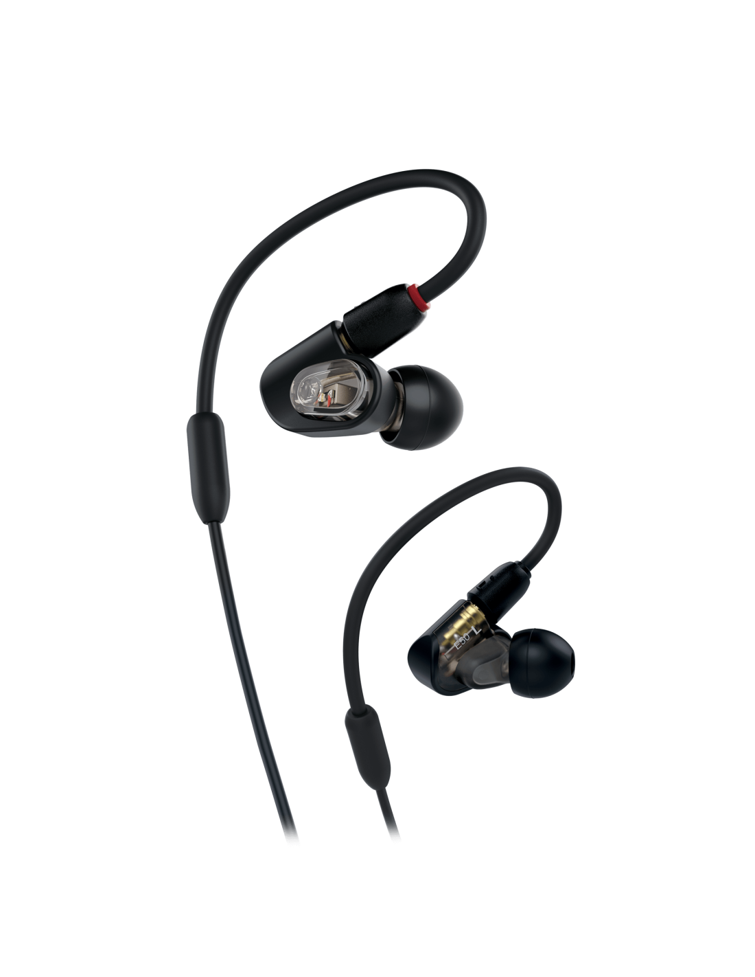 Die ATH-E50 von Audio Technica sind schwarze In-Ear-Kopfhörer mit einer Frequenzantwort von 20-18.000 Hz, einer Empfindlichkeit von 107 dB/mW, einer Impedanz von 44 Ohm, einem 1,6 m langen Kabel von 3,5 mm auf L mit abnehmbaren A2DC vergoldeten Mini-Steckern.