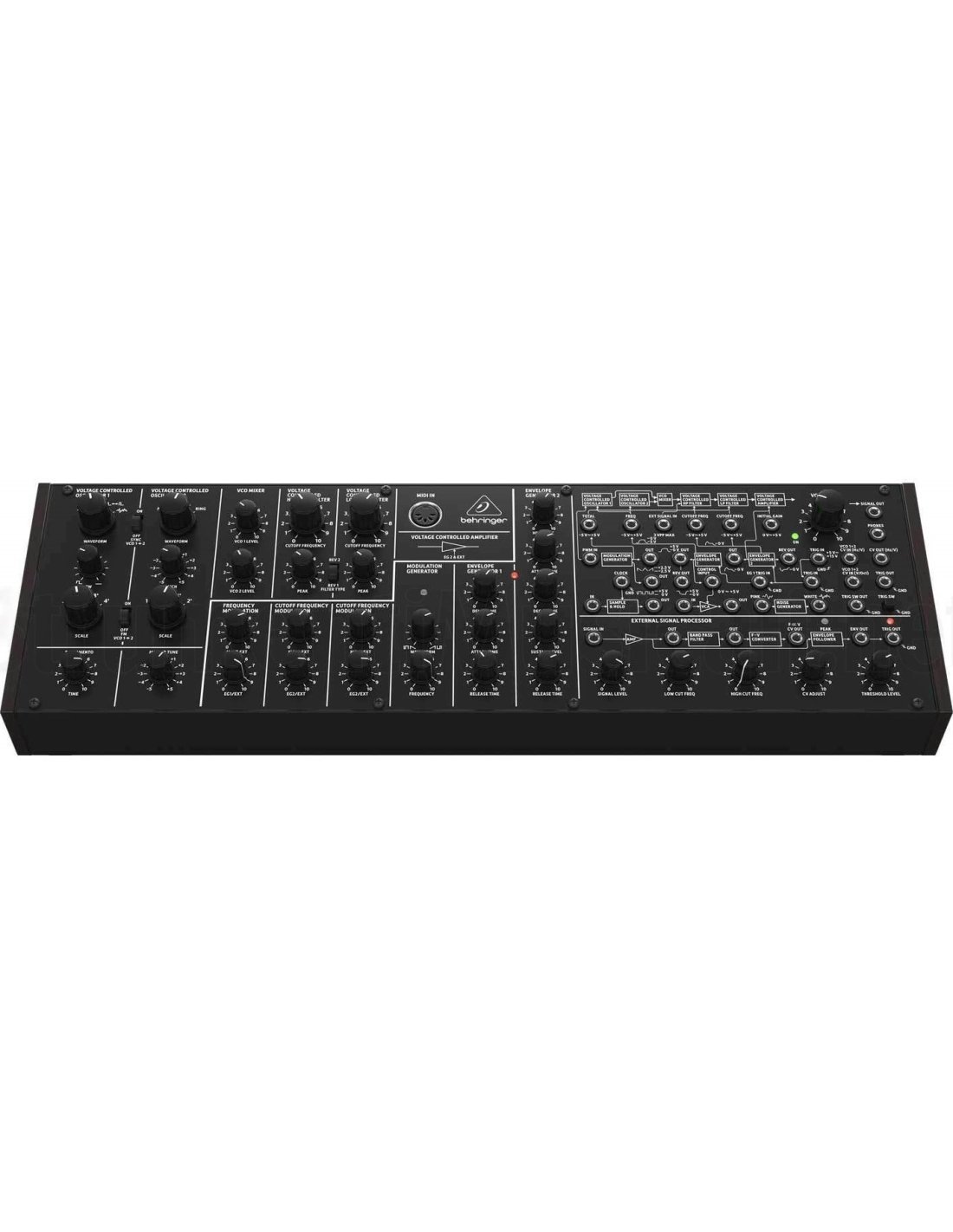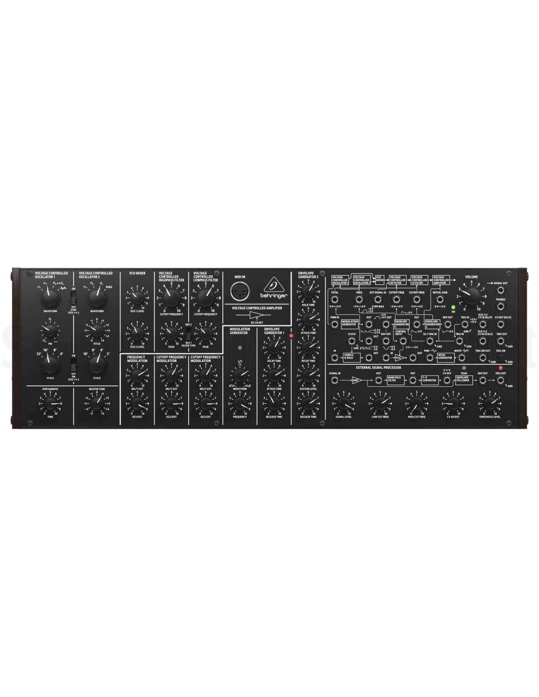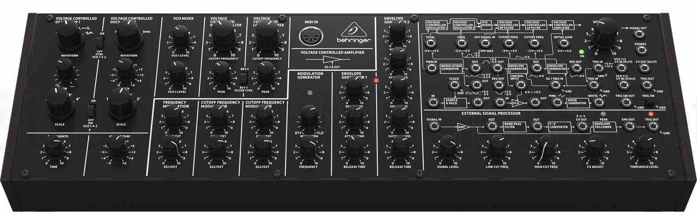 BEHRINGER K-2 MKII ist ein semi-modularer analoger Synthesizer-Modul mit doppelt VCO, authentischer Nachbildung der originalen Schaltungen mit Transistoren und kombinierten JFETs. Die technischen Merkmale umfassen einen reinen analogen Signalweg basierend auf echtem VCO-, VCF- und VCA-Design, einen Sync-Oszillator, einen FM-Oszillator und Pulsbreitenmodulation auf allen vier VCO-Wellenformen, ein Hochpass-/Tiefpassfilter mit Peak/Resonanz, eine Matrix von 38 zwischen CV-Eingängen und -Ausgängen, 4 variablen Oszillatorformen mit Ringmodulation, 2 Hüllkurvengeneratoren zur Modulation von VCF und VCA, Poly Chain mit 16 Stimmen, die es ermöglicht, mehrere Synthesizer für 16 Stimmen Polyphonie zu verbinden, insgesamt 36 Regler. Das Modul kann in einem standardmäßigen Eurorack-Gehäuse montiert werden.
