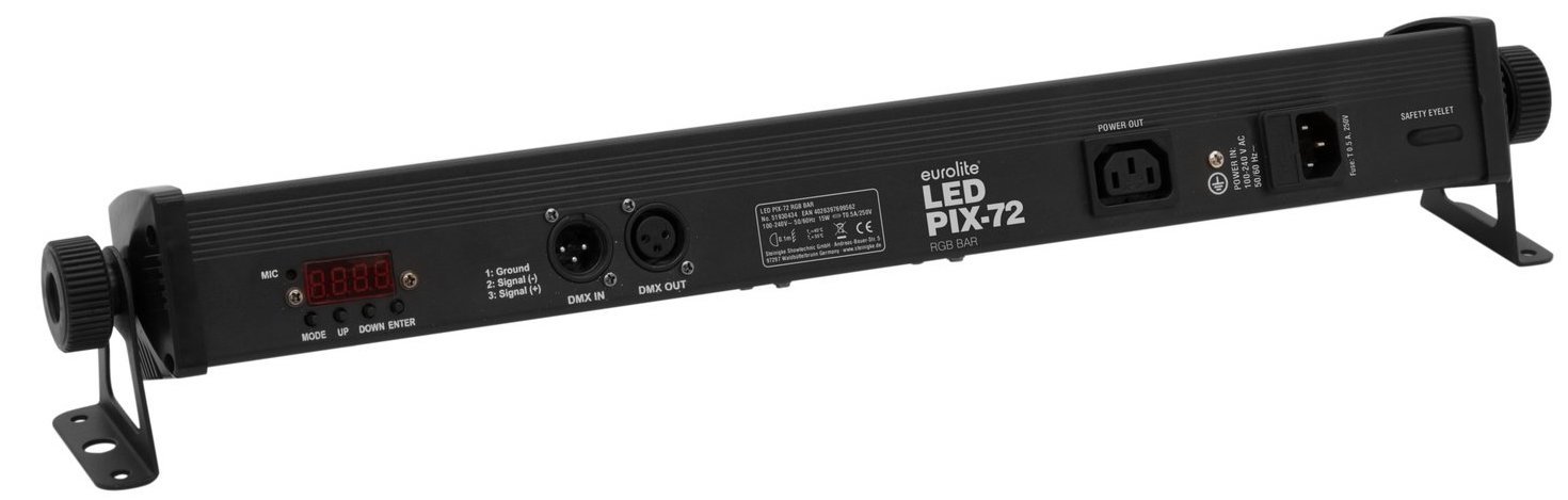 EUROLITE LED PIX-72 ist eine RGB-LED-Leiste, die aus 72 SMD-LEDs besteht, die in 4 separate Segmente gesteuert werden können. Zu den technischen Eigenschaften gehören eine kontinuierliche Farbmischung mit Farbwechsel, voreingestellte Farben, Dimmer und Strobe-Effekt, Netzwerk-Ein- und Ausgänge zum Anschluss von bis zu 8 Einheiten, 72 SMD 5050 3in1 TCL RGB LEDs, Steuerung über DMX (3, 5, 6, 12, 12 CH), Stand-alone, Master/Slave-Funktion, Sound über integriertes Mikrofon und Light Captain-Modus, 2 Halterungen für Boden- oder Deckenmontage, 4-stelliges LED-Steuerdisplay und DMX-Anschlüsse über XLR 3pin.
