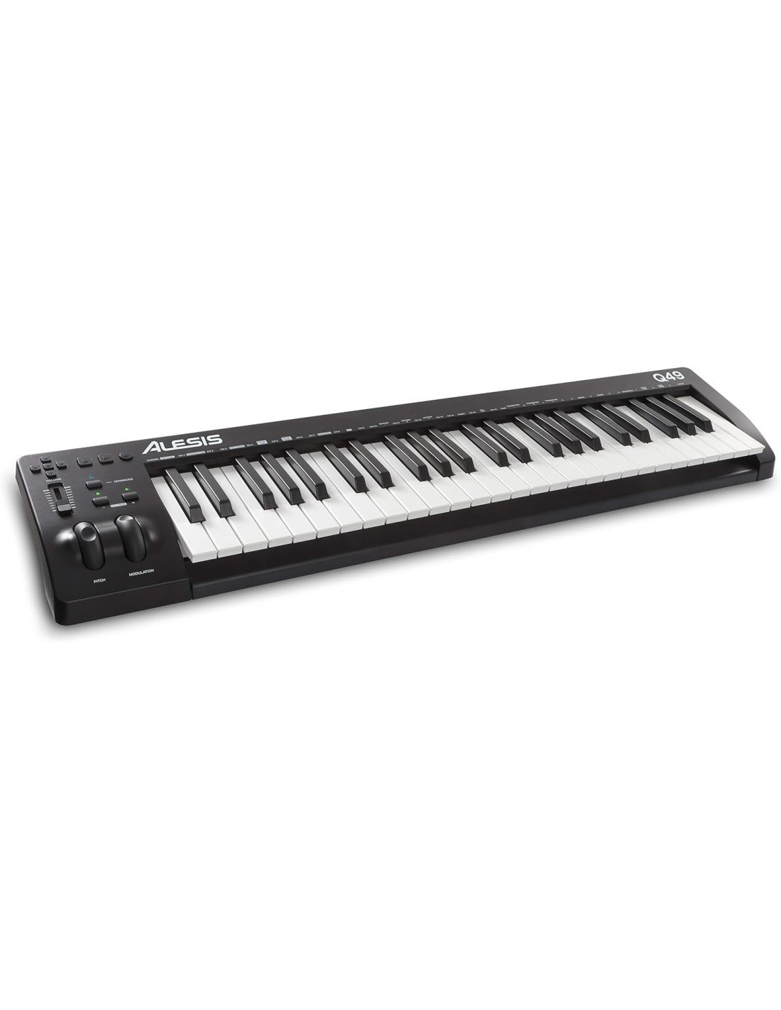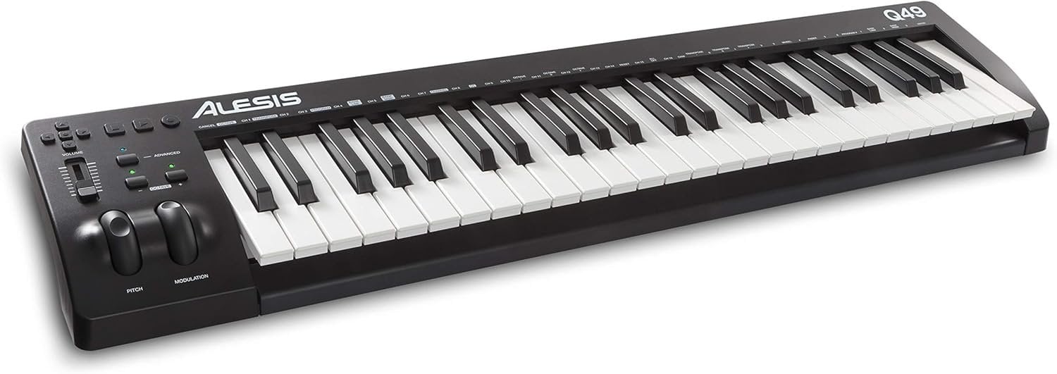 ALESIS Q49 MKII ist ein MIDI-Keyboard mit 49 Synth Action-Tasten in Standardgröße und anschlagempfindlich. Die technischen Merkmale umfassen USB-Bus-Stromversorgung, Oktav- und Transponiertasten, Pitch Bend und Modulation, Transporttasten, einem zuweisbaren Lautstärkeregler für jeden MIDI Control Change, Transporttasten zur DAW-Steuerung, einem 6,3 mm TS Klinkeneingang für ein Sustain-Pedal und eine direkte Verbindung ohne Treiber zu PC und Mac.