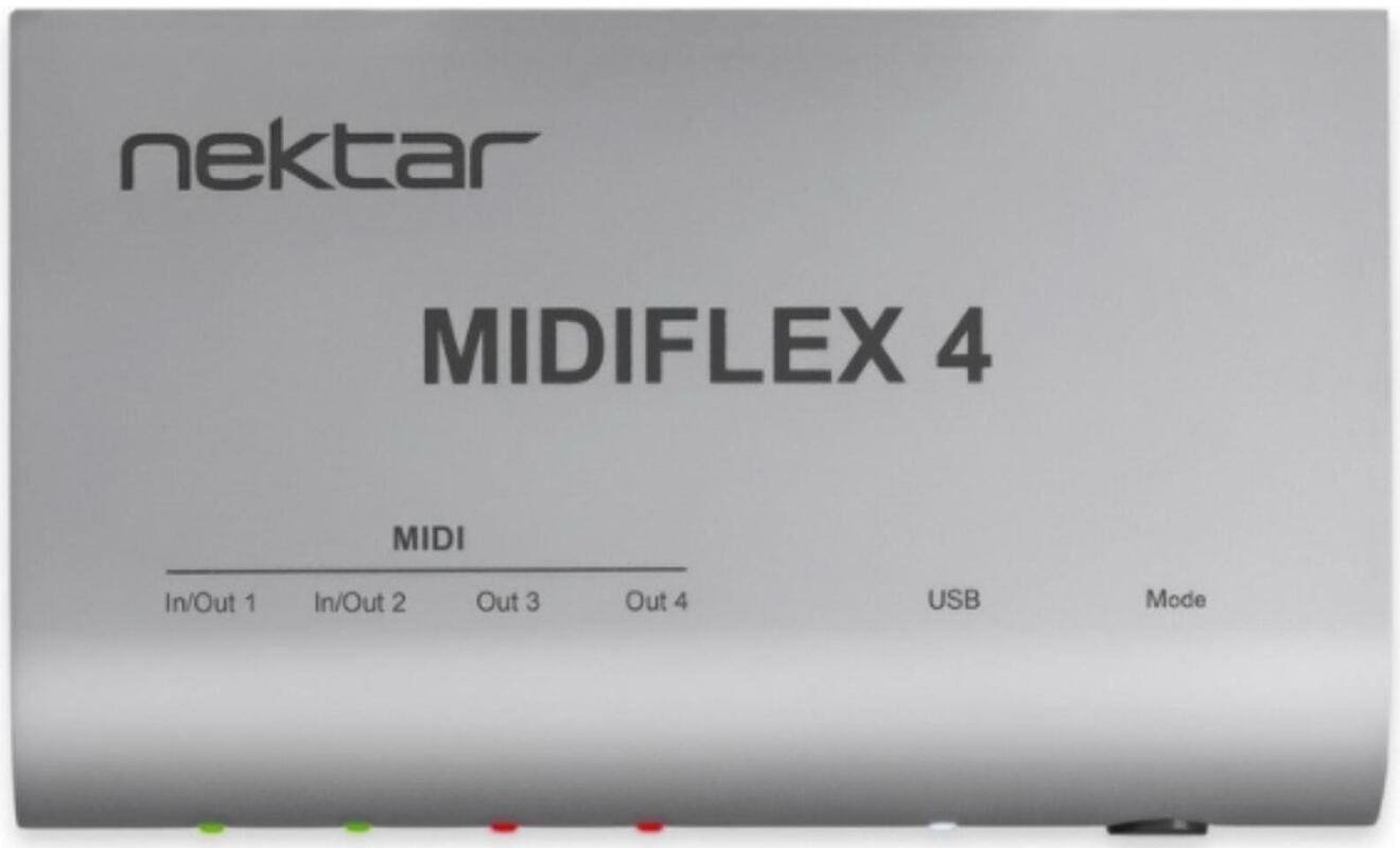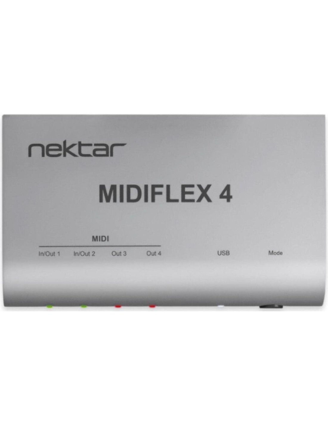 NEKTAR MIDIFLEX 4. MIDI-Interface 4-in/4-out, die als 1-in/3-out, 2-in/2-out oder 4-out-Interface fungieren kann, ohne dass eine Hardware-Installation erforderlich ist, ausgestattet mit automatischer Erkennung von MIDI In/Out, 4 Status-LEDs, 1 Netz-LED und Standalone- oder Split-Box-Modus-Taste. Im Lieferumfang enthalten sind ein Standard-USB-Kabel und eine Softwarelizenz für Bitwig 8-Track.
