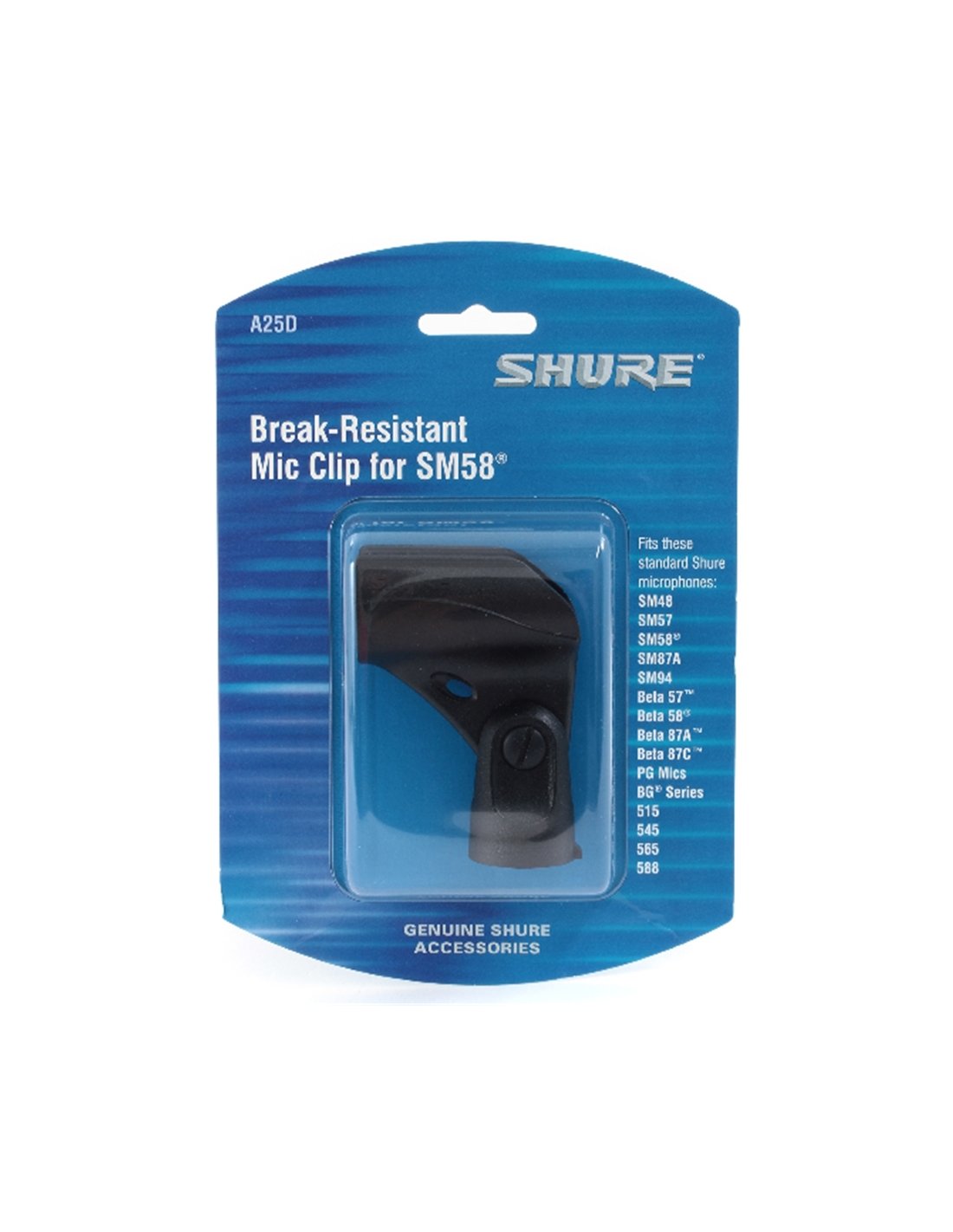 SHURE A25D HALTERUNG FÜR SM57/58. Kunststoffclip für Shure SM57/SM58 Mikrofone, neigungsverstellbar und kompatibel mit allen Mikrofonstativen.