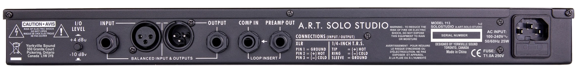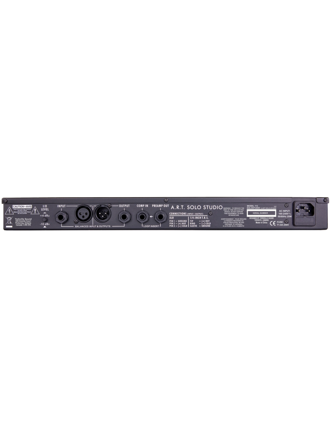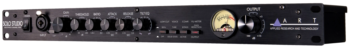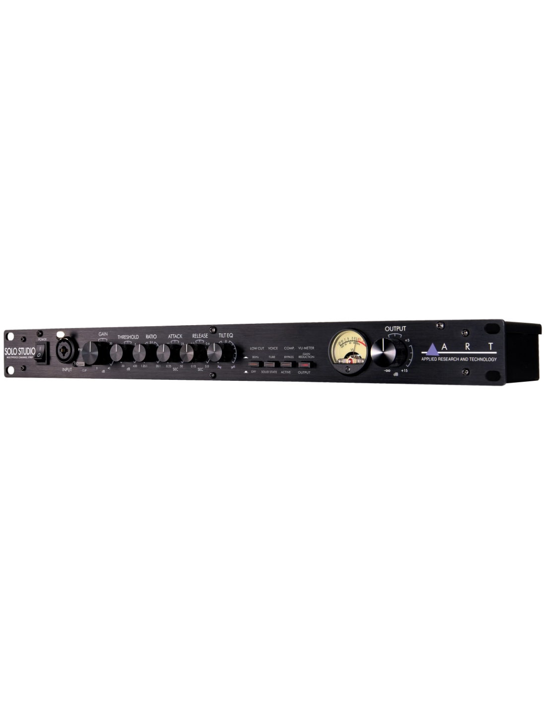 ART SOLO STUDIO ist ein kompaktes Channel Strip im 19" 1U Rackformat, mit Röhrenvorverstärker, optischem Kompressor und Tilt EQ Equalizer. Zu den technischen Merkmalen gehören ein mehrstimmiger Vorverstärker mit handverlesener 12AT7-Röhre, wählbares niederrauschendes Transistorsignal oder Class A Röhrenschaltung, hohe Eingangsimpedanz für den Einsatz mit dynamischen Mikrofonen, breiter Gain-Regler und dedizierte Schalter für +48V Phantomspannung, -20 dB Pad und Phasenumkehr. Analoger Optischer Kompressor (AOI) mit Steuerungen für Threshold, Ratio, Attack, Release, Output Gain und Blend-Kontrolle (Dry/Wet), Tilt EQ Equalizer + schaltbarer HPF bei 80 Hz, beleuchtetes analoges VU-Meter, Insert-Loop vor der Kompression für den Einsatz externer Effekte, symmetrische Ausgänge XLR und TRS 1/4”, Combo-Eingänge XLR/TRS.