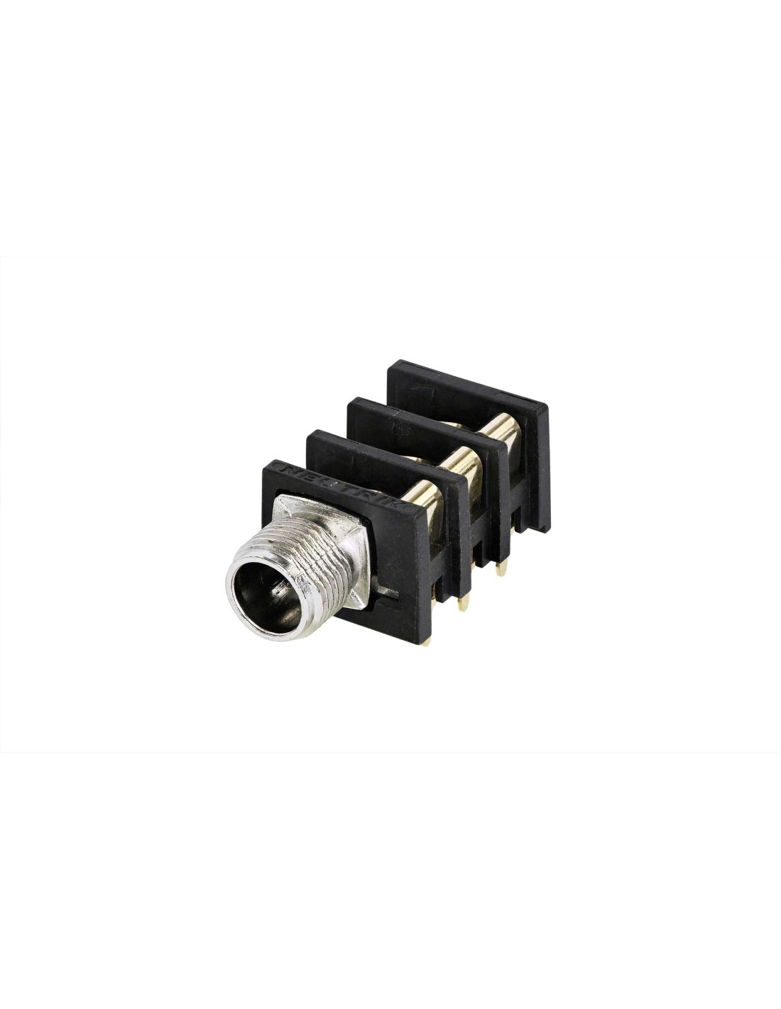 Stereo-Stecker 1/4, mit Metallgehäuse, vergoldeten Kontakten, effizienter Erdung des Rahmens, T+R+S Standardisierungskontakt. Horizontal auf PCB montierter Stecker, der eine hohe Packungsdichte auf der Platine bietet, wenn er bei minimalen Abständen von 15,88 mm (0,625 Zoll) in Reihen oder Arrays montiert wird. Die Montageshardware muss separat bestellt werden.