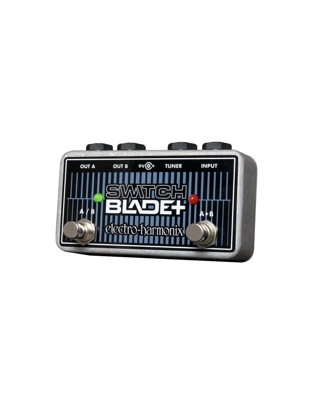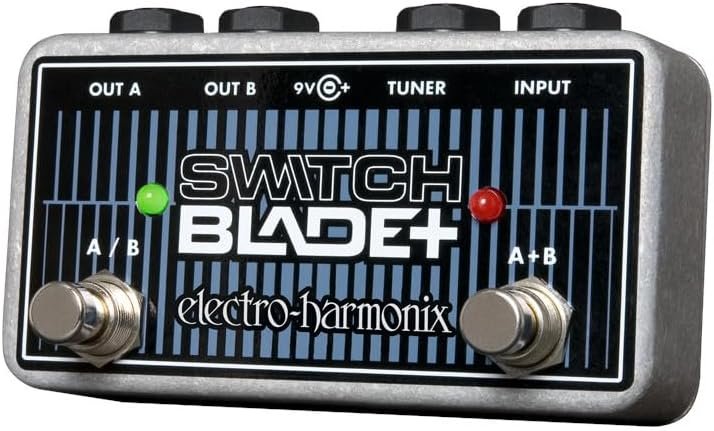 ELECTRO HARMONIX SWITCHBLADE + CHANNEL SELECTOR ist ein passives Channel Selector-Pedal, das es ermöglicht, ein einzelnes Ausgangssignal in 2 Ausgänge A + B zu leiten, oder separat A / B. Es verfügt über 2 Fußschalter für die 2 Funktionen (A+B - A/B) mit rotem Led für A+B und grünem Led für A/B, Eingänge Input und Tuner, Ausgänge Out A und Out B. Es funktioniert sowohl mit einem 9V-Netzteil als auch passiv (kein Led).
