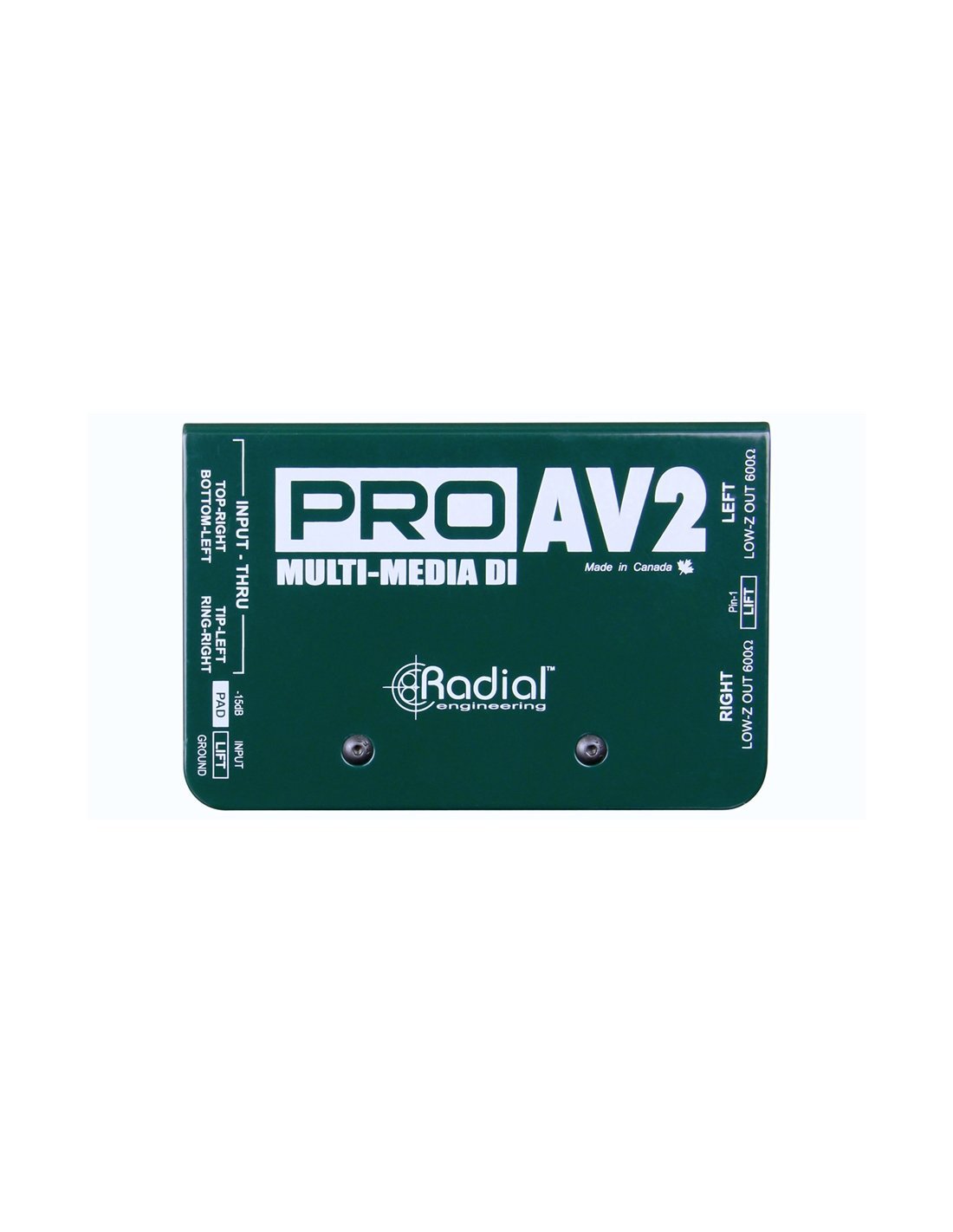 Passive Stereo-Direct-Box. IN/OUT-Anschlüsse zu Klinke, RCA (-10dB) und XLR (+4dB). Praktisch das "Schweizer Taschenmesser" des AV-Installateurs.