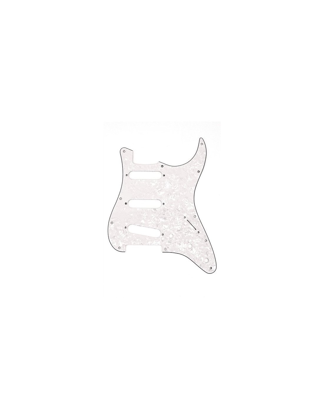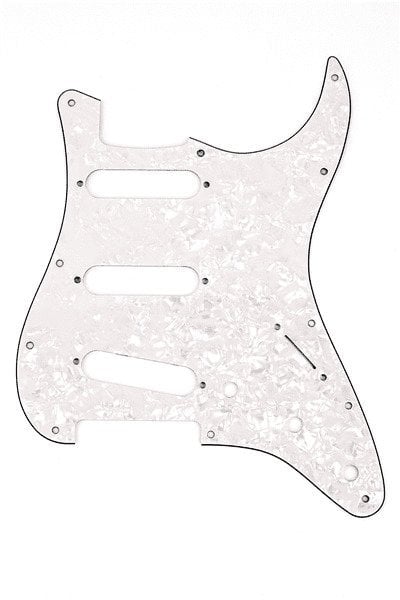 FENDER PICKGUARD STRAT WHITE MOTO 11 HOLE ist ein original Fender Schlagbrett mit 11 Löchern für Fender Stratocaster mit Aluminiumabschirmung auf der Unterseite und weißer Perlmutt-Oberfläche