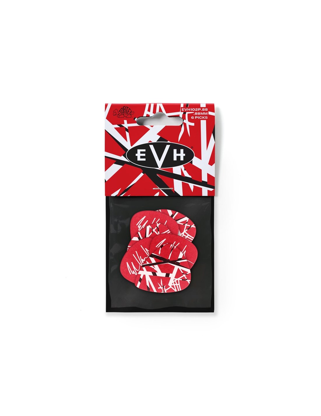 EVH102P088 EVH Tortex Pick .88 mm ist das 6er-Pack der Tortex® Signature-Picks von Eddie Van Halen von Dunlop. Mit einer Dicke von 0,88 mm bieten diese Picks die legendäre Leistung des Tortex-Materials und das Artwork der legendären Gitarre Frankenstein von Eddie.