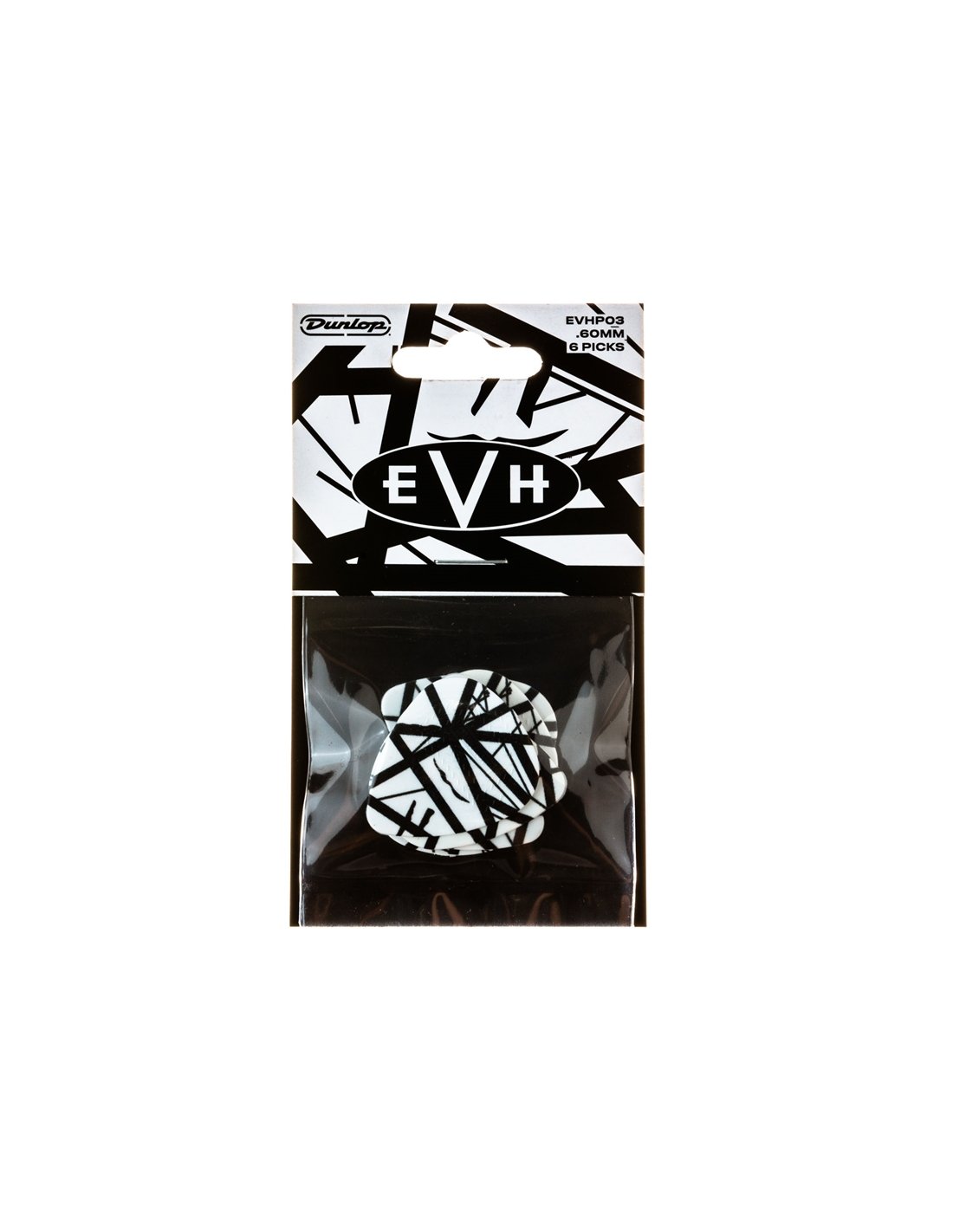 EVHP03 Weiß mit schwarzen Streifen ist das 6er-Pack Max-Grip® Signatur-Plektren von Eddie Van Halen von Dunlop, mit dem unverwechselbaren Artwork, das auf seiner Gitarre "weiß mit schwarzen Streifen" basiert.