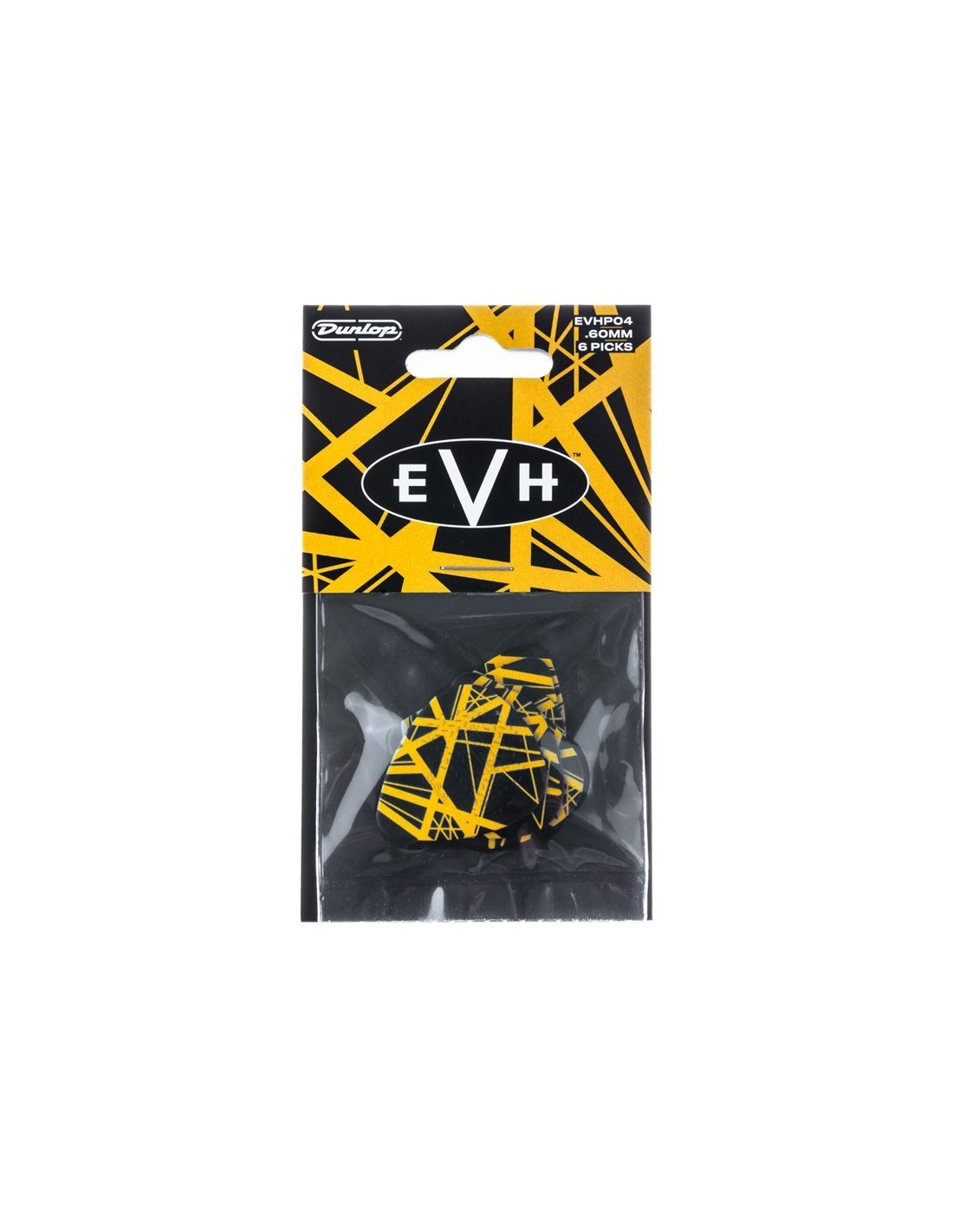 EVHP04 VHII ist das 6er-Pack Max-Grip® Plectren von Eddie Van Halen von Dunlop, mit dem unverwechselbaren Artwork, das auf seiner Gitarre "schwarz mit gelben Streifen" basiert, die erstmals 1979 vorgestellt wurde.
