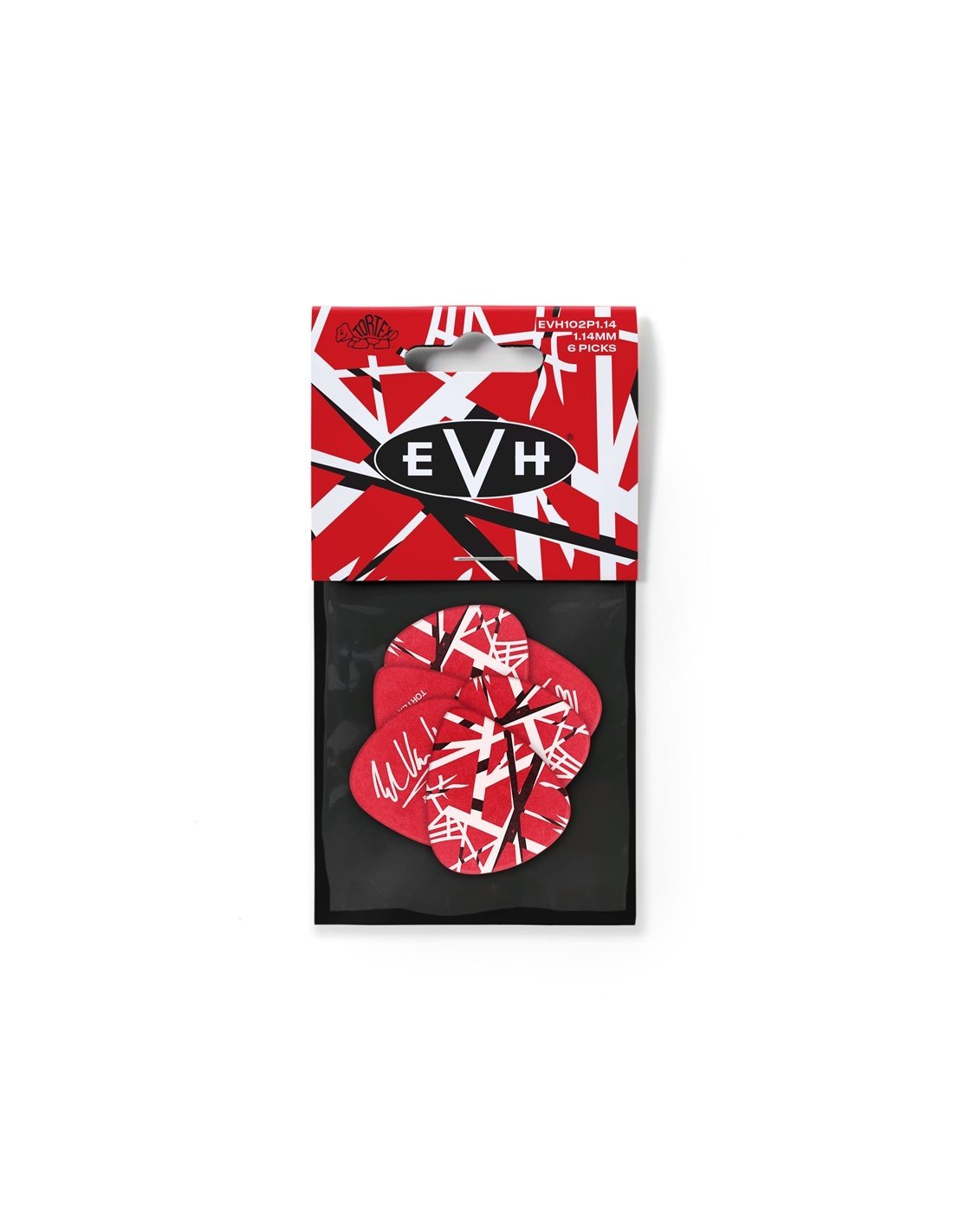 EVH102P114 EVH Tortex Pick 1.14 mm ist das Pack mit 6 Tortex® Signatur-Picks von Eddie Van Halen von Dunlop. Mit einer Dicke von 1.14 mm bieten diese Picks die legendäre Performance des Tortex-Materials und das Artwork der legendären Gitarre Frankenstein von Eddie.