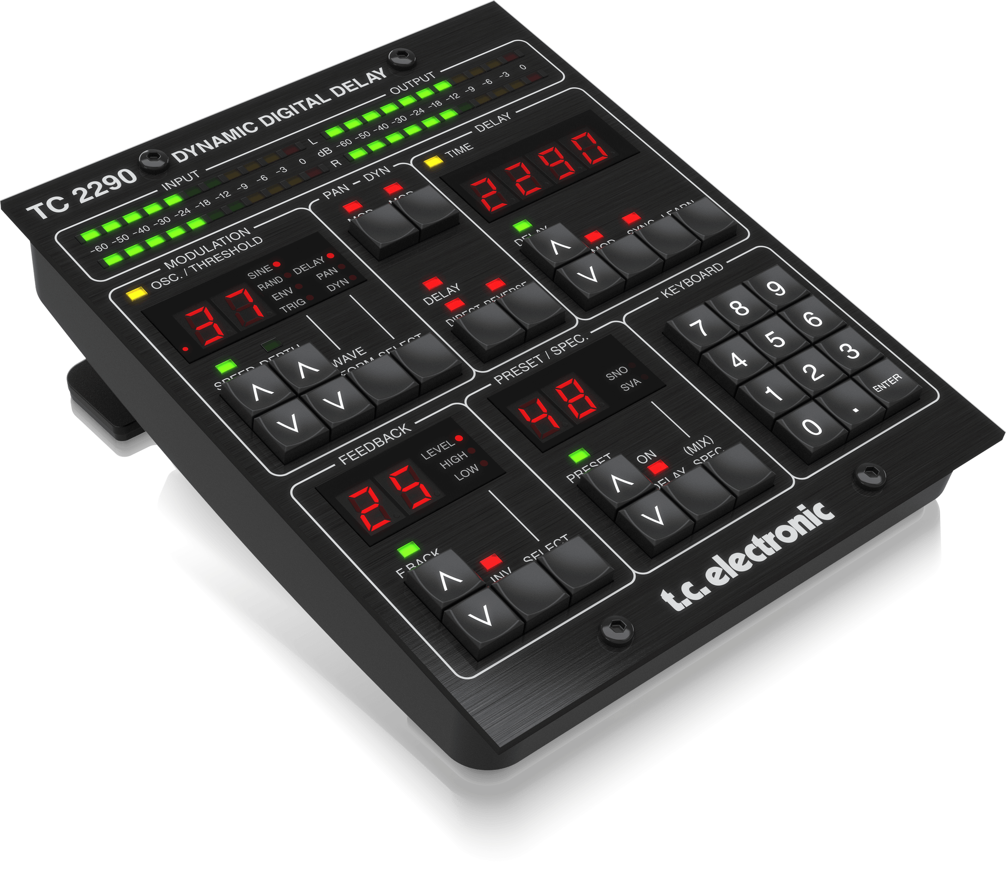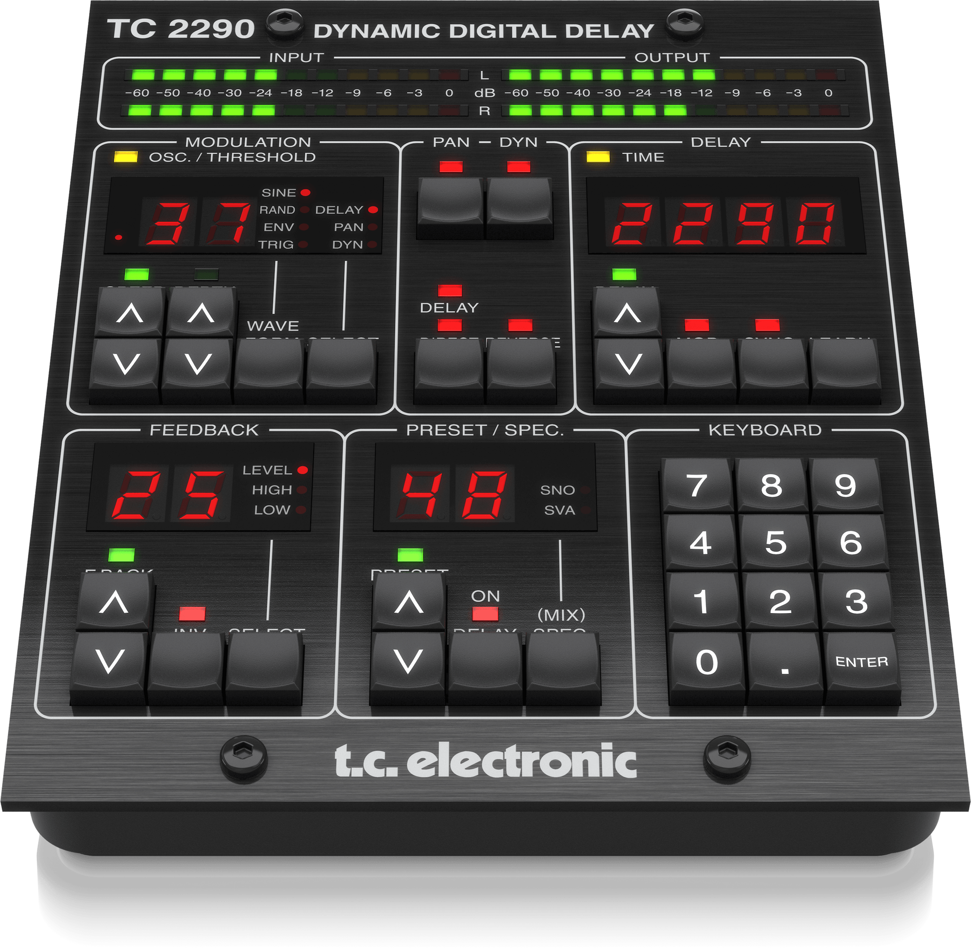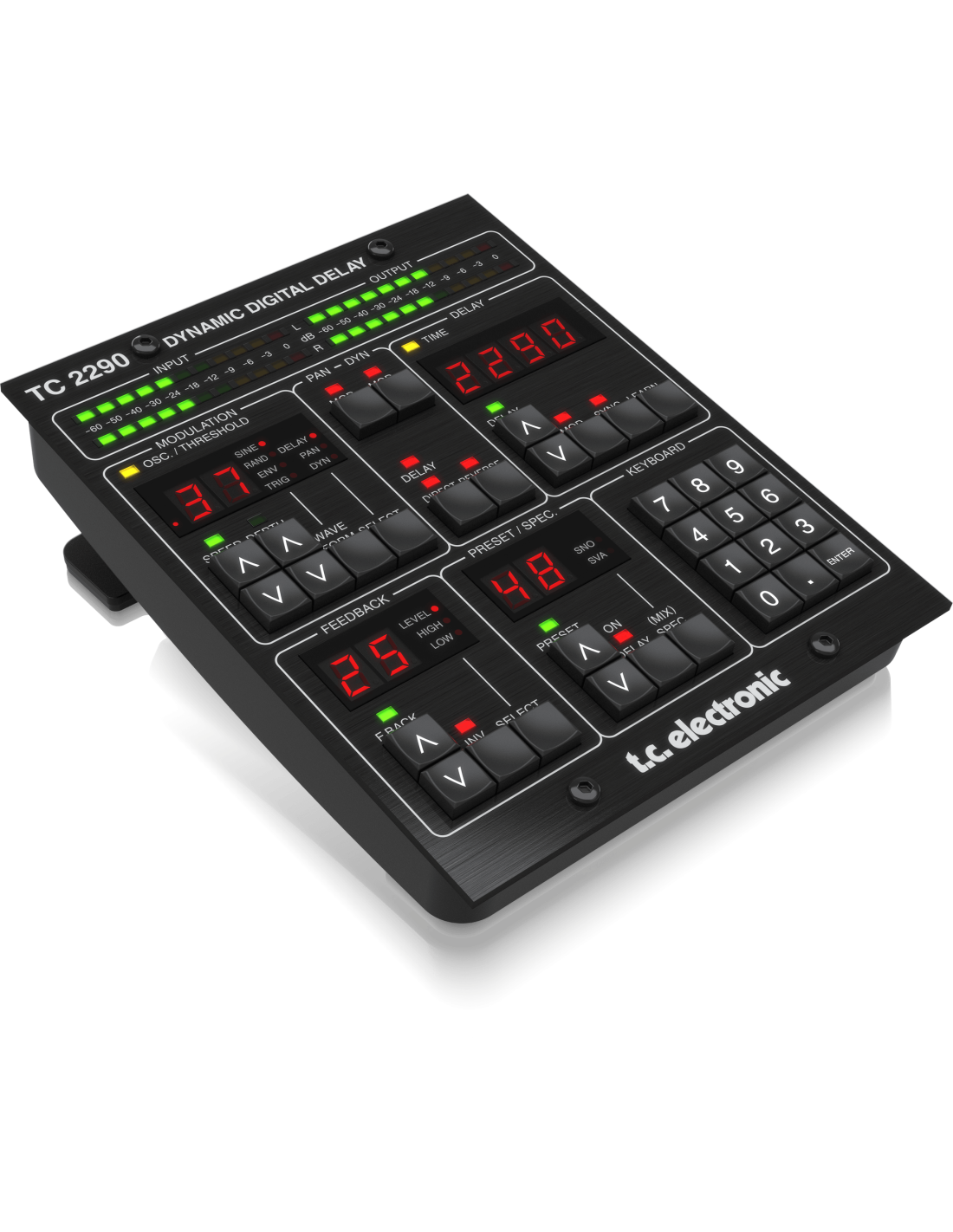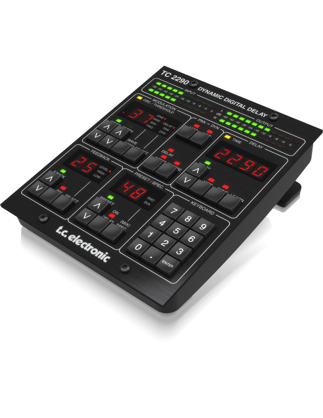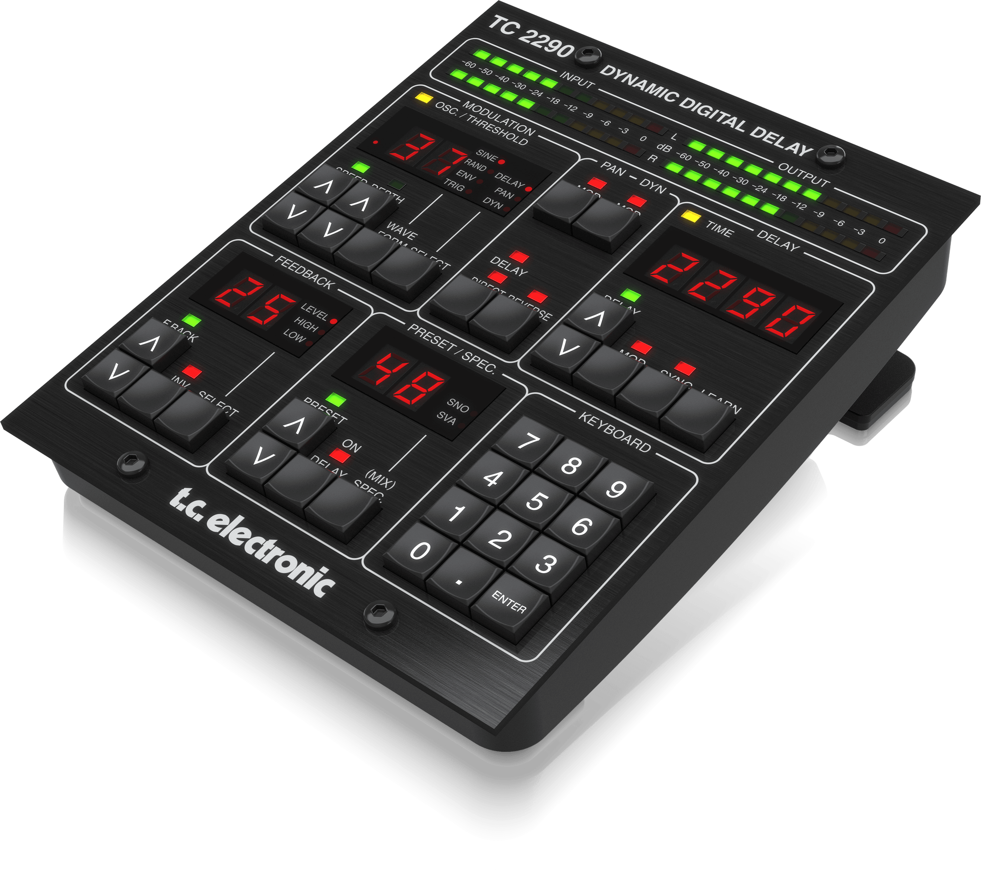 TC ELECTRONIC 2290 DT ist eine Hardware-Schnittstelle des dynamischen Delay-Plugins TC2290 mit ergonomischen, taktilen Steuerungen, benutzerdefinierten Preset-Signaturen von weltbekannten Künstlern und Tontechnikern, hochauflösenden Eingangs-/Ausgangsanzeigen, Standard-VST-, Audio Units- und AAX-Plugin-Verarbeitung, preisgekrönten TC ELECTRONIC-Algorithmen, USB-Stromversorgung, umfangreichen Modulationsmöglichkeiten sowie Kompatibilität mit den gängigen DAWs einschließlich Pro Tools, Cubase, Nuendo, Logic Pro, GarageBand und Ableton Live
