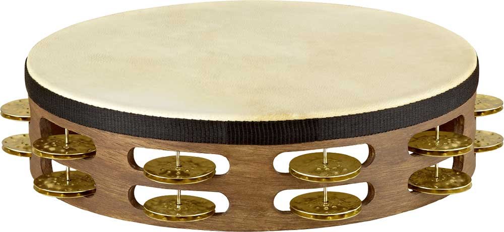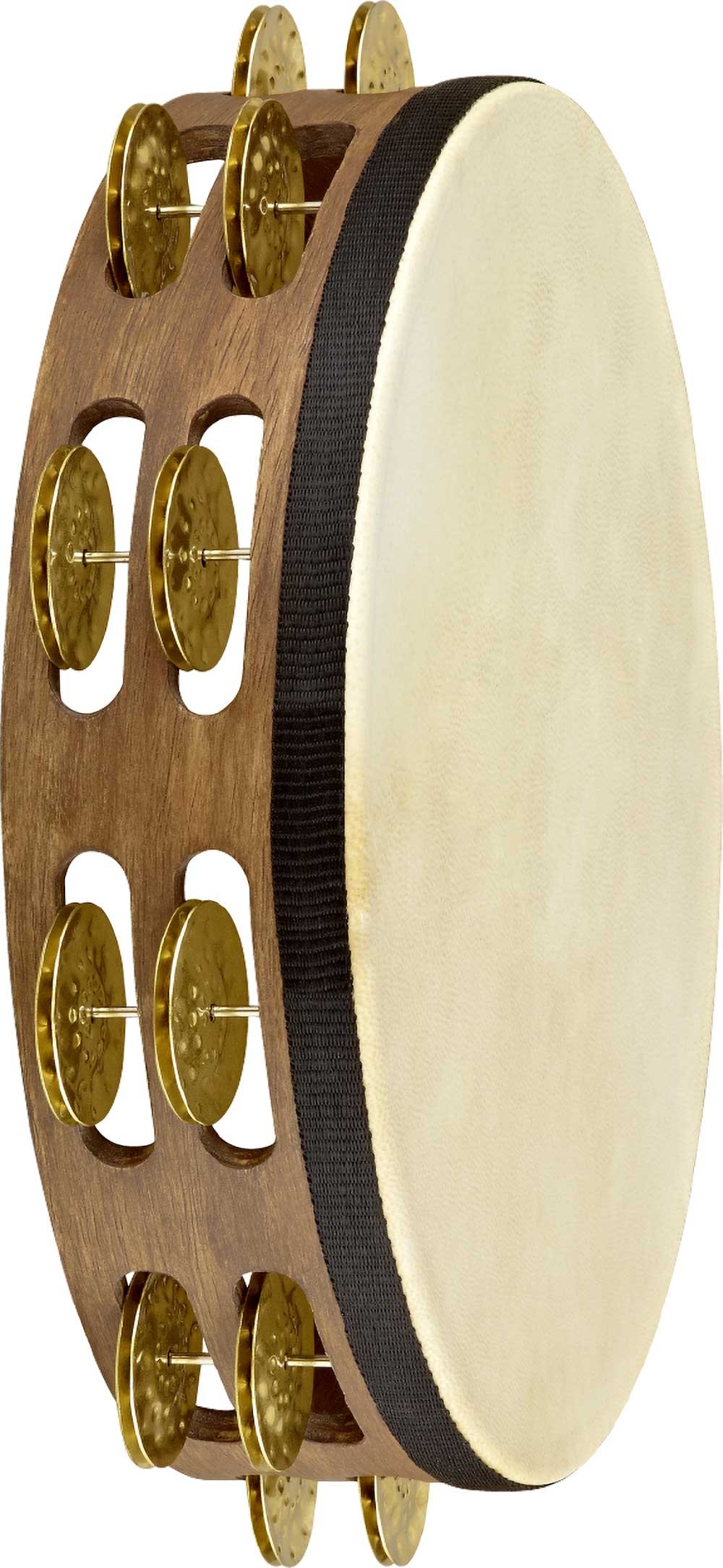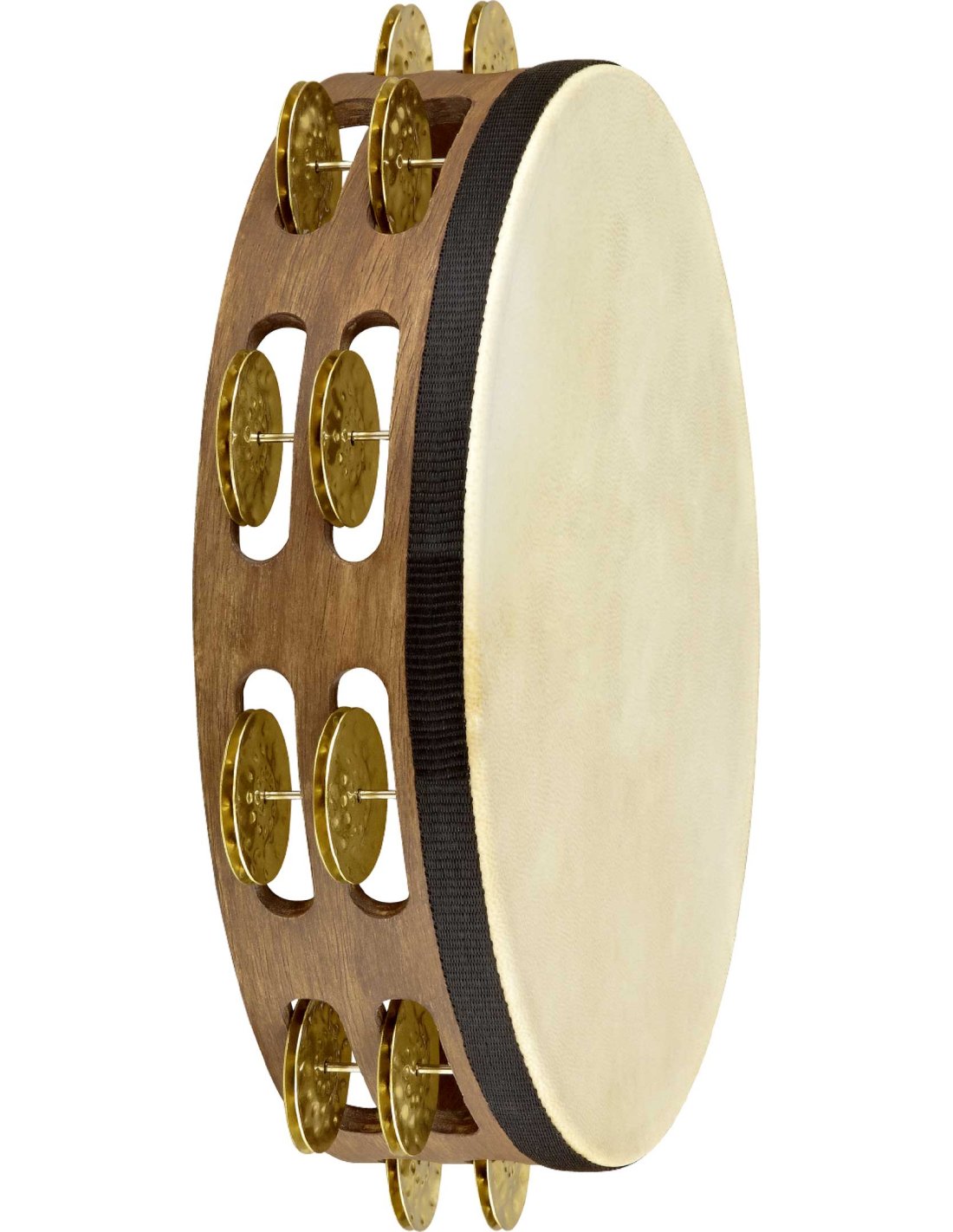 '10'' Holz-Tamburello mit vorgepresstem Naturkopf und 2 Reihen aus gehämmertem Messing. Holz-Tamburello mit einem Durchmesser von 25,4 cm. Vintage-Design, Walnussbraune Oberfläche.