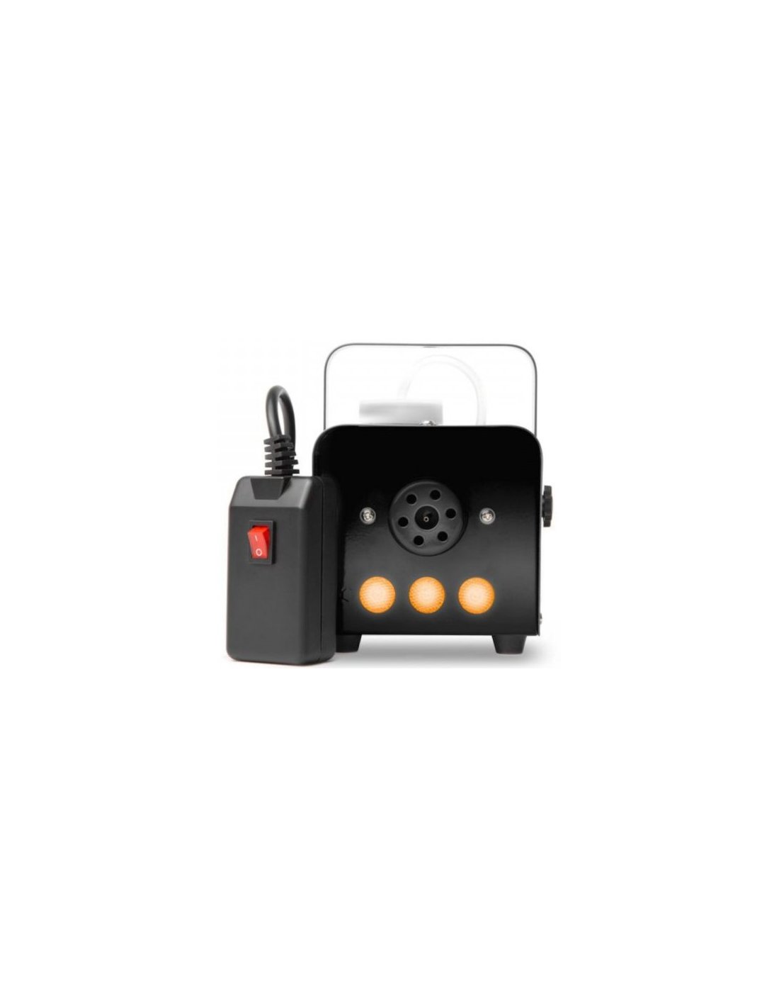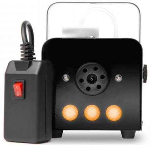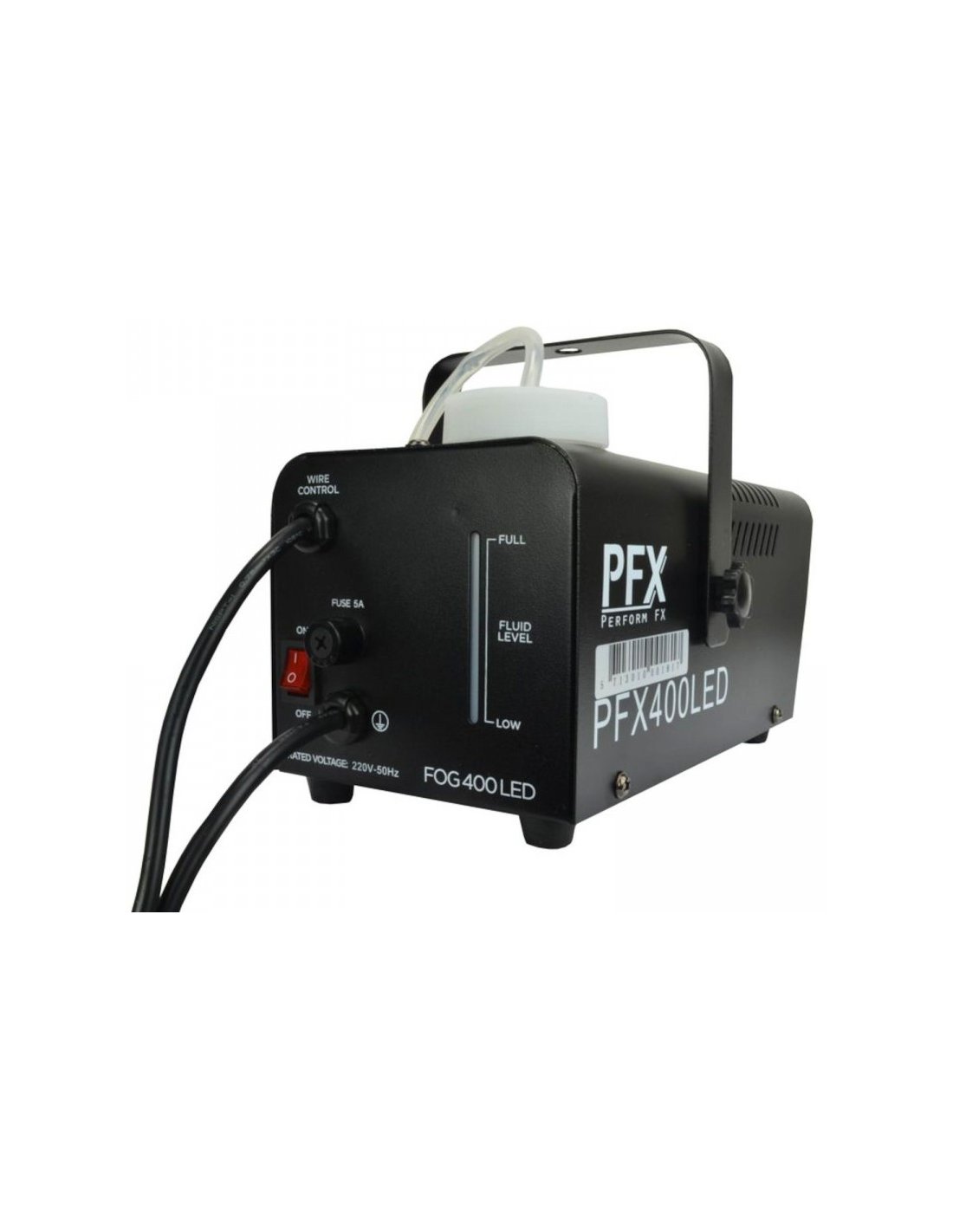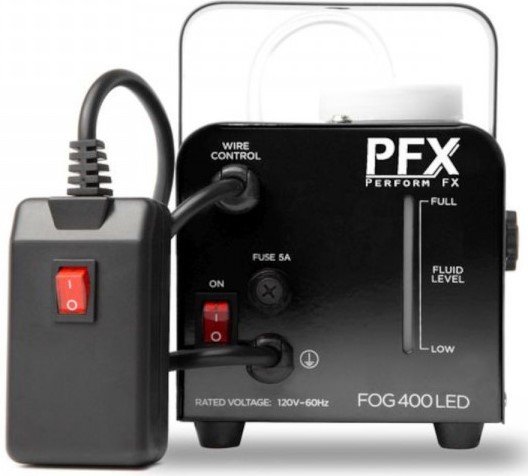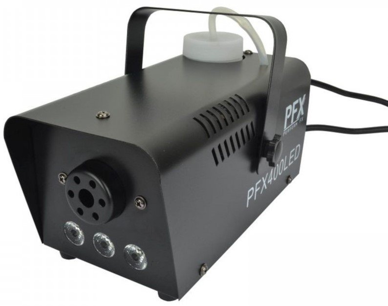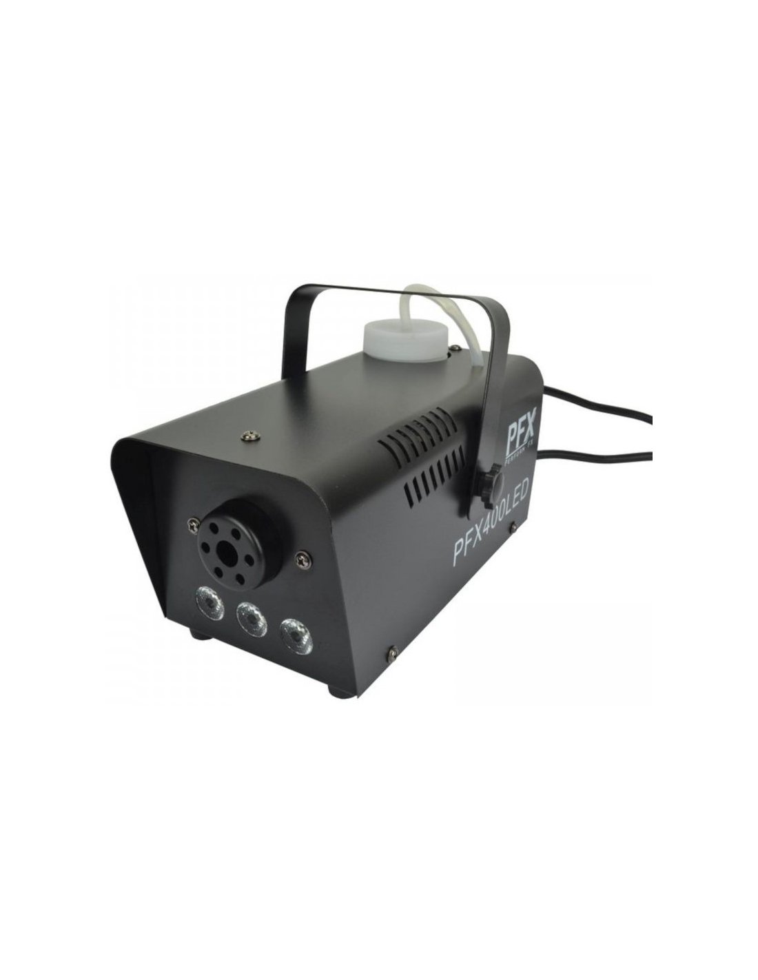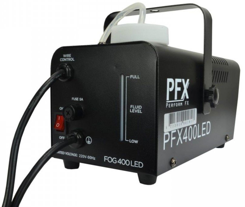 ATOMIC4DJ PFX400LED. Nebelmaschine mit 3 LEDs für farbige Nebeleffekte. Die technischen Merkmale umfassen die Fernbedienung über ein Kabel mit On/Off-Fernbedienung, ein Thermostat mit Überhitzungsschutz, 450W Heizleistung, einen Flüssigkeitsbehälter von 0,3l, 3 frontale LEDs in Amber-Farbe. Befestigungsbügel zur Aufhängung enthalten.