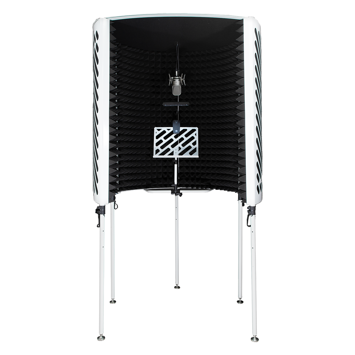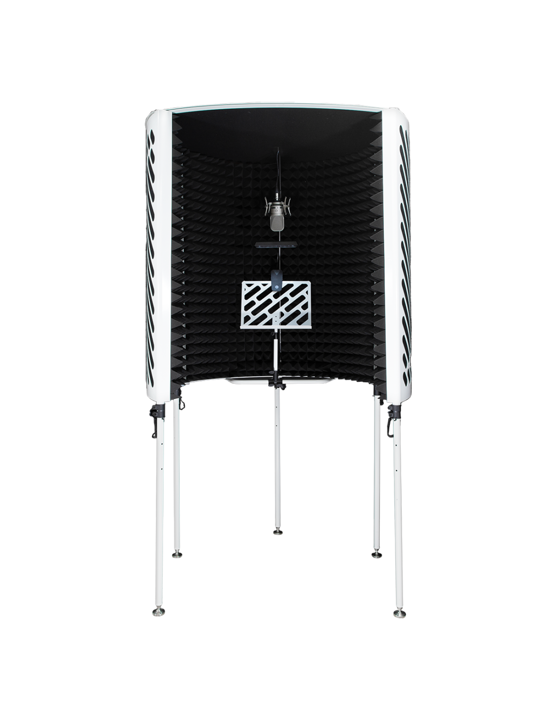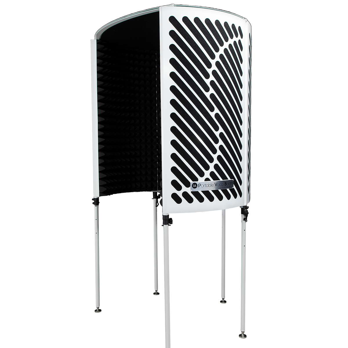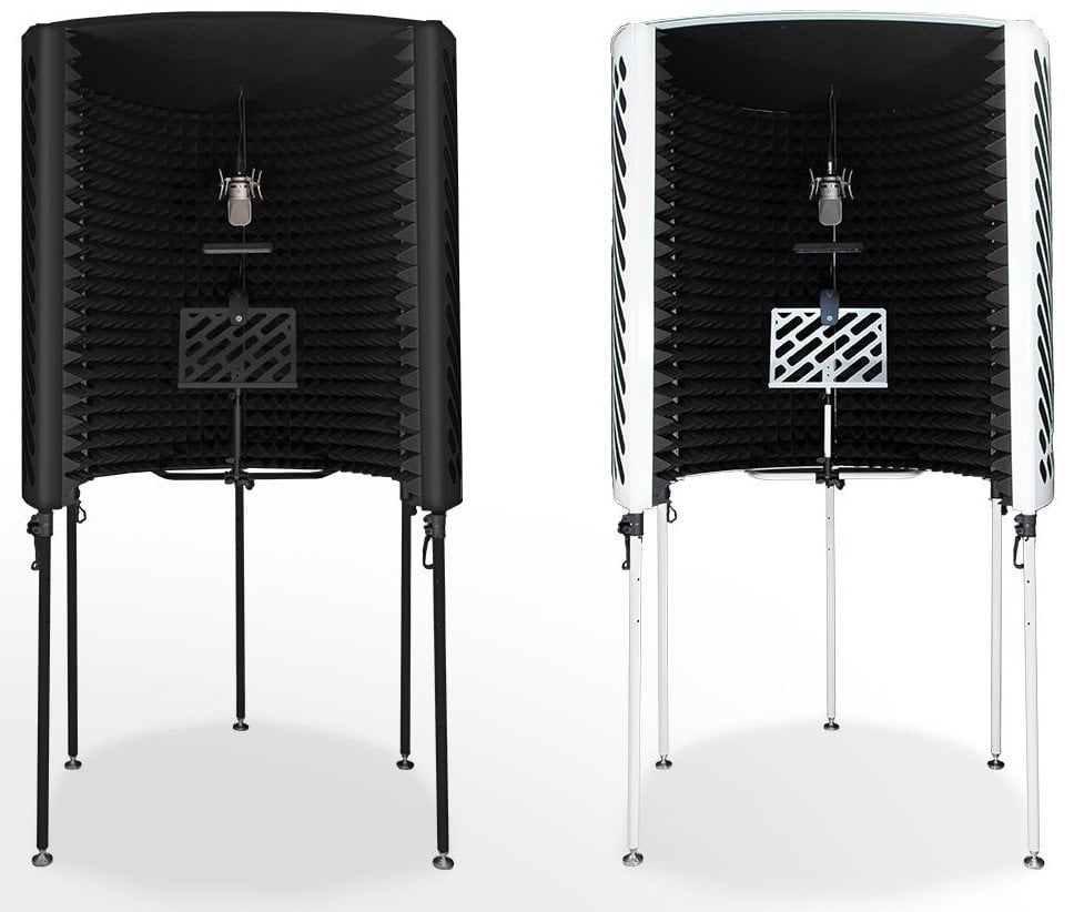 IMPERATIVE AUDIO PORTABLE VOCAL BOOTH WEISS. Offene akustische Kabine mit teleskopischen und höhenverstellbaren Füßen bis zu 210 cm, Mikrofonhalter, vorinstalliertes Notenpult und LED-Lampe, Innenauskleidung aus schallabsorbierendem Schaum. Inklusive Tragetasche.