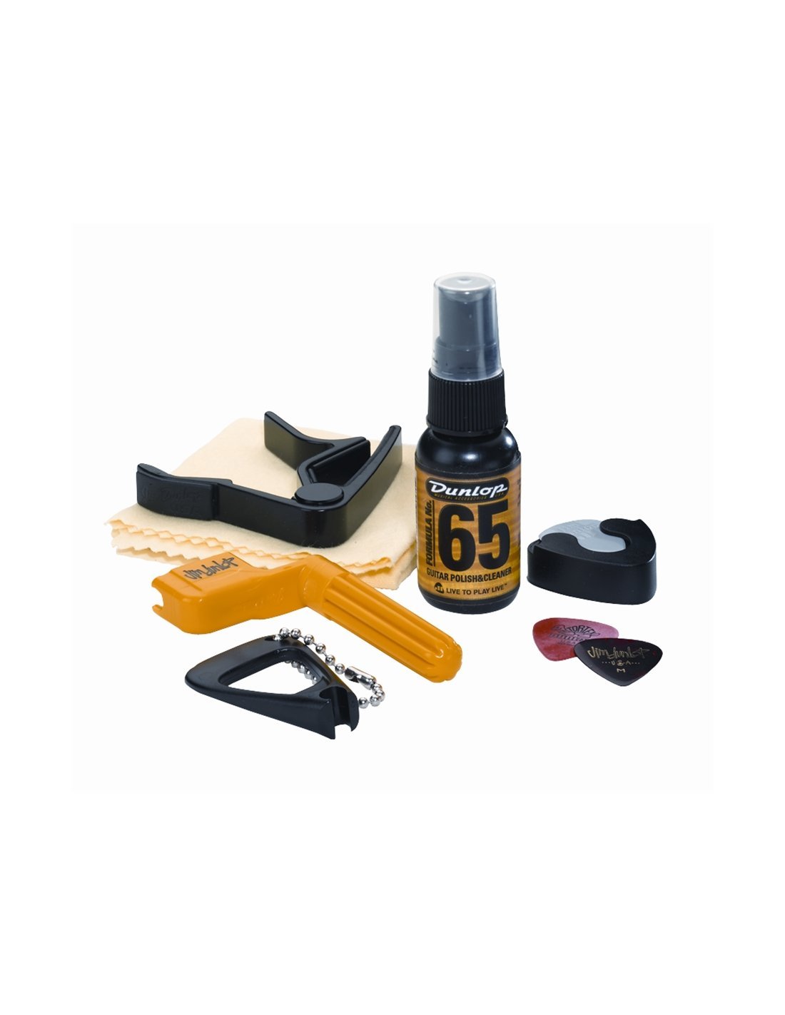 Das Kit enthält: einen Tortex-Pick .60mm, einen Nylon-Pick .60mm, einen mittleren Shell Classic-Pick, einen Pickhalter, Formula 65, ein 100% Baumwoll-Reinigungstuch, einen Saitenwickler, einen Trigger-Sattel und einen Dunlop-Korkenzieher.