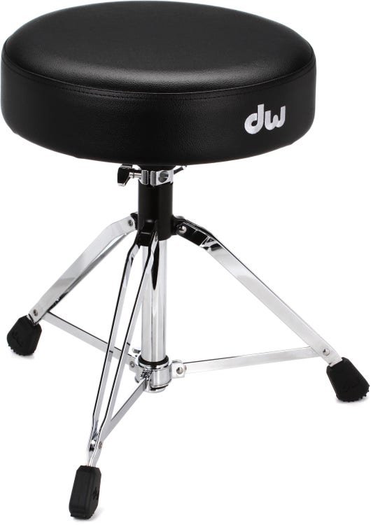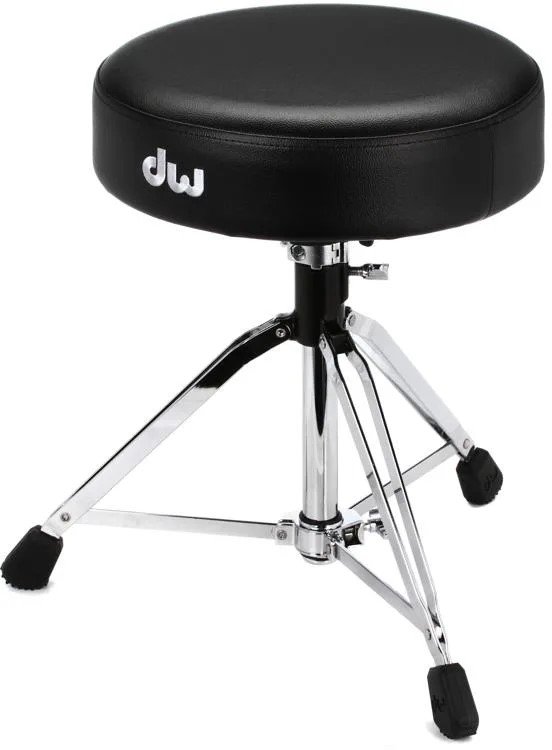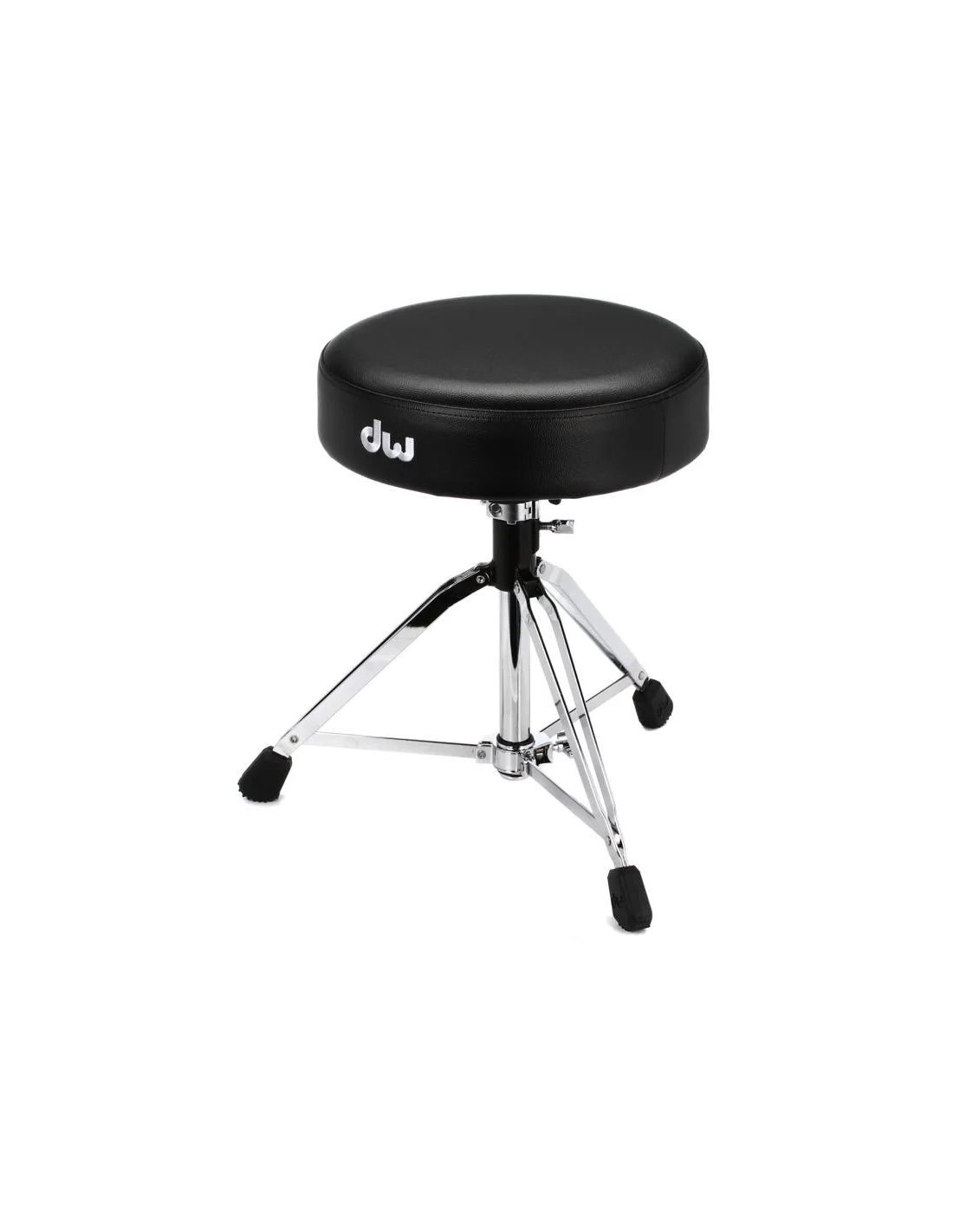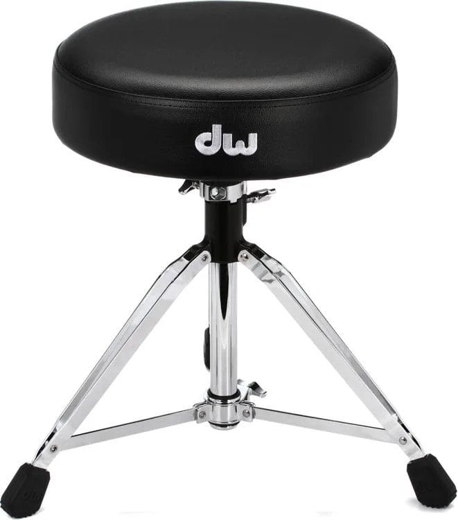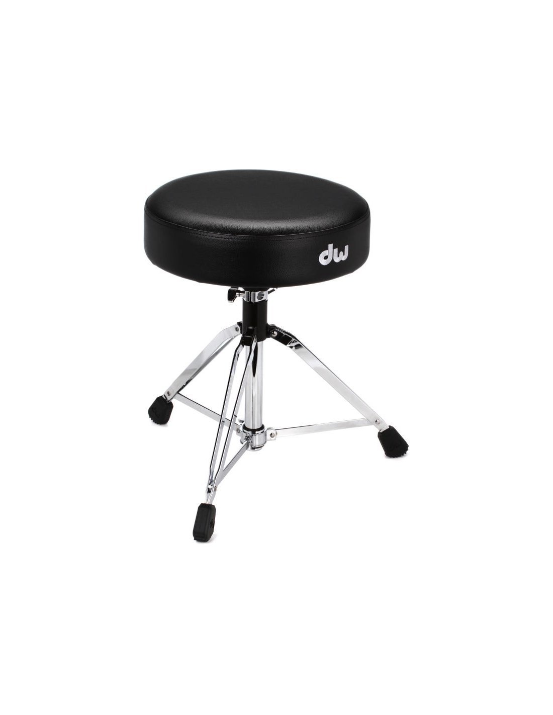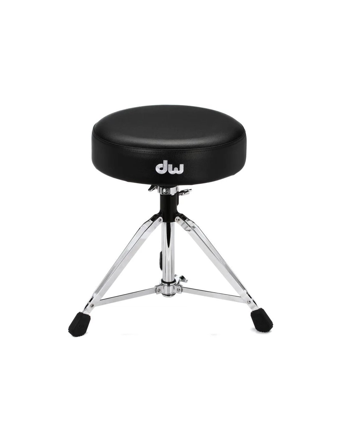 DW 9100M DRUM THRONE ist ein verstellbarer Schlagzeughocker mit 3 doppelten Beinen mit Gummifüßen, einem großen gepolsterten Sitz mit einem Durchmesser von 14", höhenverstellbar über eine Gewindestange mit Memory-Klemme, höhenverstellbar von 53 bis 74 cm