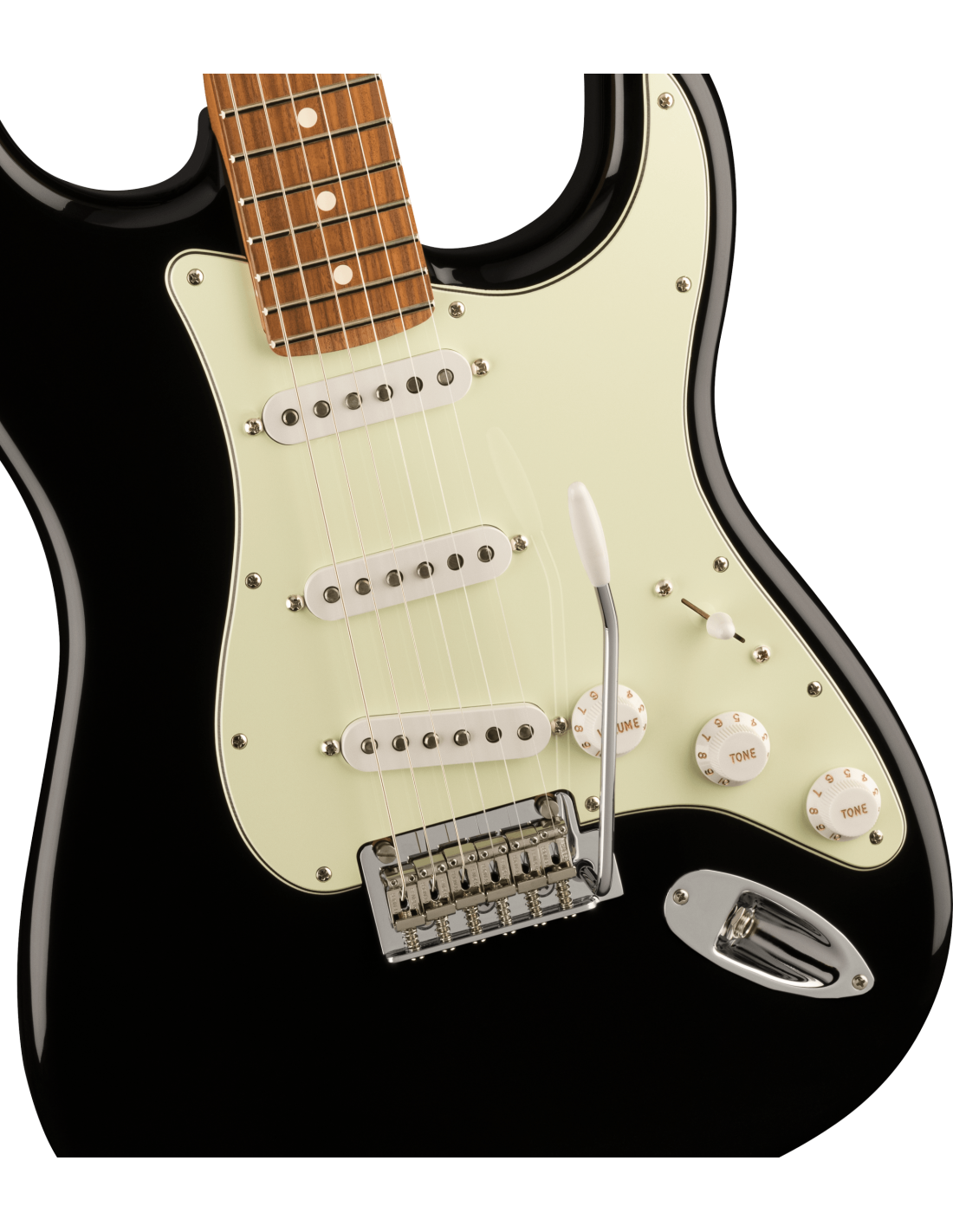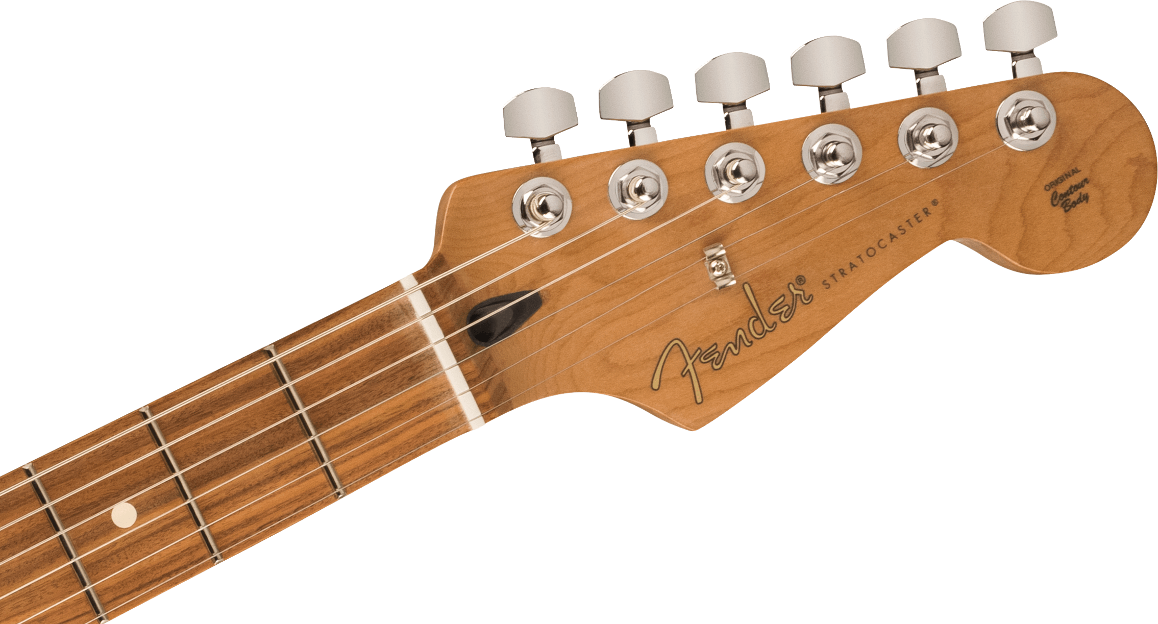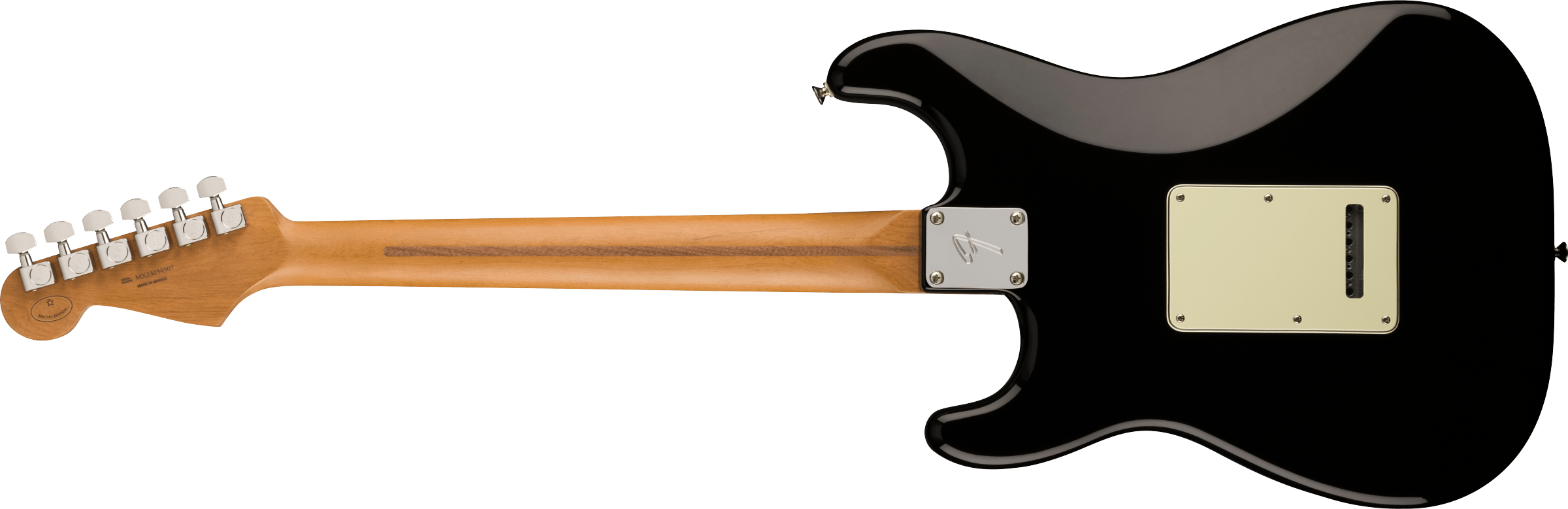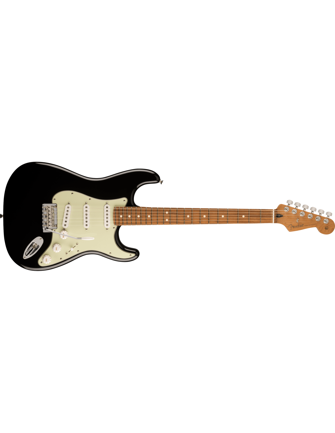 FENDER DE PLAYER STRAT ROASTED PF BLACK ist eine E-Gitarre mit solidem Korpus, Modell Limited Edition Player Stratocaster, mit Korpus aus Alder (Erle) und Gloss Polyester-Finish, Roasted Ahornhals mit Modern "C"-Profil, Pau Ferro-Griffbrett mit 9,5" Radius, 22 Medium Jumbo-Bünden und Clay Dots-Inlays, Standard Truss Rod, synthetischer Knochen-Sattel, vernickeltes Hardware, Fender Standard Cast/Sealed Mechaniken mit Dual Wing Saitenhalter und Fender 2-Punkte Synchronized Tremolo mit gebogenen Stahl-Saitenreitern. Die Elektronik mit SSS-Konfiguration besteht aus 3 Custom Shop Fat '60s Single-Coil Strat-Tonabnehmern mit mittlerem RWRP-Tonabnehmer, Master Volume-Regler, 2 Tone-Reglern und einem 5-Wege-Tonabnehmer-Schalter.