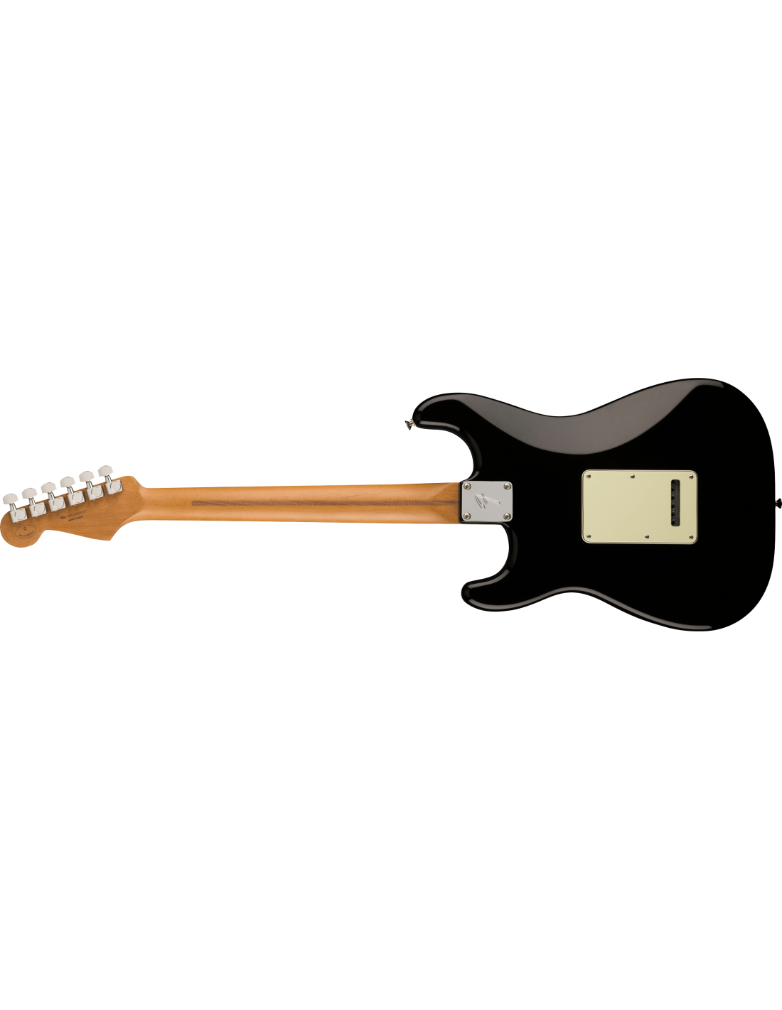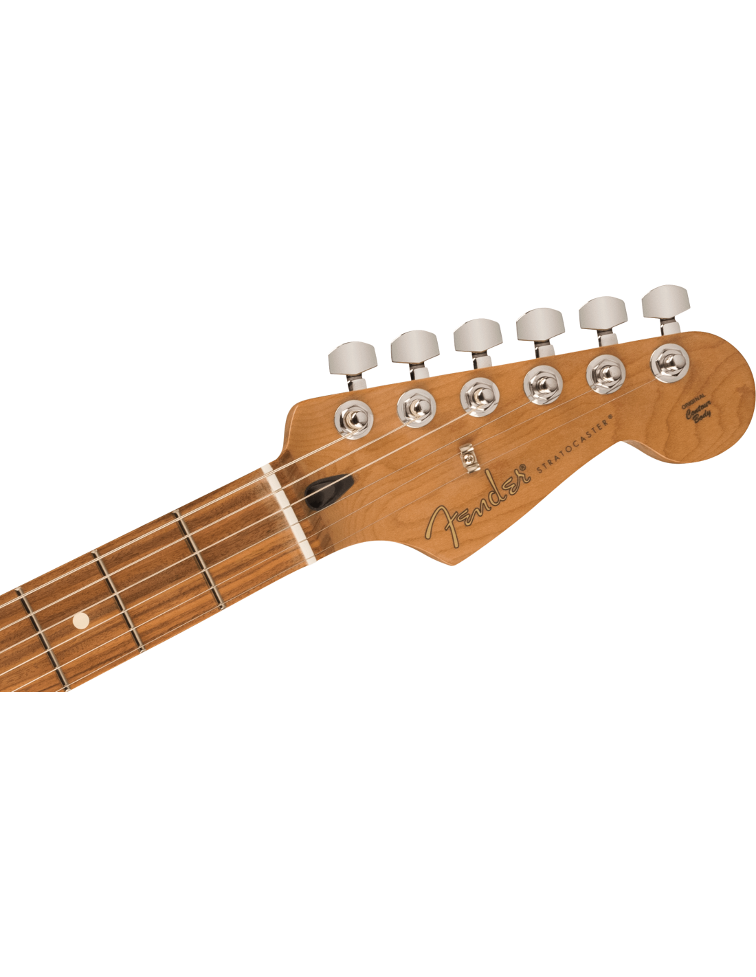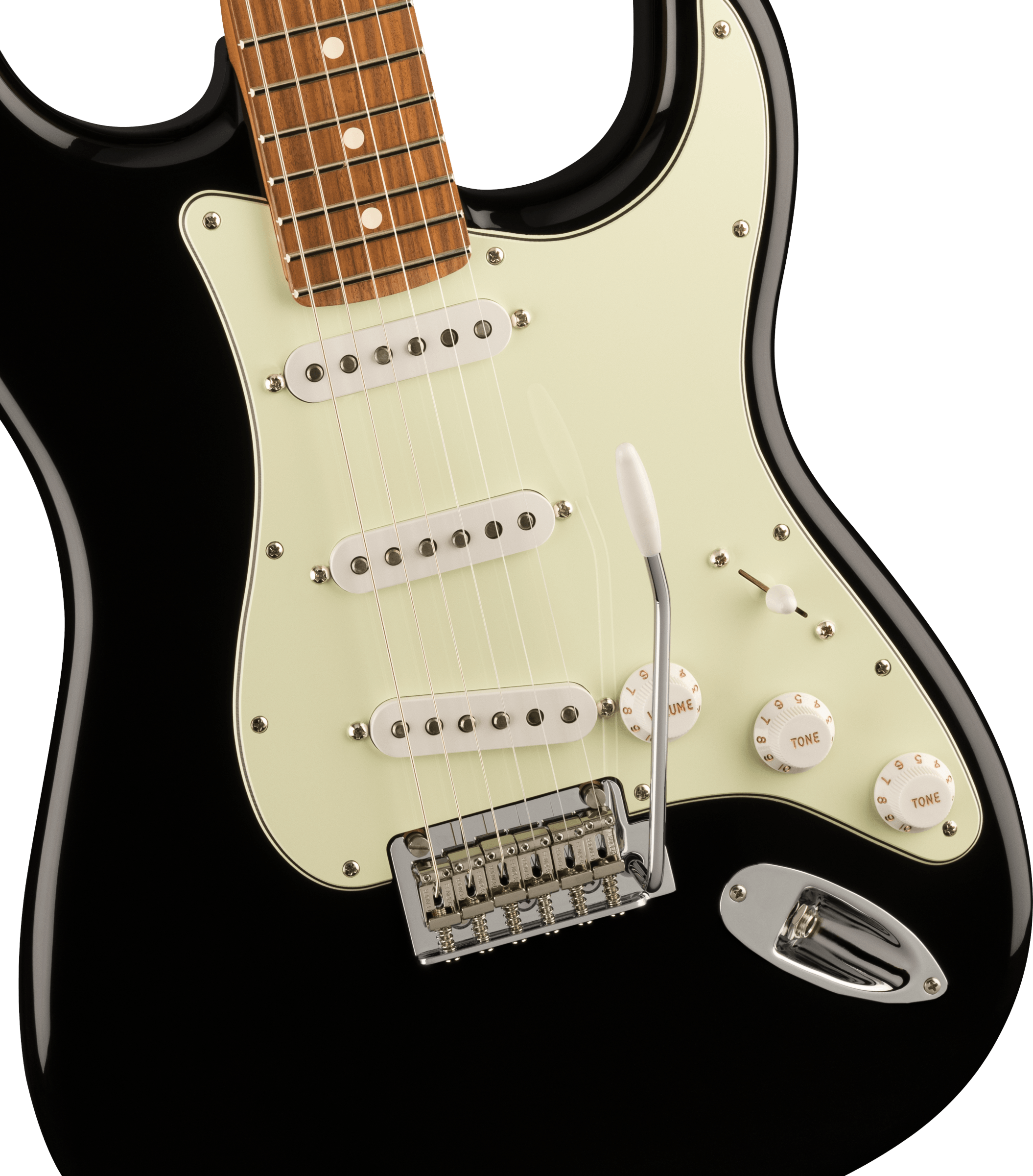 FENDER DE PLAYER STRAT ROASTED PF BLACK ist eine E-Gitarre mit solidem Korpus, Modell Limited Edition Player Stratocaster, mit Korpus aus Alder (Erle) und Gloss Polyester-Finish, Roasted Ahornhals mit Modern "C"-Profil, Pau Ferro-Griffbrett mit 9,5" Radius, 22 Medium Jumbo-Bünden und Clay Dots-Inlays, Standard Truss Rod, synthetischer Knochen-Sattel, vernickeltes Hardware, Fender Standard Cast/Sealed Mechaniken mit Dual Wing Saitenhalter und Fender 2-Punkte Synchronized Tremolo mit gebogenen Stahl-Saitenreitern. Die Elektronik mit SSS-Konfiguration besteht aus 3 Custom Shop Fat '60s Single-Coil Strat-Tonabnehmern mit mittlerem RWRP-Tonabnehmer, Master Volume-Regler, 2 Tone-Reglern und einem 5-Wege-Tonabnehmer-Schalter.