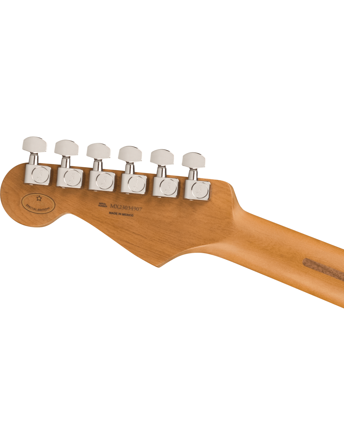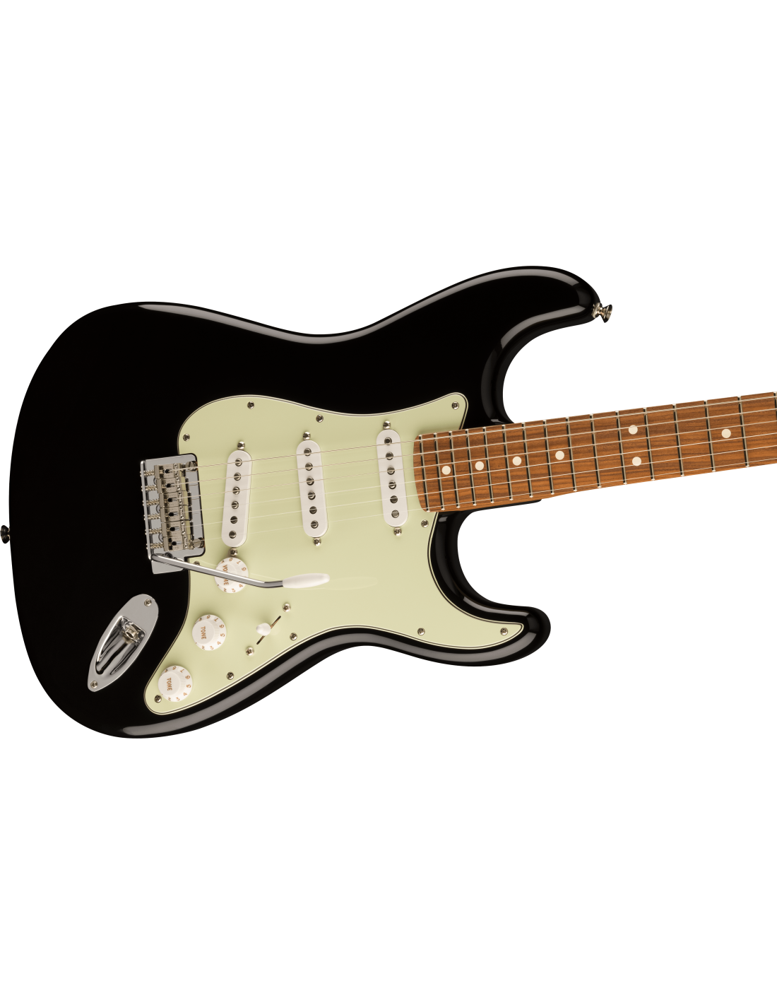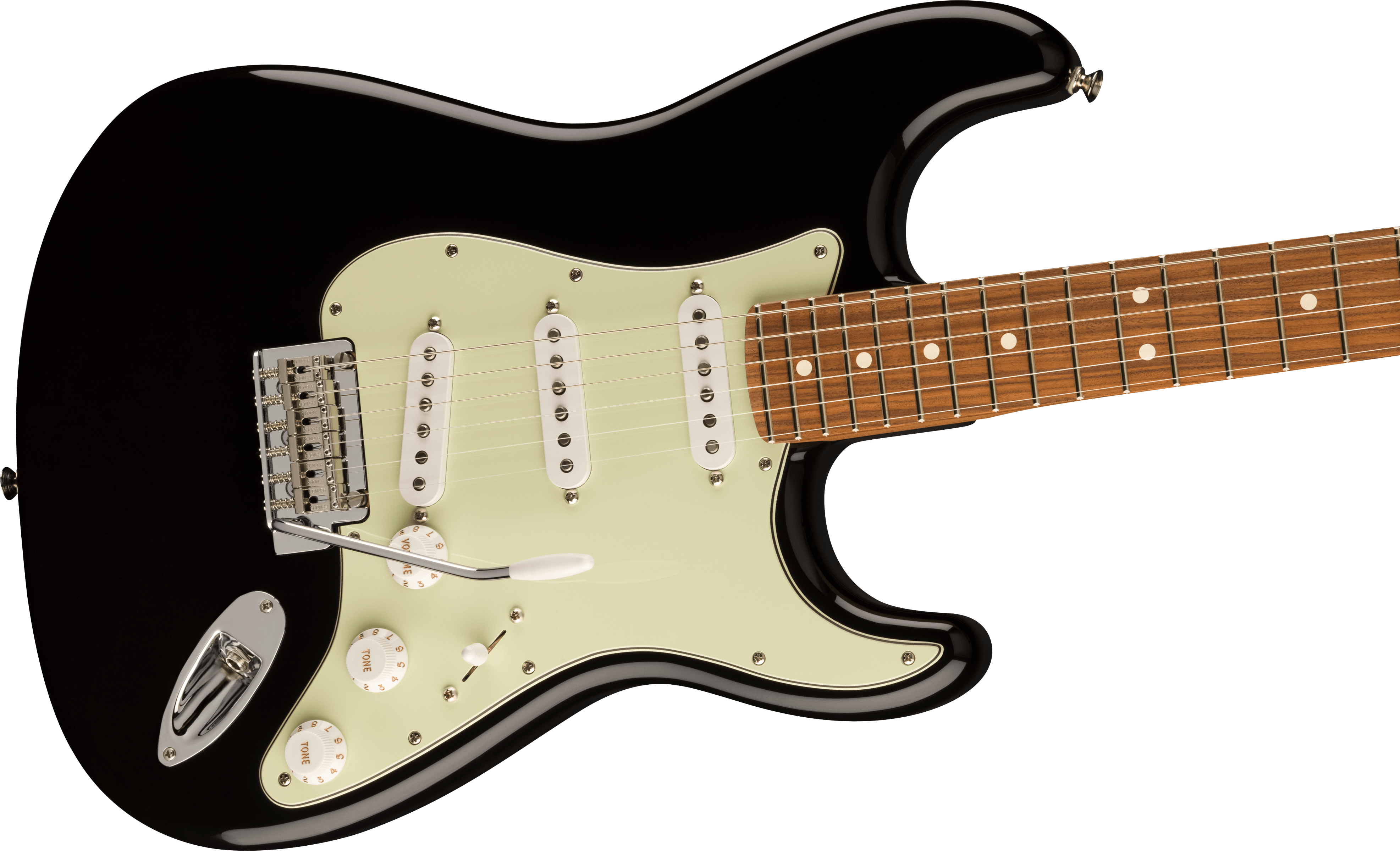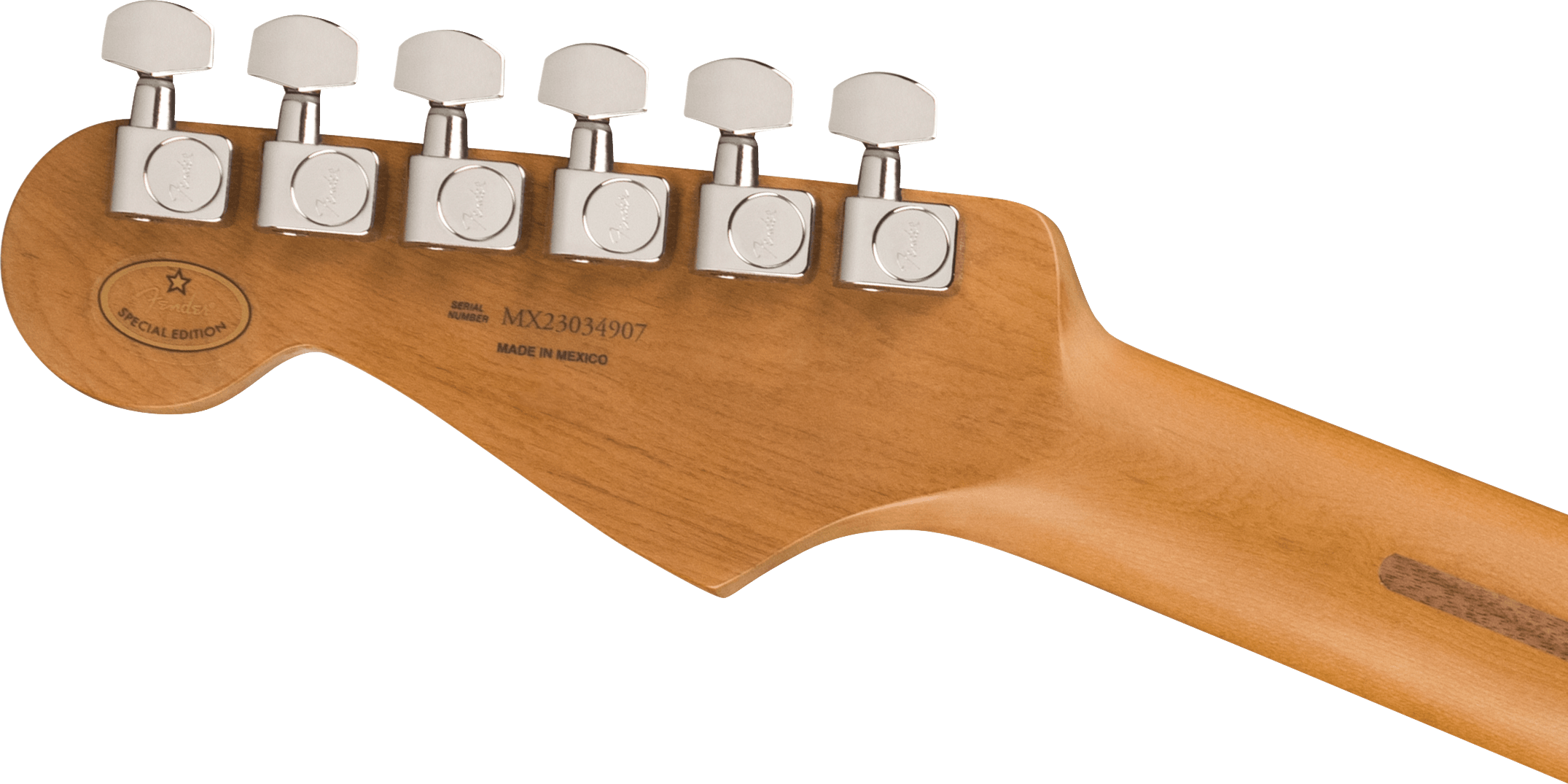 FENDER DE PLAYER STRAT ROASTED PF BLACK ist eine E-Gitarre mit solidem Korpus, Modell Limited Edition Player Stratocaster, mit Korpus aus Alder (Erle) und Gloss Polyester-Finish, Roasted Ahornhals mit Modern "C"-Profil, Pau Ferro-Griffbrett mit 9,5" Radius, 22 Medium Jumbo-Bünden und Clay Dots-Inlays, Standard Truss Rod, synthetischer Knochen-Sattel, vernickeltes Hardware, Fender Standard Cast/Sealed Mechaniken mit Dual Wing Saitenhalter und Fender 2-Punkte Synchronized Tremolo mit gebogenen Stahl-Saitenreitern. Die Elektronik mit SSS-Konfiguration besteht aus 3 Custom Shop Fat '60s Single-Coil Strat-Tonabnehmern mit mittlerem RWRP-Tonabnehmer, Master Volume-Regler, 2 Tone-Reglern und einem 5-Wege-Tonabnehmer-Schalter.