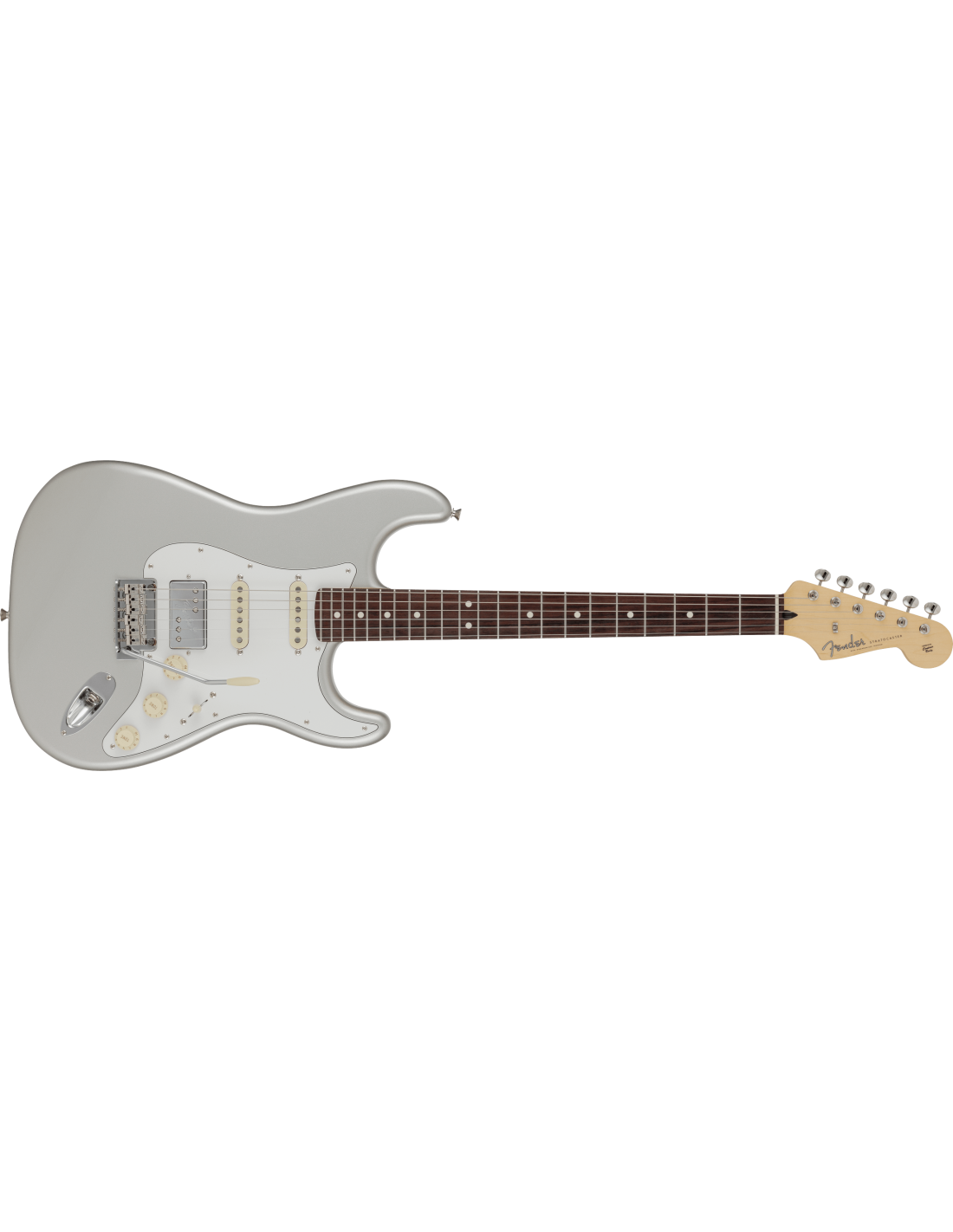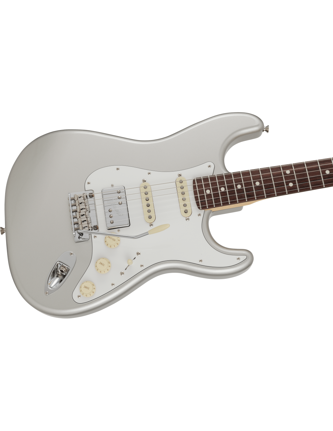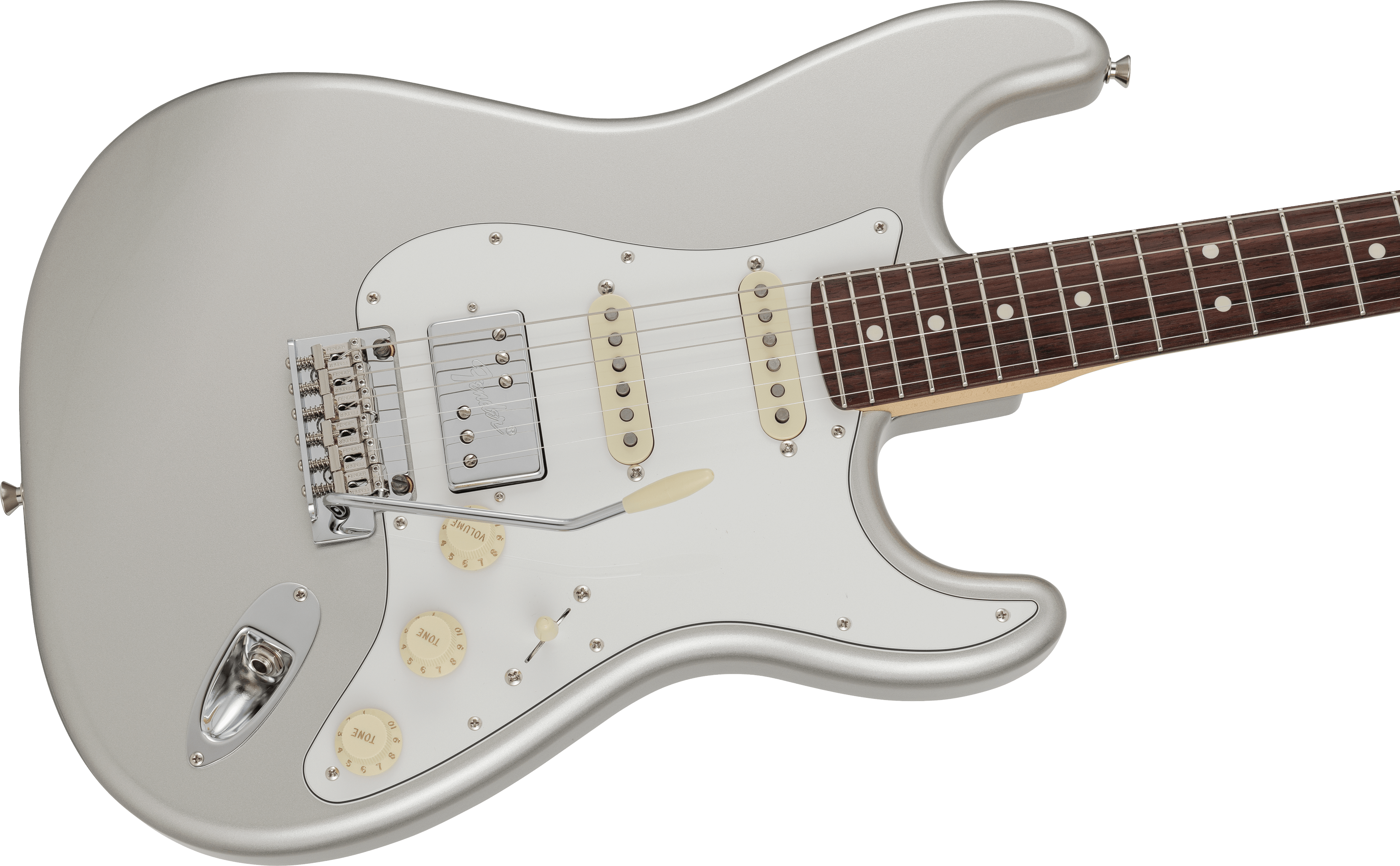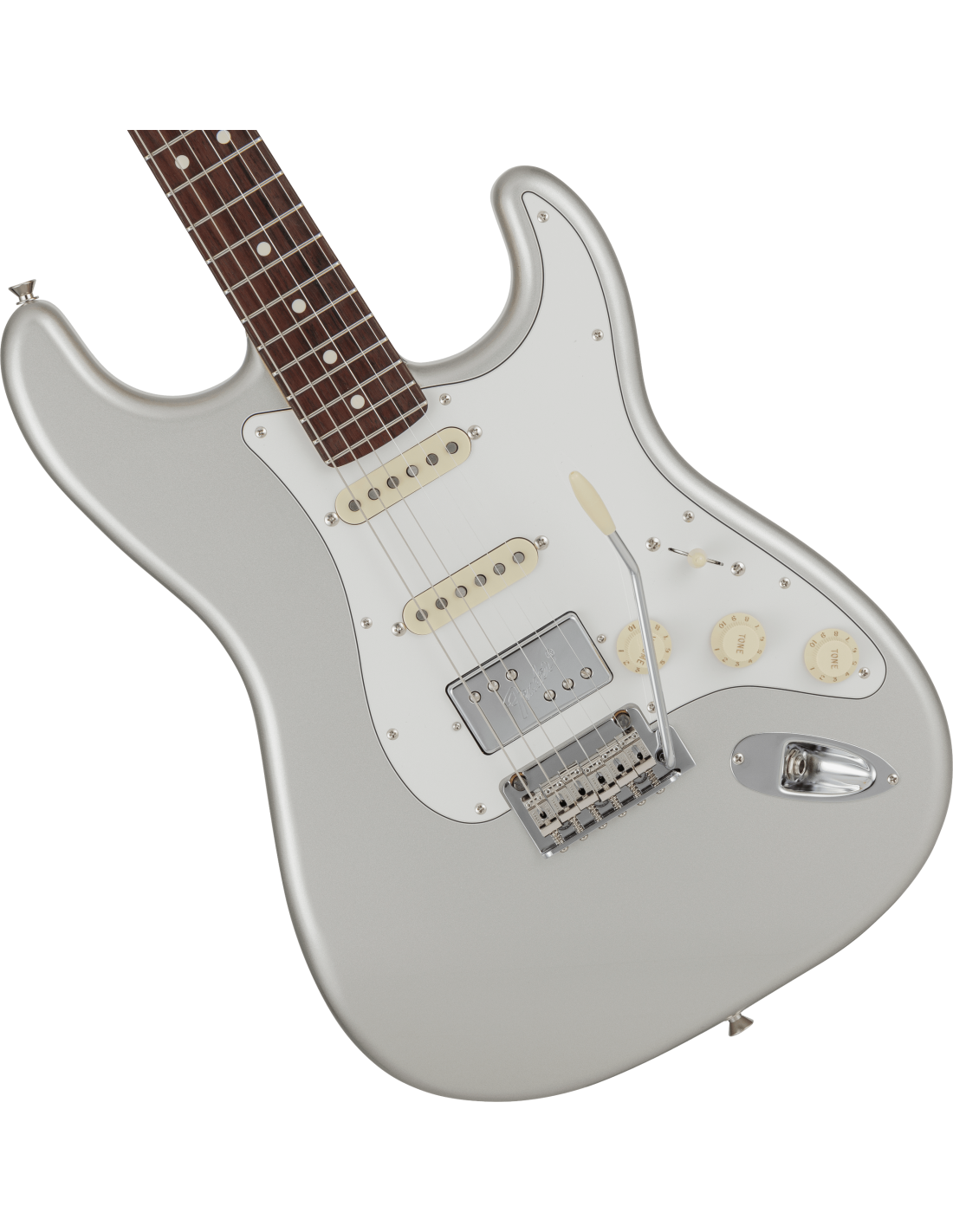 FENDER LTD HYBRID STRAT HSS RW INCA SILVER ist eine E-Gitarre mit solidem Korpus, Modell Made in Japan Hybrid II Stratocaster HSS, mit Korpus aus Erle und Hochglanz-Urethan-Finish, Ahornhals im modernen C-Profil, Palisandergriffbrett mit 9,5" Radius und 22 Narrow Tall Bünden sowie White Dots Einlagen, Sattel aus Knochen, verchromte Hardware, Fender Vintage-Style Locking Mechaniken, synchronisiertes Tremolo mit 2 Punkten und Vintage-Stil Stahl-Sattel sowie Eggshell Schlagbrett. Die Elektronik mit HHS-Konfiguration besteht aus einem ShawBucker Humbucker am Steg und zwei Hybrid II Custom Voiced Single Coil Stratocaster-Pickups in der Mitte und am Hals mit Master Volume, 2 Tone-Reglern und einem 5-Wege-Pickup-Wahlschalter.