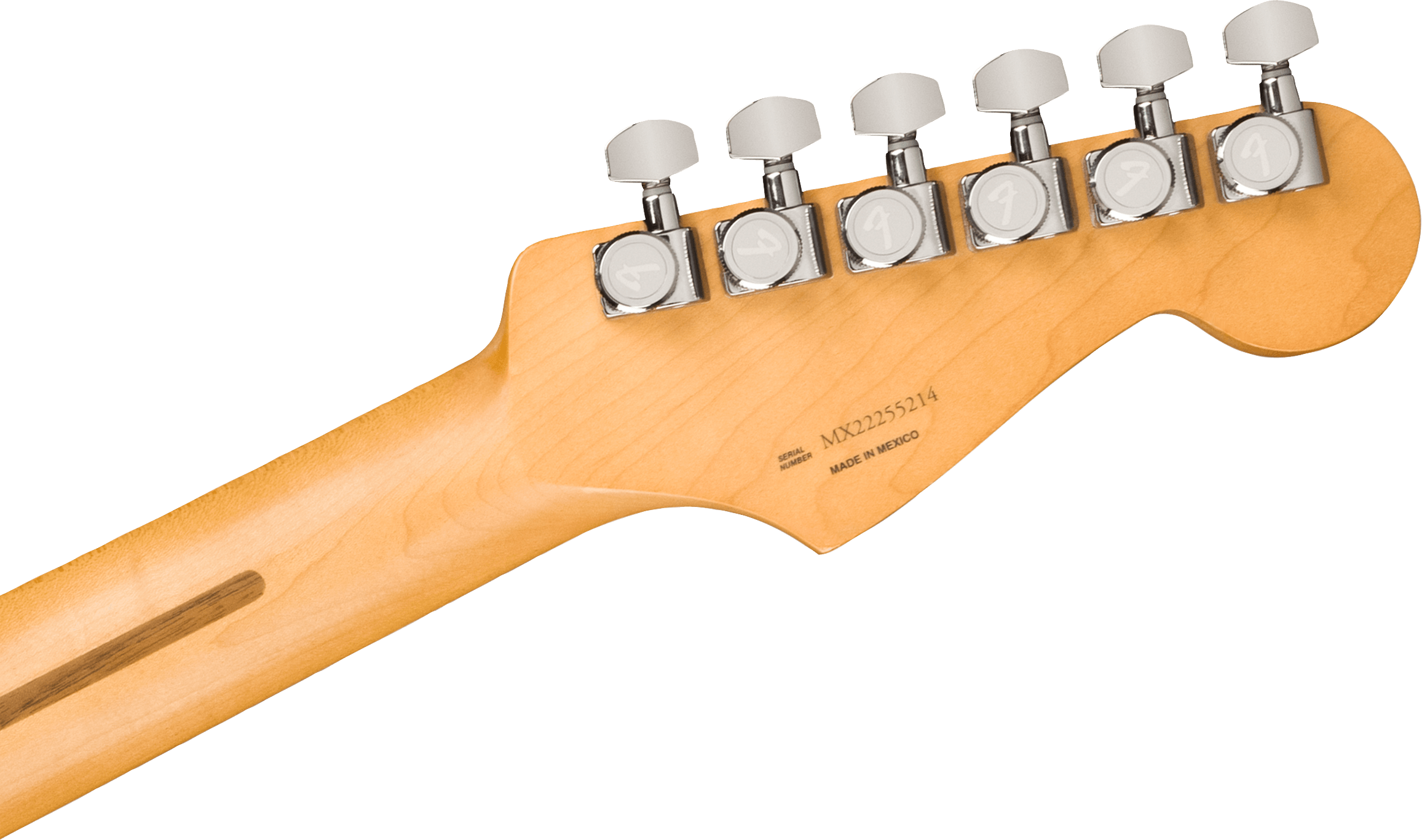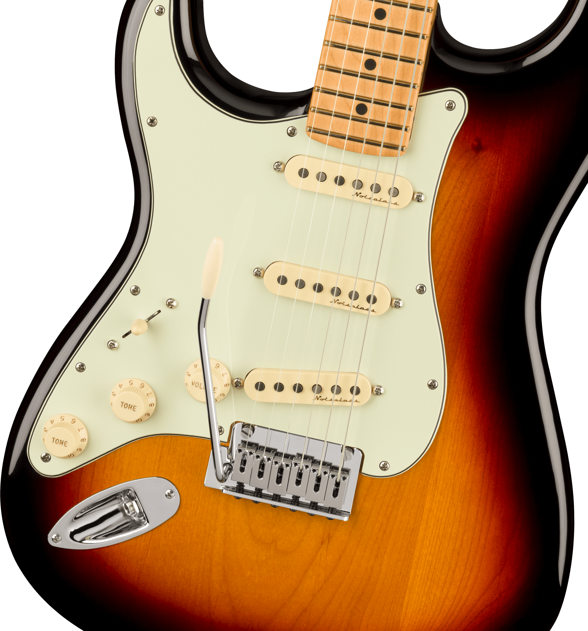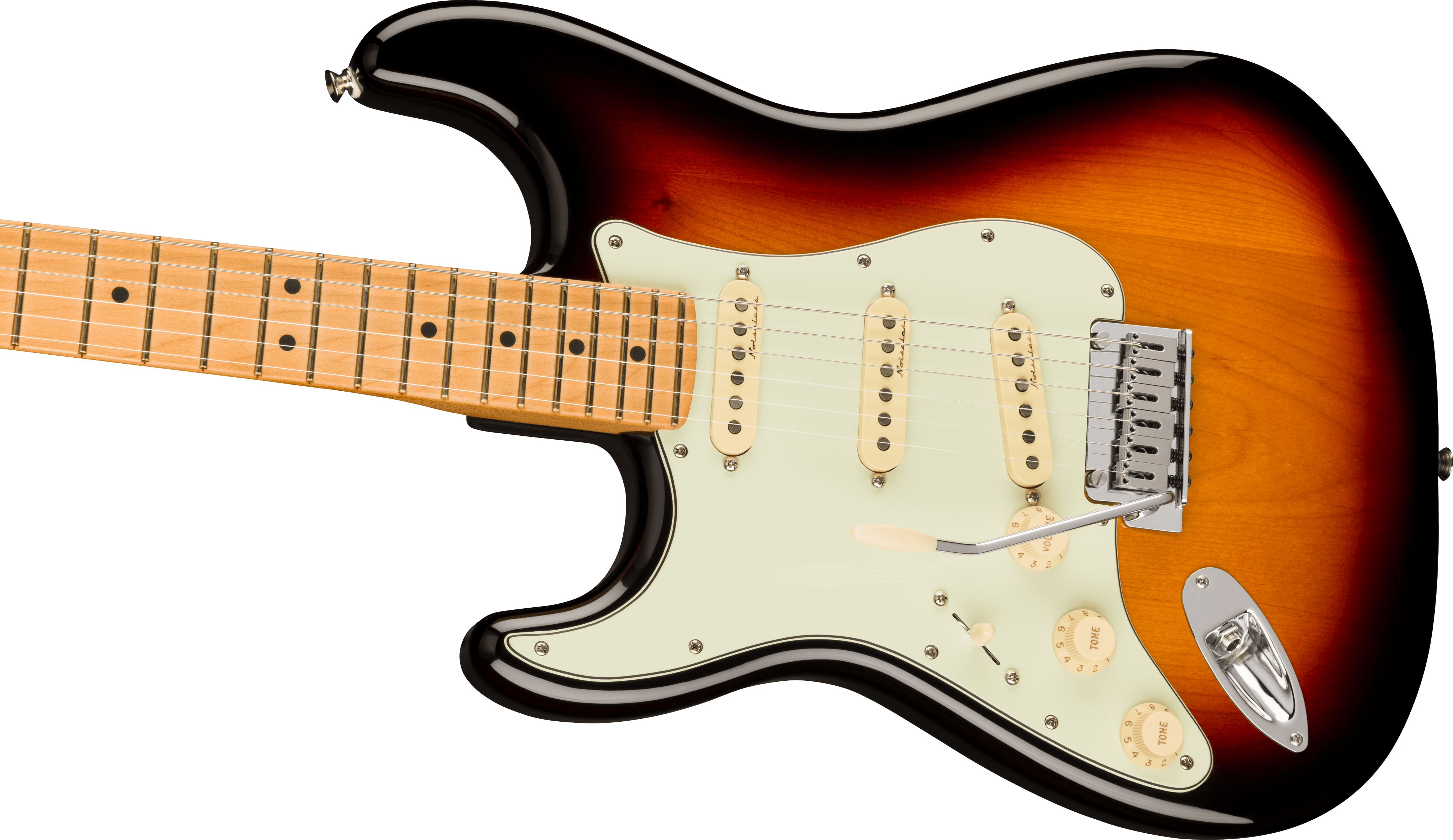 FENDER PLAYER PLUS STRAT LINKSHÄNDIG MN 3TSB ist eine linkshändige Solid Body E-Gitarre, Modell Player Plus Stratocaster Linkshändig, mit einem Korpus aus Erle und einer Hochglanz-Polyester-Oberfläche, einem Ahornhals im Modern C-Profil, einem Ahorngriffbrett mit 12" Radius, 22 Medium Jumbo Bünden und Black Dots Einlagen, einem Sattel aus synthetischem Knochen, verchromtem Hardware, Truss Rod Single Action Head Adjust, Fender Deluxe Cast/Sealed Locking Mechaniken, einem synchronisierten Tremolo-Brücke mit 2 Punkten und Block-Sätteln sowie einem 3-lagigen Mint Green Schlagbrett. Die Elektronik mit SSS-Konfiguration besteht aus 3 Player Plus Noiseless Strat Tonabnehmern mit Master Volume, 2 Tone-Reglern mit Push/Pull auf Tone 1, um den Hals-Tonabnehmer zu den Positionen 1&2 des Schalters hinzuzufügen, und einem 5-Wege-Tonabnehmer-Schalter.