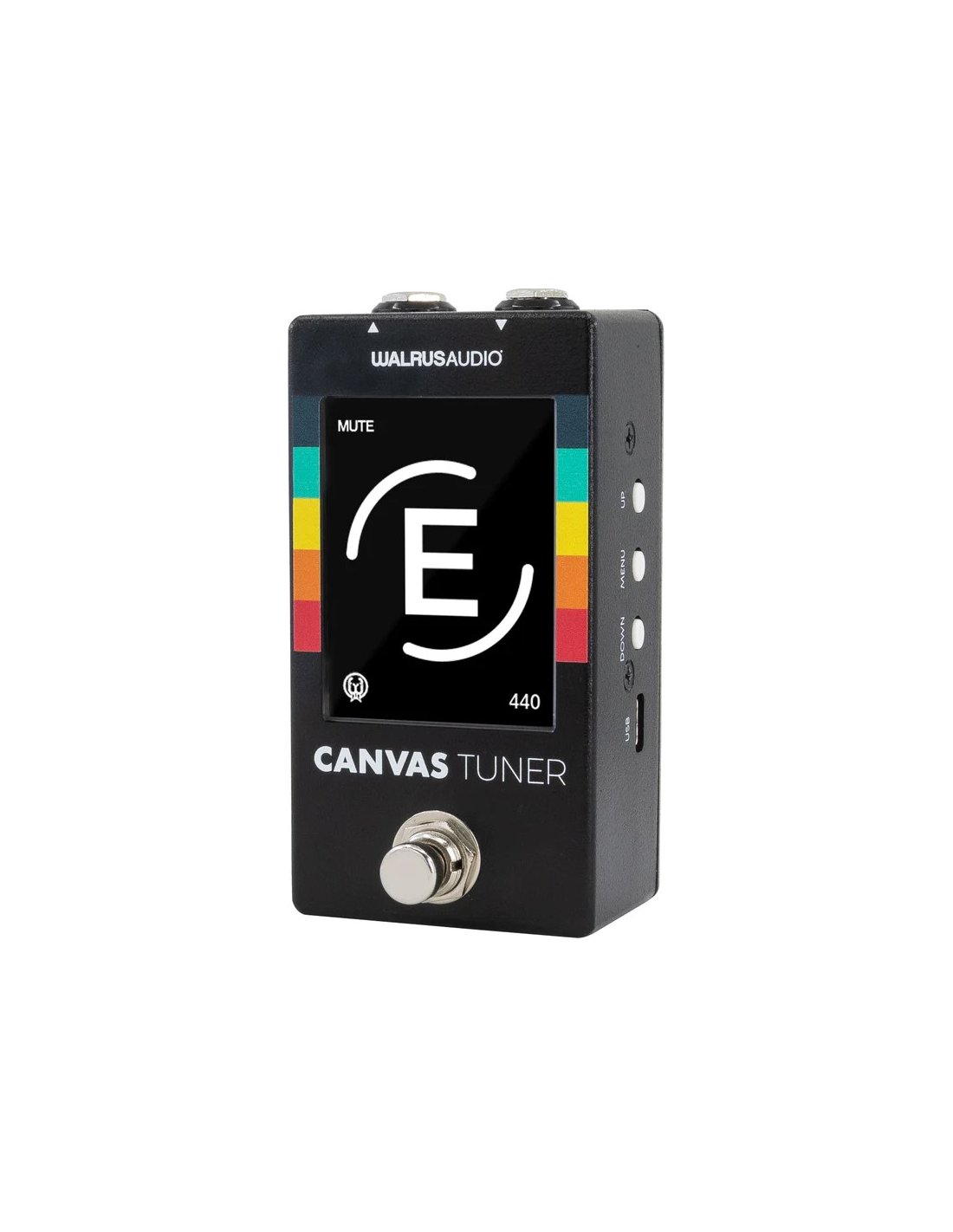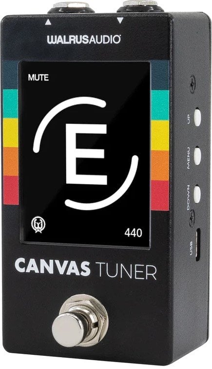 WALRUS AUDIO CANVAS TUNER ist ein Stimmgerät mit LCD-Display für Gitarre und Bass, mit einer Stimmgenauigkeit von bis zu ±0,1 Cent, 2 Stimmmodi: Needle und Strobe, drehbarem Display um 90°, 180° oder 270° für jede Positionierung auf dem Pedalboard, 4 verschiedene Bypass-Modi einschließlich True Bypass und Buffered, TrueAssist-Stimmfunktion, integrierten Stimm-Presets, USB-C-Anschluss für Firmware-Updates.