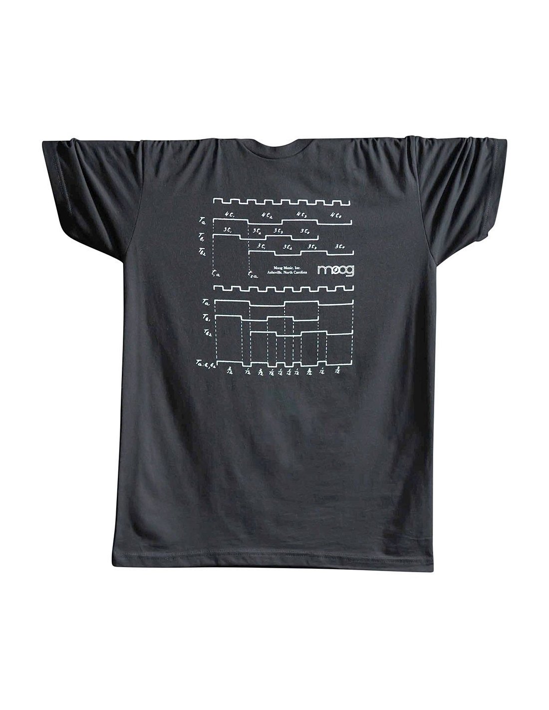 T-Shirt Moog schwarz mit Logo und Diagrammen T-Shirt schwarz mit dem Schriftzug Moog und Diagrammen. Die Musik lässt einen glauben, lebendig zu sein, weil sie sich bewegt und handelt wie eine lebende Materie.