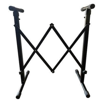MP GEAR KS037 ist ein professioneller faltbarer Ständer für Tastaturen und Live-Ausrüstung, der aus Stahl gefertigt ist, in der Höhe und Länge verstellbar ist und eine Tragfähigkeit von 50 kg hat.