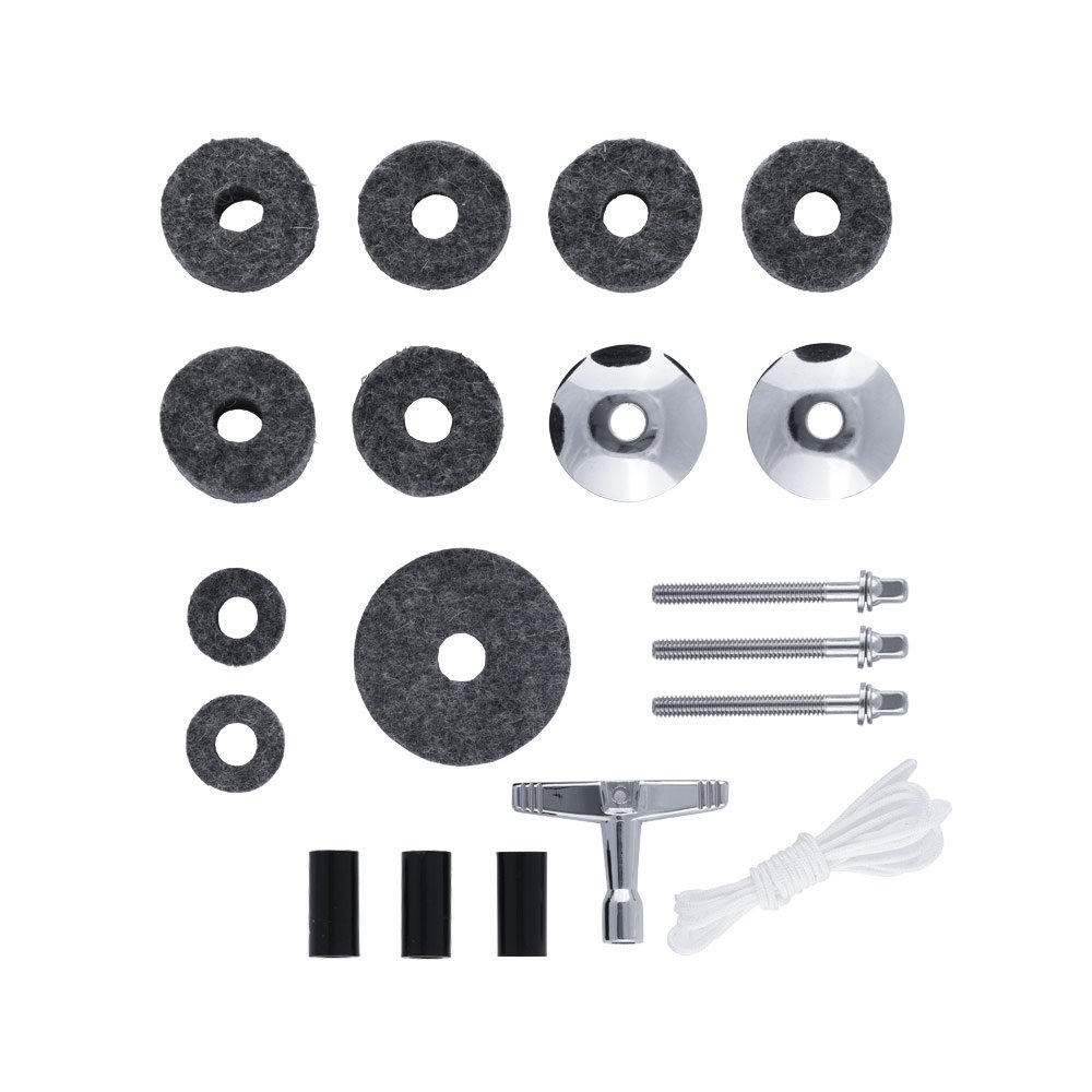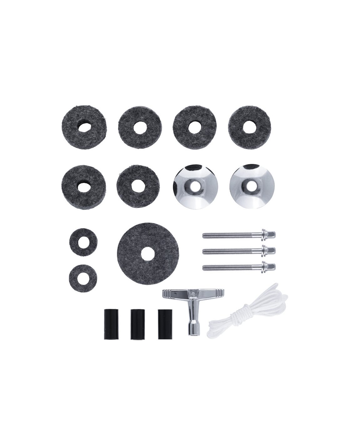 Enthält: 6x Filzunterlagen für die gerade Stange, 2x Filzunterlagen für die Hi-Hat-Clutch, 1x Filzunterlage für die untere Hi-Hat, 3x Schutzschläuche, 2x Metallplättchen für die gerade Stange, 1x Schnur für die Snare-Teppich, 1x Stimmenschlüssel, 3x Spannschrauben 52 mm