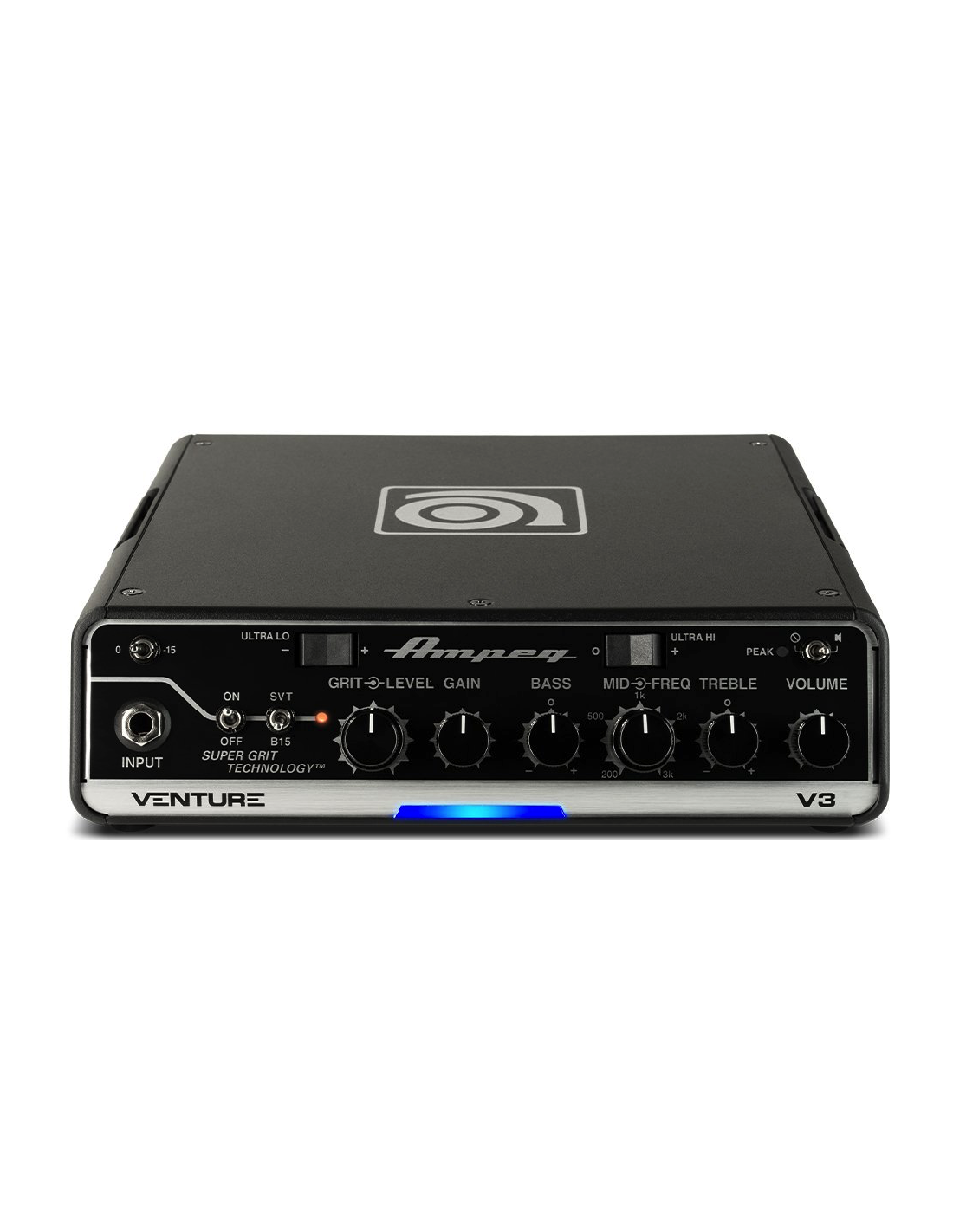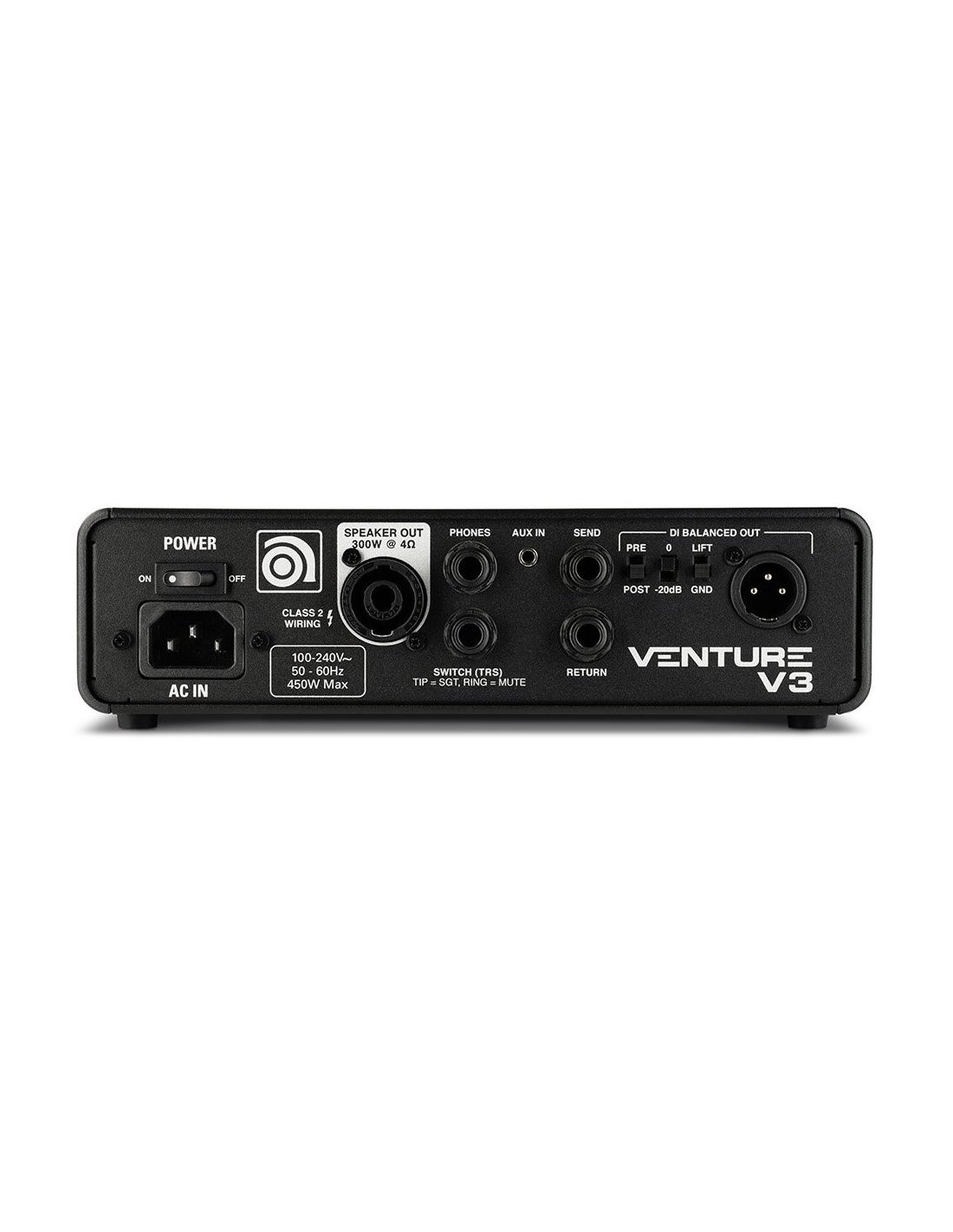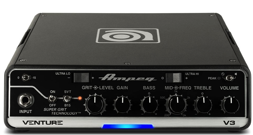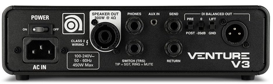 AMPEG V3 300 WATT. Verstärker für Bass mit 300W RMS-Leistung bei 4 Ohm, Legacy-Vorverstärker der Klasse D, 3-Band-Equalizer mit Höhen/Mitten/Tiefen und Mittenfrequenzwähler, integrierter Kompressor, ultra Hi/Lo Boost wählbar über 2 dedizierte Schalter, Pad-Schalter -15Db, Super Grit-Technologie mit Emulationen von Ampeg-Verstärkern SVT und B15 über Schalter. Verfügt über Anschlüsse für Fußschalter, Vorverstärker In/Out, Tuner und Fx Send/Return über 6,3mm Klinke, Lautsprecheranschlüsse über Speakon, symmetrischer Line-Out über XLR mit dedizierten Schaltern für Pre/Post Eq, Pad 0/40 Db und Ground Lift.