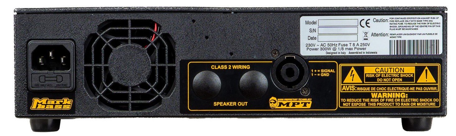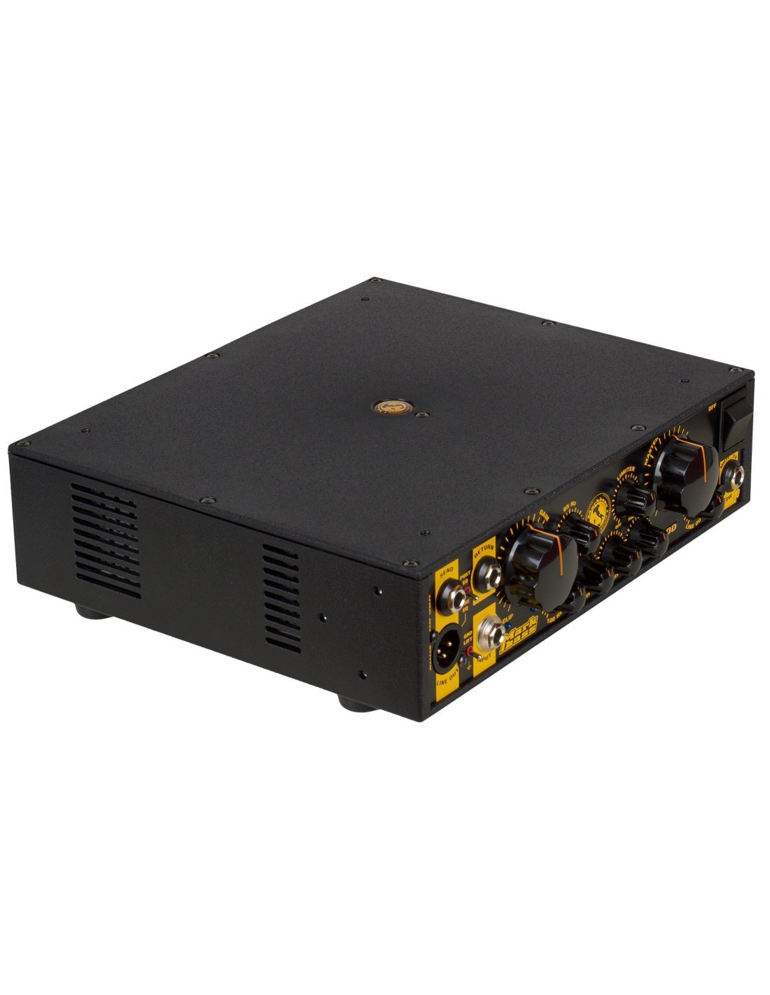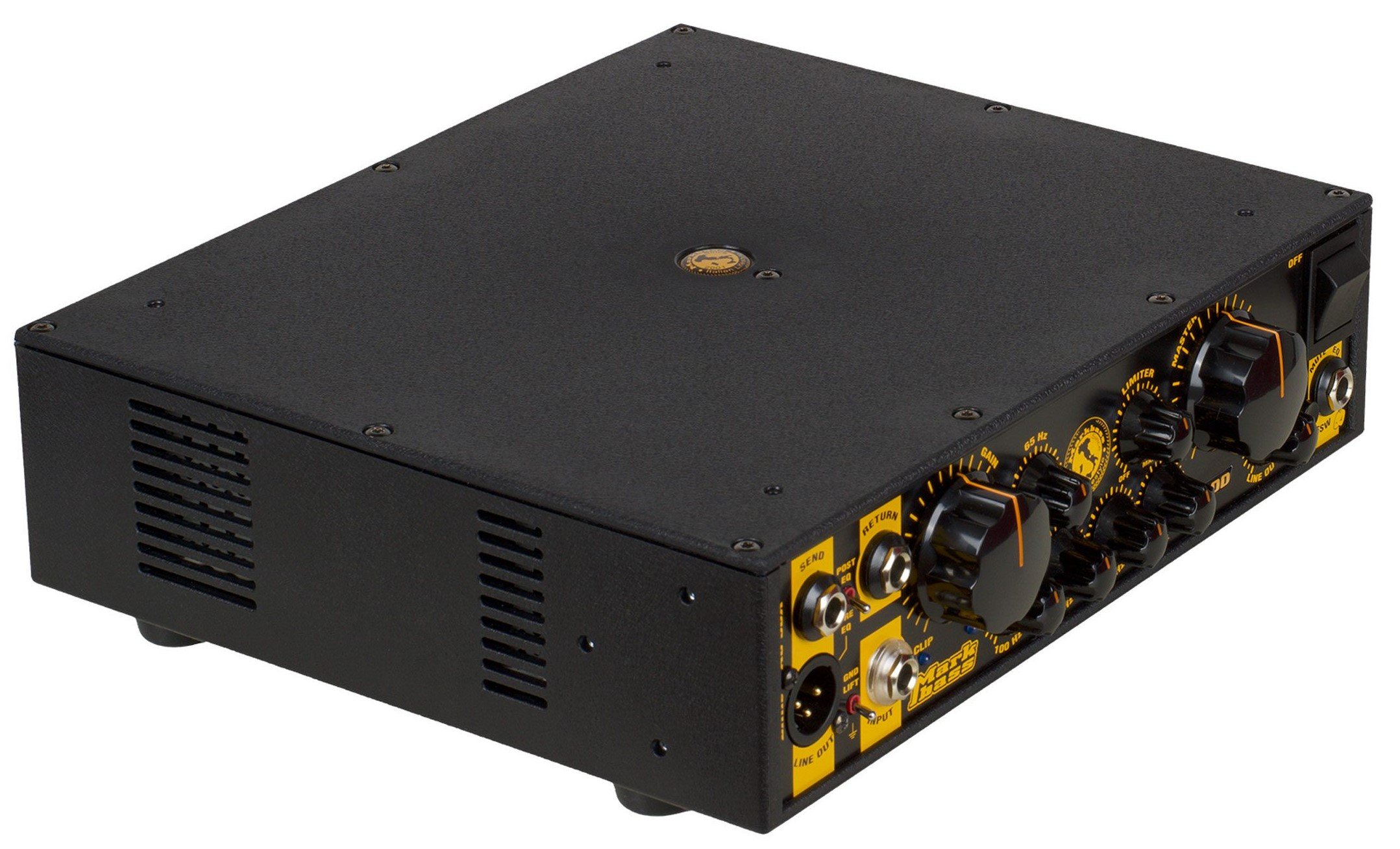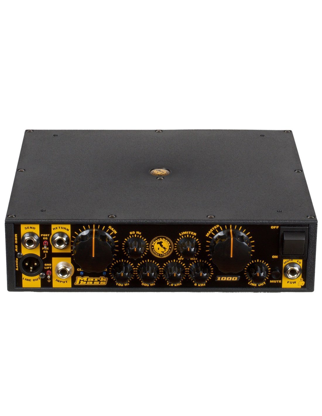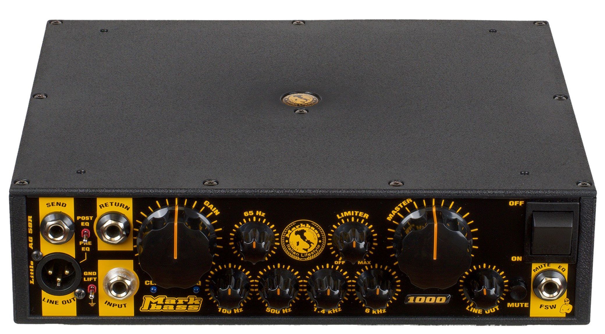 MARK BASS LITTLE AG1000 58R ist ein Verstärker für Bass, Modell Little AG 1000 58r Andrew Gouchè Signature, mit 500W Leistung bei 4 Ohm oder 330 W bei 8 Ohm. Die technischen Merkmale umfassen einen proprietären MPT Transistorverstärker mit 500W, Gain- und Master-Regler auf großen Encodern, integrierten Equalizer mit UltraLow (Frequenz 65Hz), Low (Frequenz 100Hz), Mid (Frequenz 500Hz), Hi Mid (Frequenz 1,4 kHz), High (Frequenz 6 kHz), integrierten Zweiband-Limiter, Lautstärkeregler für Line Out, Mute-Taste. Außerdem sind alle Anschlüsse auf der Vorderseite vorhanden, darunter Input, FX send/return, symmetrischer Line Out über XLR-Anschluss mit Schalter für Ground Lift und Pre/post EQ, Fußschalteranschluss (optional) über Klinke für Eq On/Off und Mute sowie Speaker Out über Klinke oder Speakon-Anschluss auf der Rückseite.
