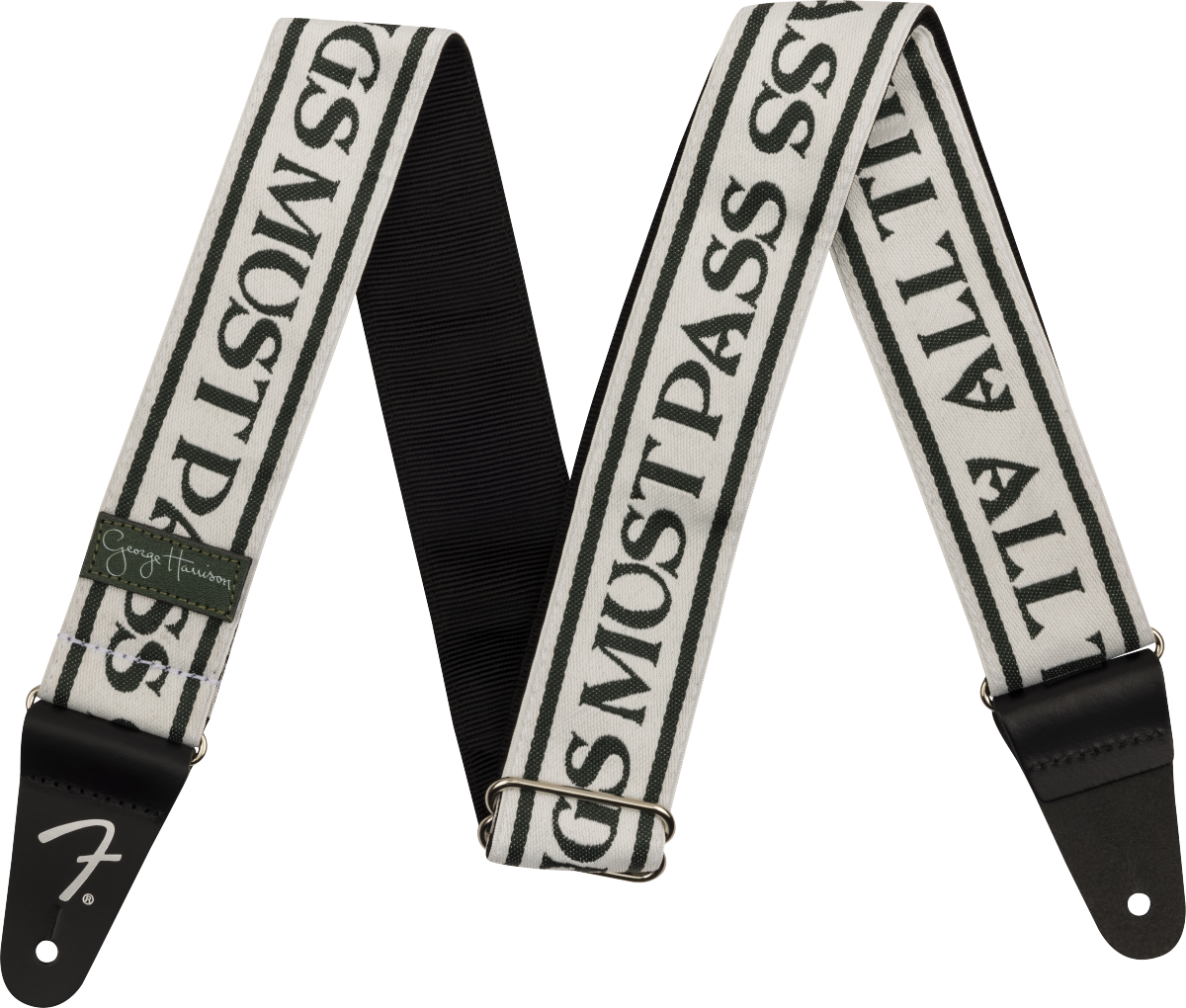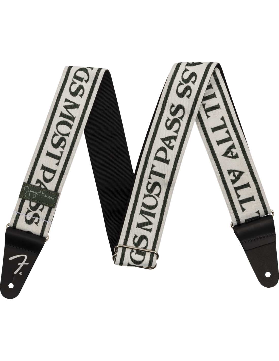Tracolla Fender George Harrison All Things Must Pass Logo Strap. Die Fender George Harrison All Things Must Pass Logo Strap ist ein Jacquard-Gurt aus Baumwolle und Polyester, mit Lederenden, der das Logo des Albums All Things Must Pass von George Harrison zeigt, mit schwarzen Buchstaben auf weißem Hintergrund. Verstellbar zwischen 86 und 150 cm. Breite 5 cm.