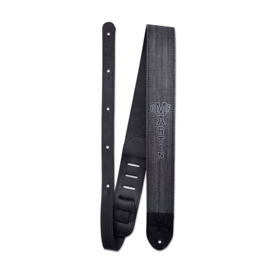 Die 18A0116 ist der umkehrbare Schultergurt von Martin & Co, hergestellt aus schwarzem Denim auf einer Seite und schwarzem Leder auf der anderen. Der Schultergurt erreicht eine maximale Länge von 139,7 cm, trägt das C.F.M.-Logo auf beiden Seiten und ist mit einem integrierten Plektrumhalter ausgestattet.