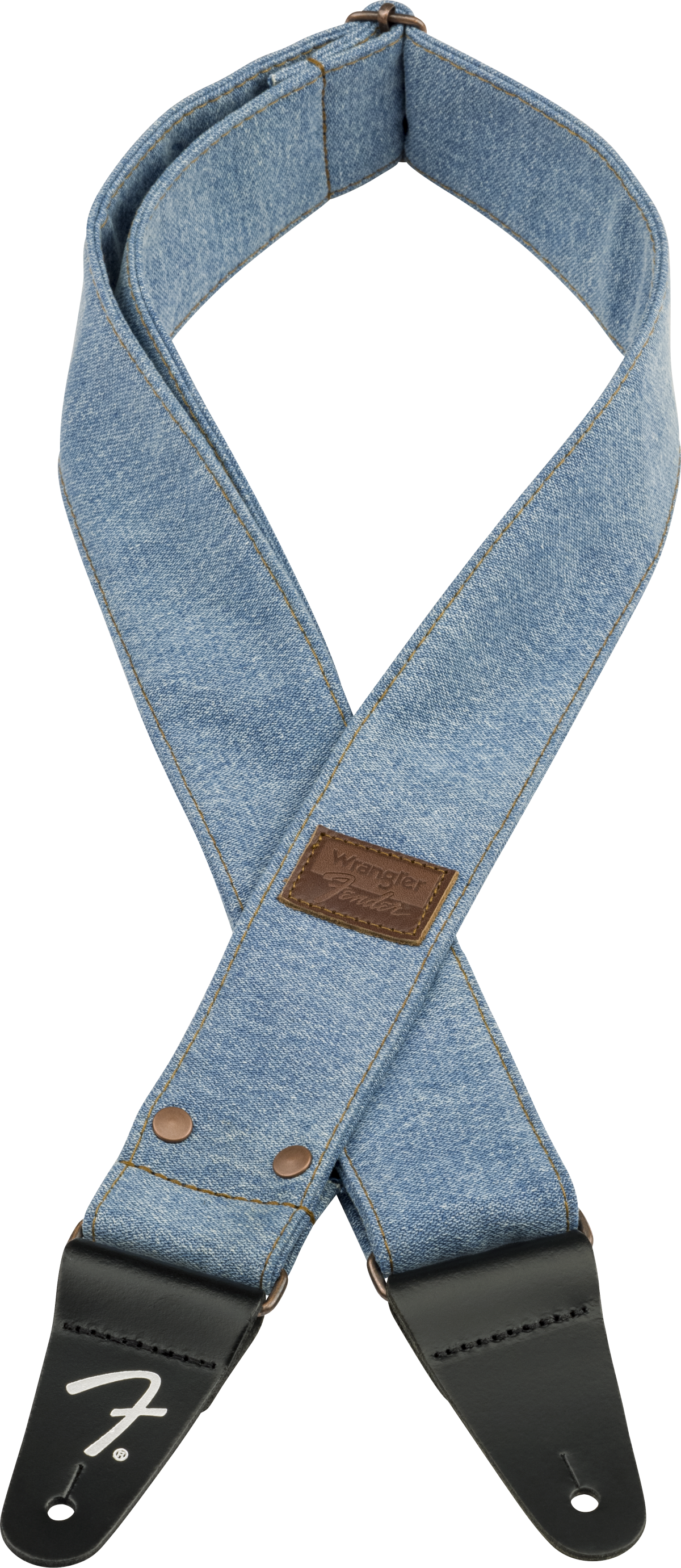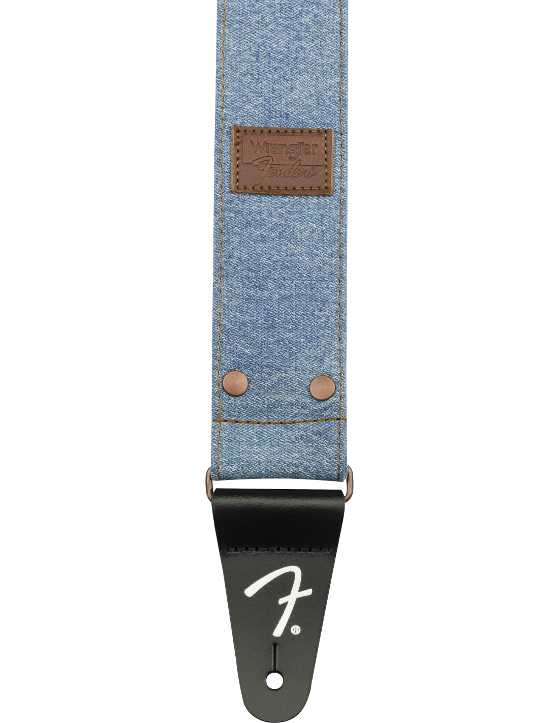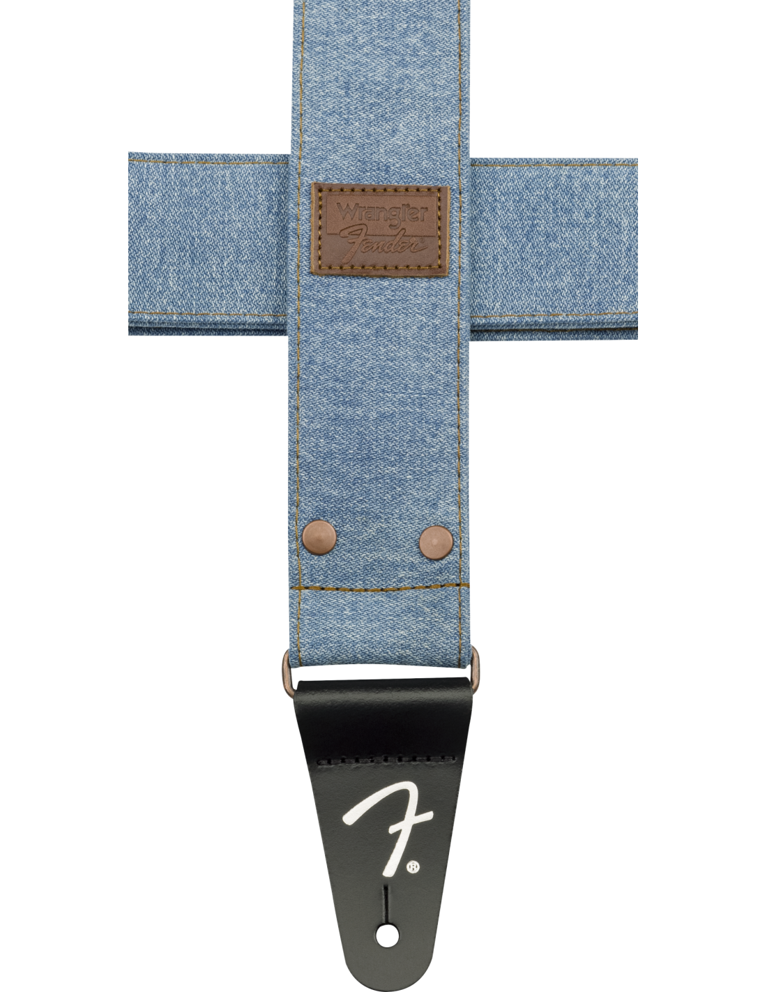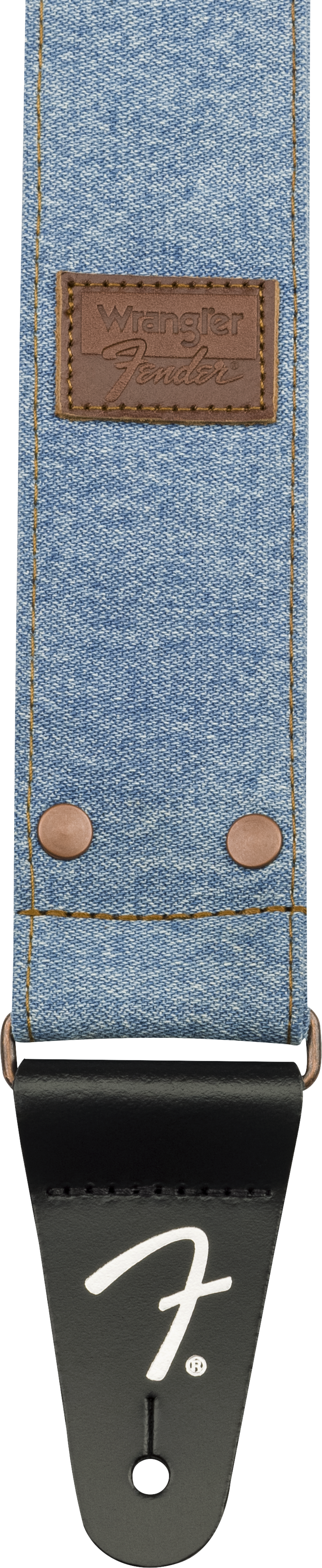 FENDER STRAP X WRANGLER WASHED LIGHT INDIGO ist ein Schultergurt aus Denim-Stoff, der in Zusammenarbeit mit Wrangler hergestellt wurde, mit einer verstellbaren Länge von 99 bis 147 cm, einer Breite von 5 cm, Kupfernieten und einer Kupferverstellschließe