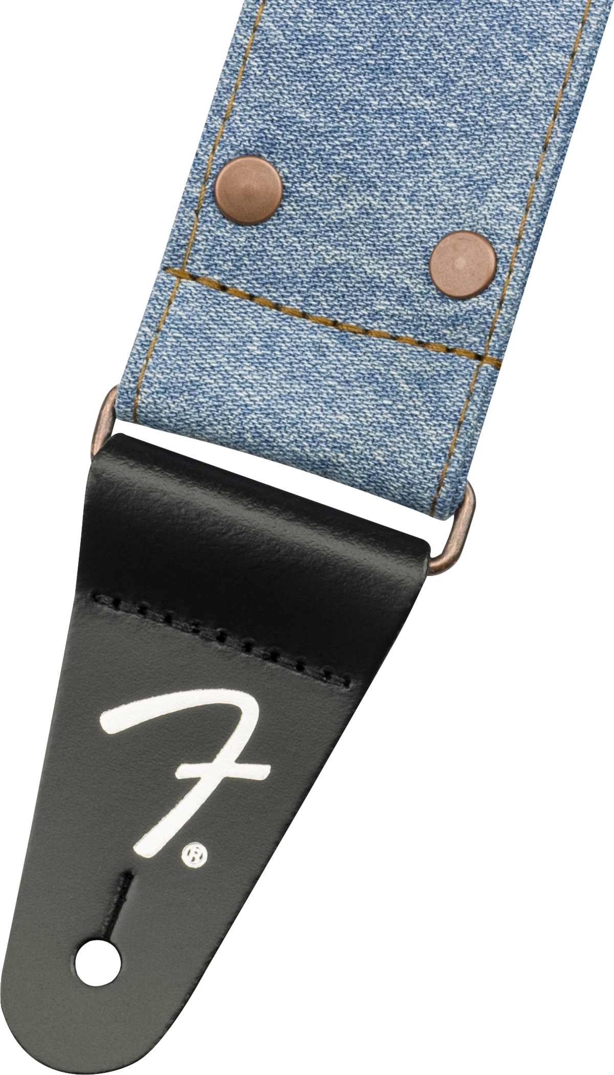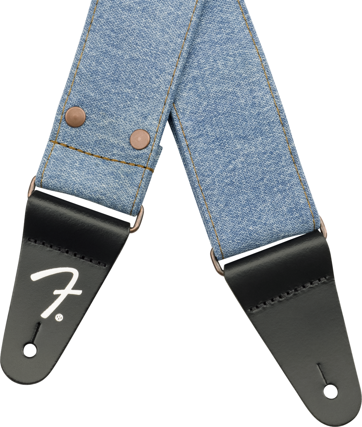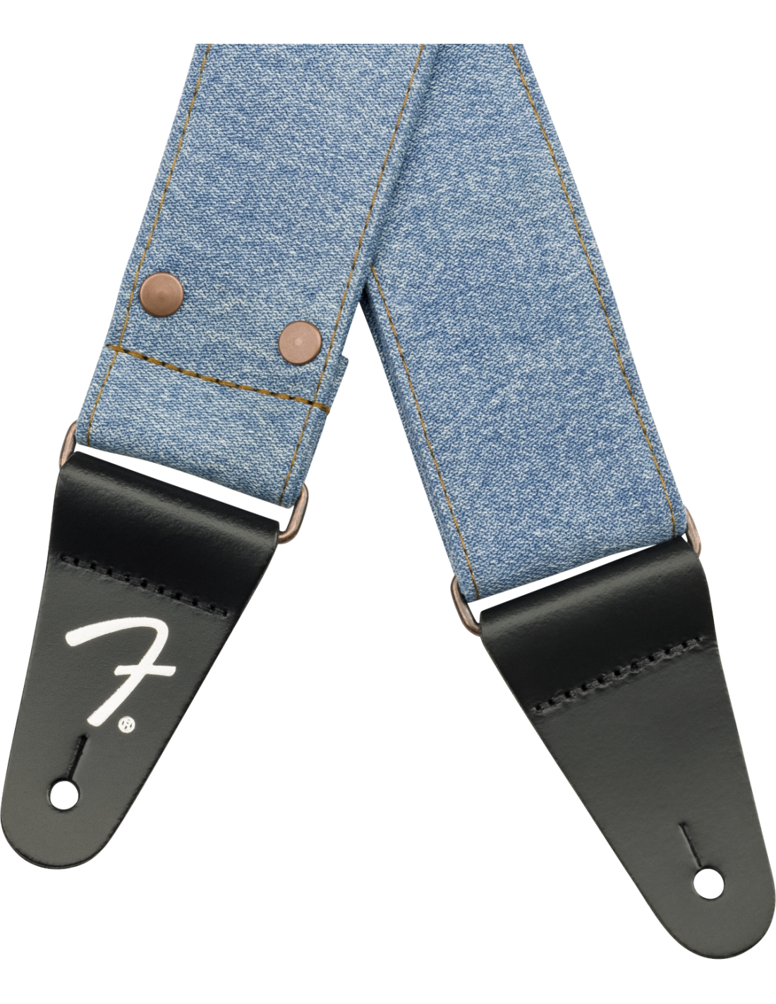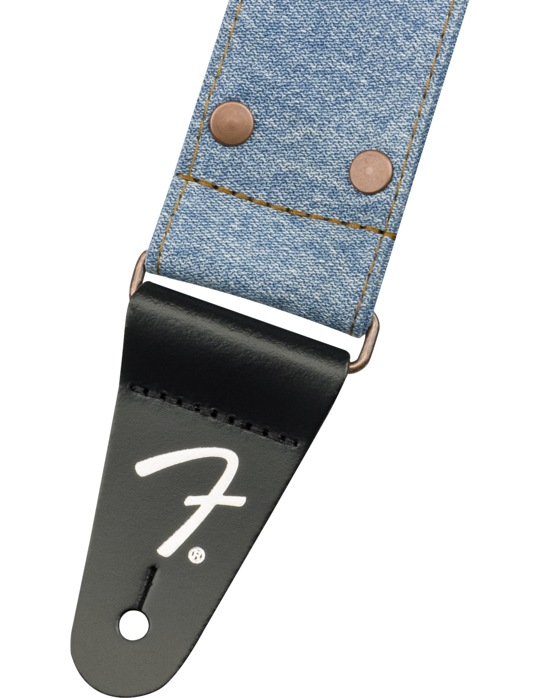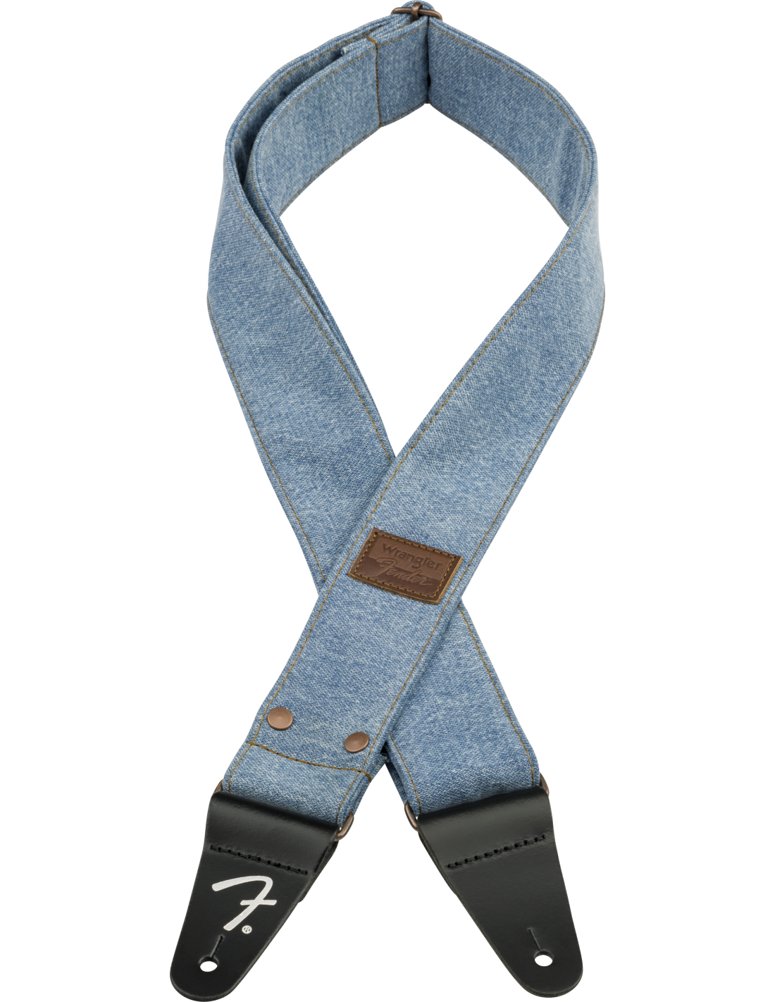 FENDER STRAP X WRANGLER WASHED LIGHT INDIGO ist ein Schultergurt aus Denim-Stoff, der in Zusammenarbeit mit Wrangler hergestellt wurde, mit einer verstellbaren Länge von 99 bis 147 cm, einer Breite von 5 cm, Kupfernieten und einer Kupferverstellschließe