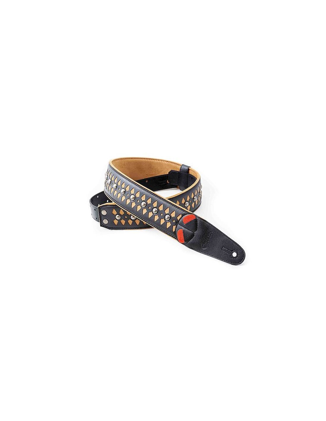 Handgefertigte Umhängetasche aus umweltfreundlichen, hochmodernen Materialien, die tierische Stoffe ausschließen, mit sorgfältig ausgearbeiteten Details, gekennzeichnet durch mittelalterliche Verzierungen und Metallnieten, hochdichte Latexpolsterung (5 mm), RAS-Regulierungssystem, integrierter Plektrumhalter. Farbe schwarz und beige, Breite 6 cm, von 100 cm bis 150 cm verstellbare Länge, ultraleicht. Geeignet für Gitarre und Bass.